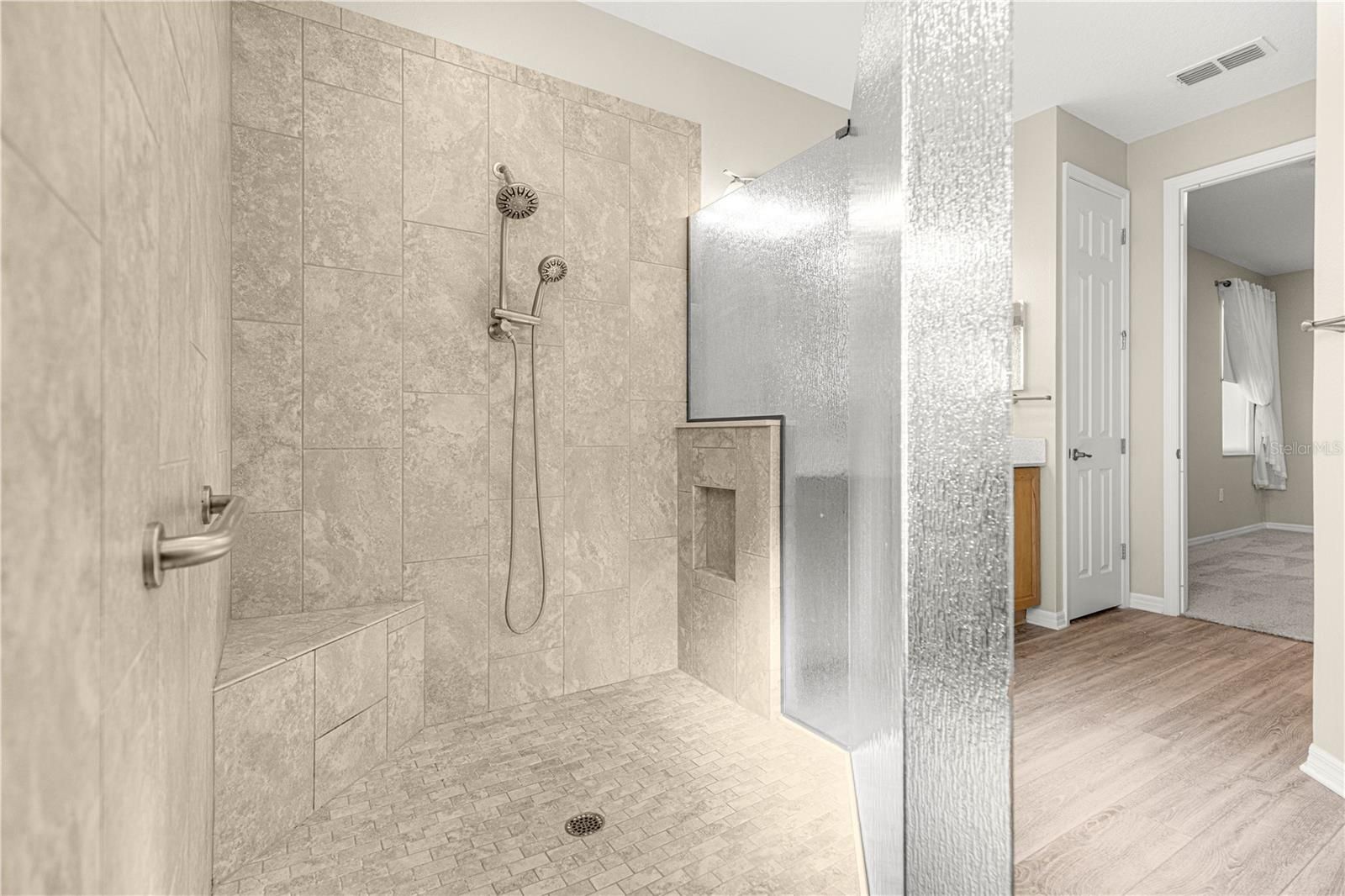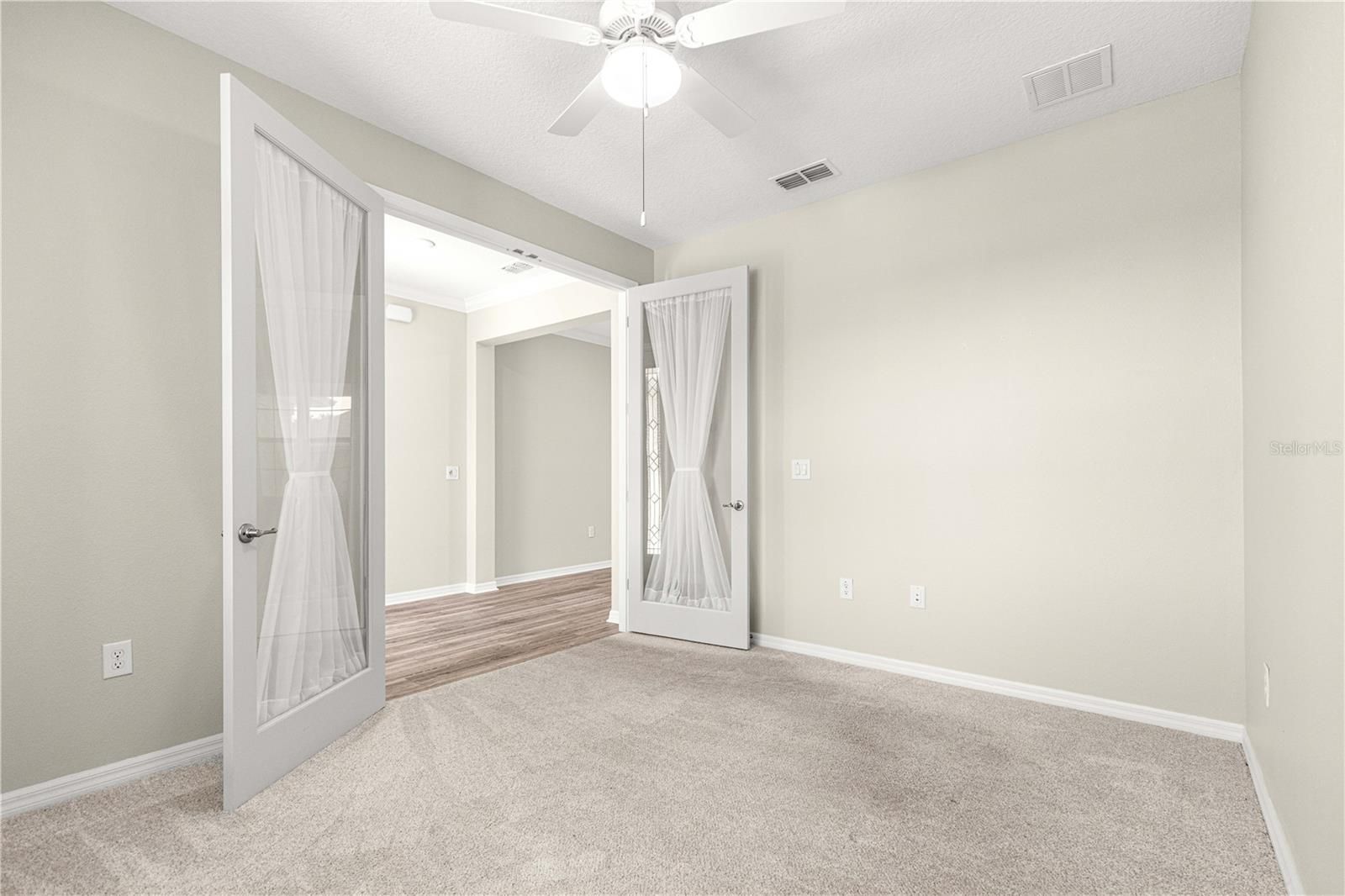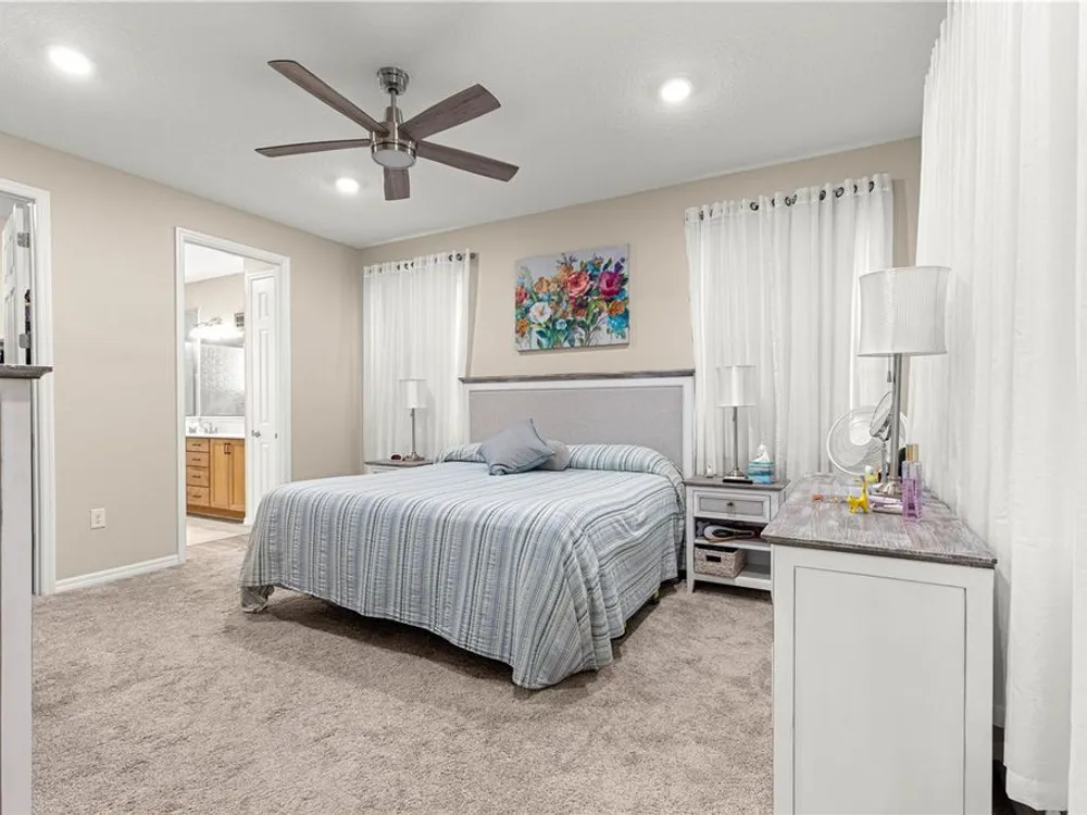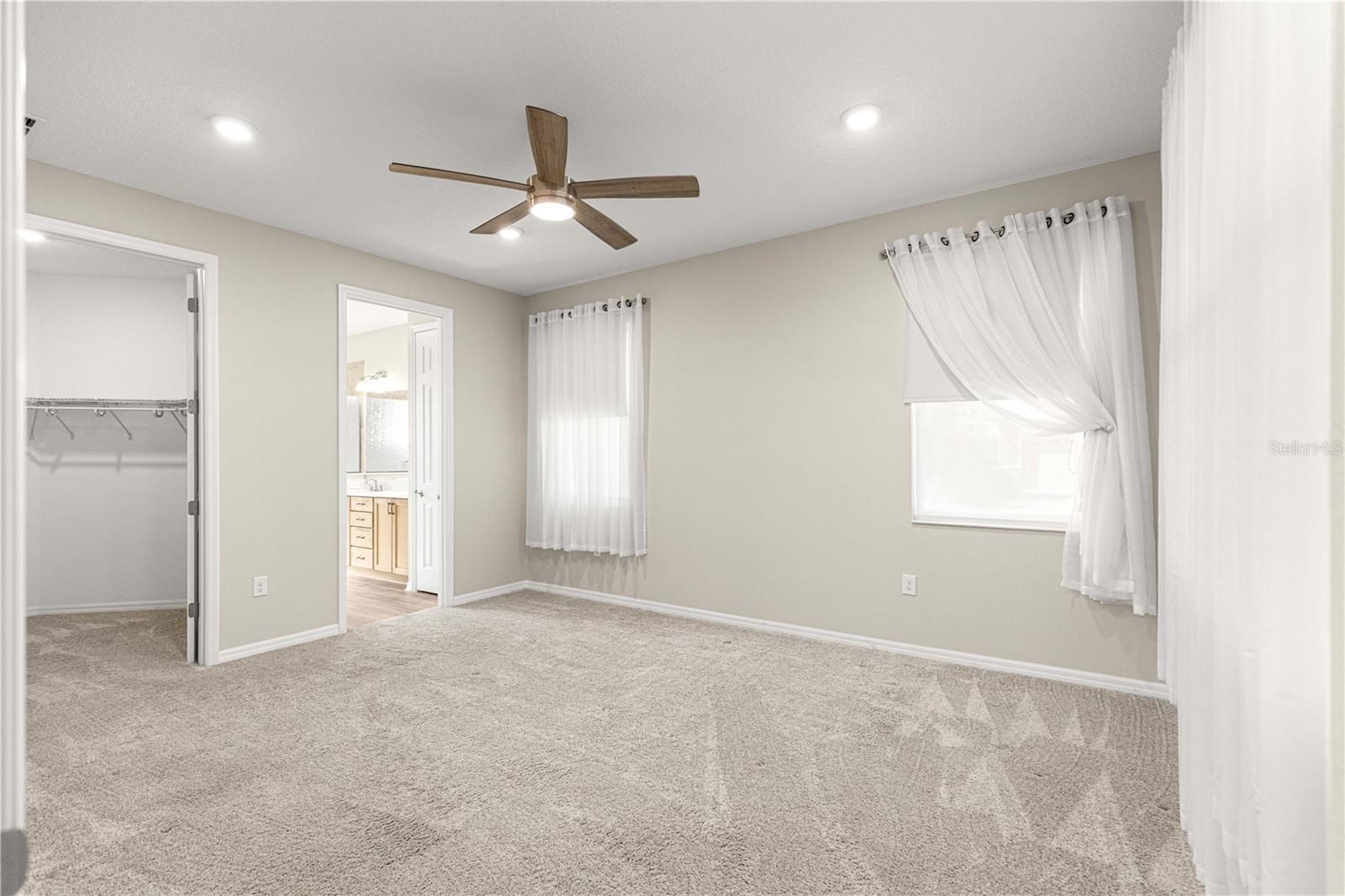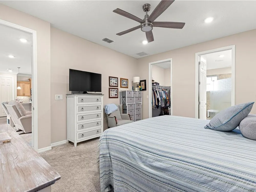 - Ceiling Fan(s), Crown Molding, Eat-in Kitchen, High Ceilings, Kitchen/Family Room Combo, Open Floorplan, Main Level Primary, Solid Surface Counters, Thermostat, Walk-In Closet(s)