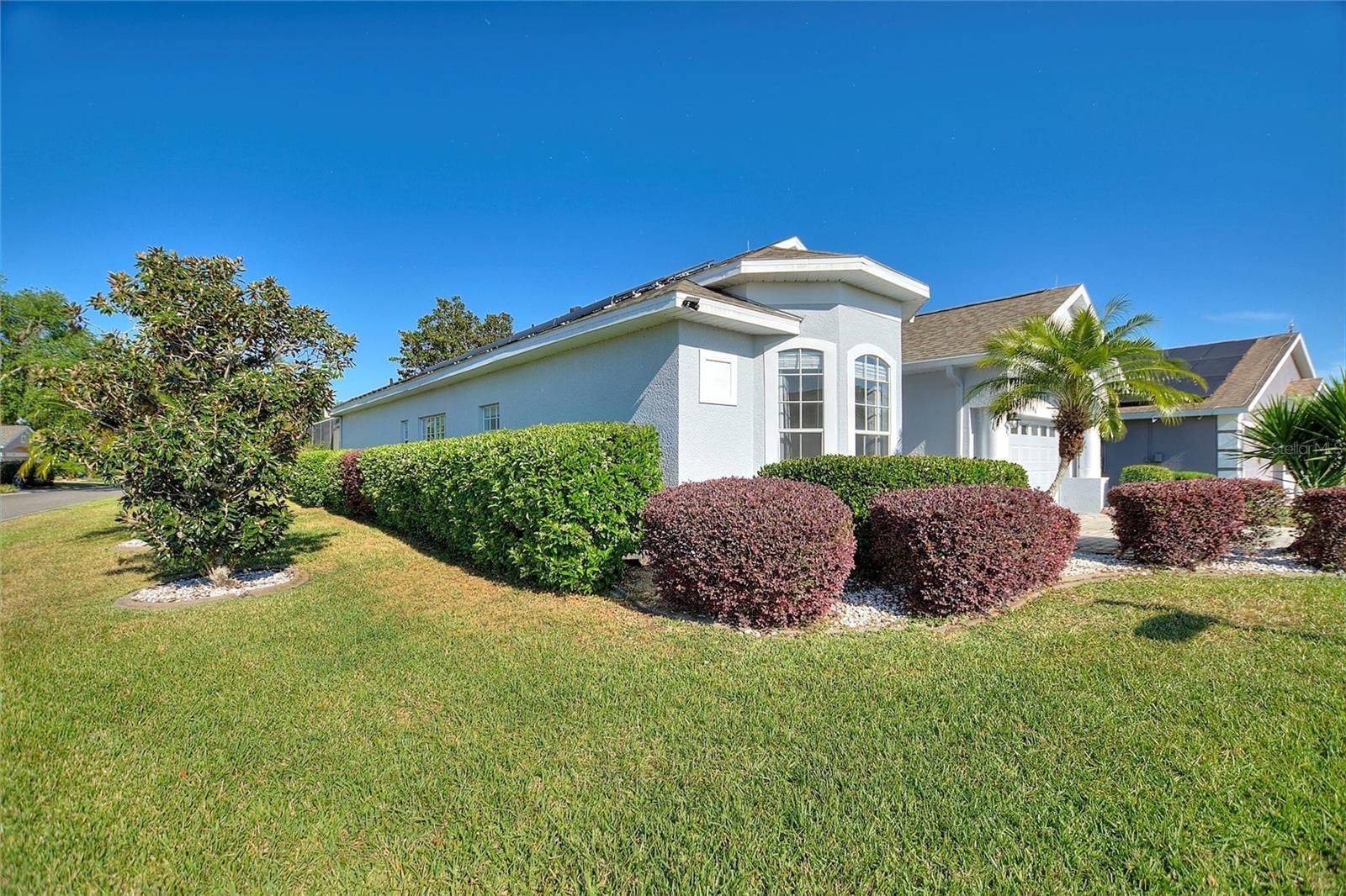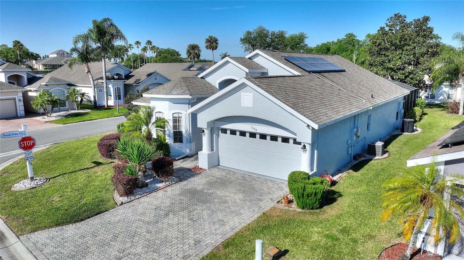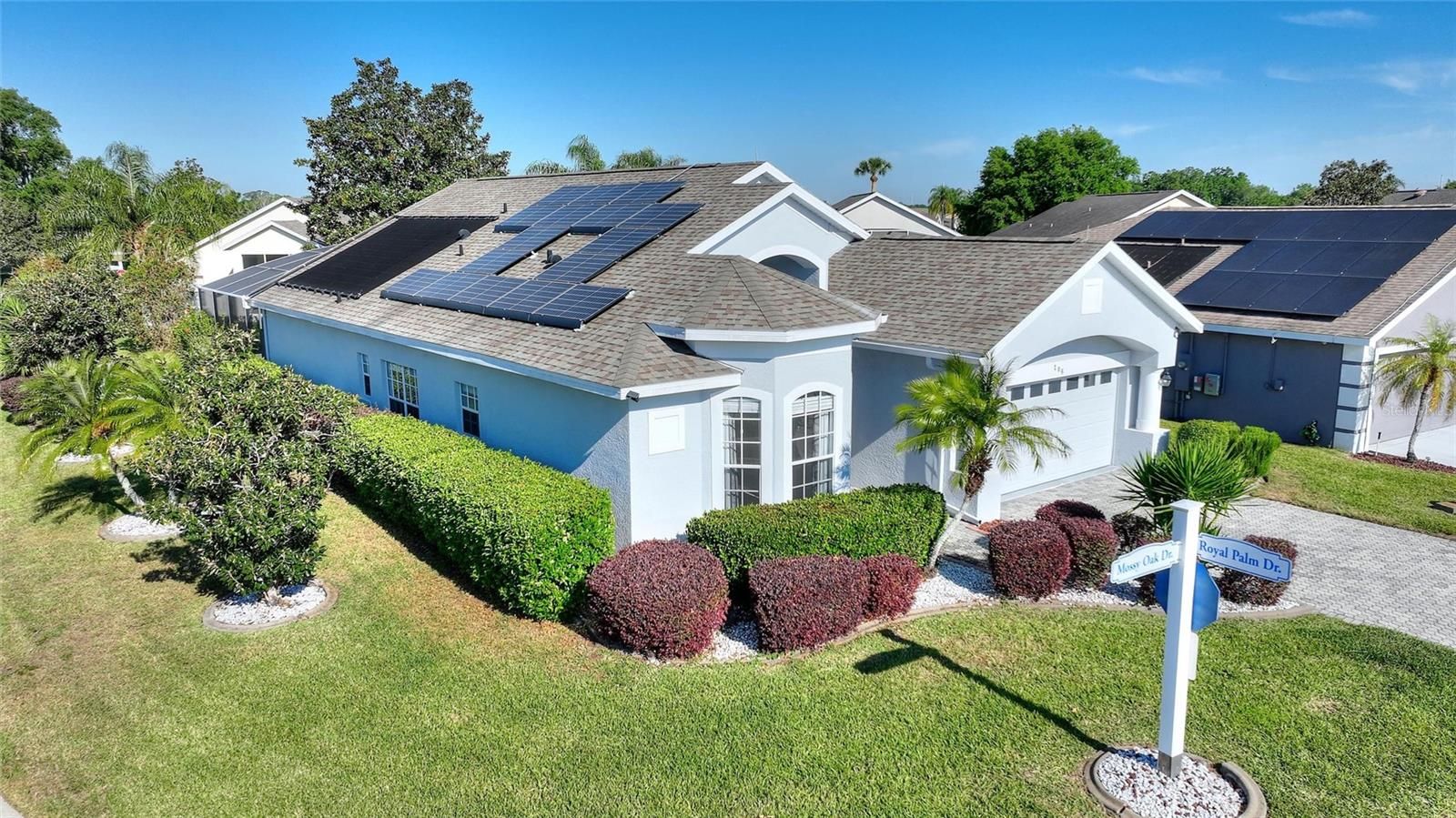 One or more photo(s) has been virtually staged. RidgeDale 3/2 with preferred bay window elevation, private pool, SunRun solar panels for low monthly electric bills, tile floors and an extended garage on a corner lot in High Vista’s active 55+ community. Current owner’s last 14-month average monthly electric bill was $86. Bright open central great room has 12 FT ceilings and a wall of patio doors leading to a nearly 1100 SF west-facing screened lanai and pool. Eat-in kitchen has Corian counters, breakfast bar & built-in desk, Bosch dishwasher, stainless-steel refrigerator & range, pantry and storage closet. Cathedral ceiling in primary bedroom with full private bath, linen closet, double sink vanity and 6x6 walk-in closet. Split bedroom design offers a cozy guest area with adjacent full bath and linen closet between guest rooms. Corridor garage-access laundry room with washer & dryer has storage closet and utility sink. Garage has pull-down ladder access to attic, opener with keypad entry and extra refrigerator. Current owner replaced water heater in 2025, painted exterior and interior in 2022, replaced window blinds, ceiling fans & lighting and installed full-view front storm door with integrated rolling screen. Prior owner replaced pool heater in 2019 and roof in 2018. Solar panels are leased; buyer must apply for SunRun credit approval and sign transfer of Sunrun Solar Service Agreement. Sold As-Is. Ridgewood Lakes is a golf cart friendly community. $230 monthly High Vista HOA fee includes Spectrum internet and basic cable TV with 2 cable boxes, lawn mowing and exclusive access to resident-owned 12,000 SF private clubhouse and amenities. $425 semi-annual Ridgewood Lakes HOA fee provides 24x7 staffed security gate and master association-owned private road maintenance. Adjacent to 18-hole White Heron Golf Club with restaurant, privately owned and open to the public. High Vista is a 55+ community with outdoor heated pool and spa, fitness center, library, pub & many organized activities. Pickle ball, tennis, bocce and shuffleboard courts. Miles of biking and walking trails within Ridgewood Lakes gated community. Shopping, Disney, Universal, Orlando & Central FL entertainment nearby, easy access to I-4, medical facilities, airports & Sunrail Station. Advent Health hospital is 3 miles away.