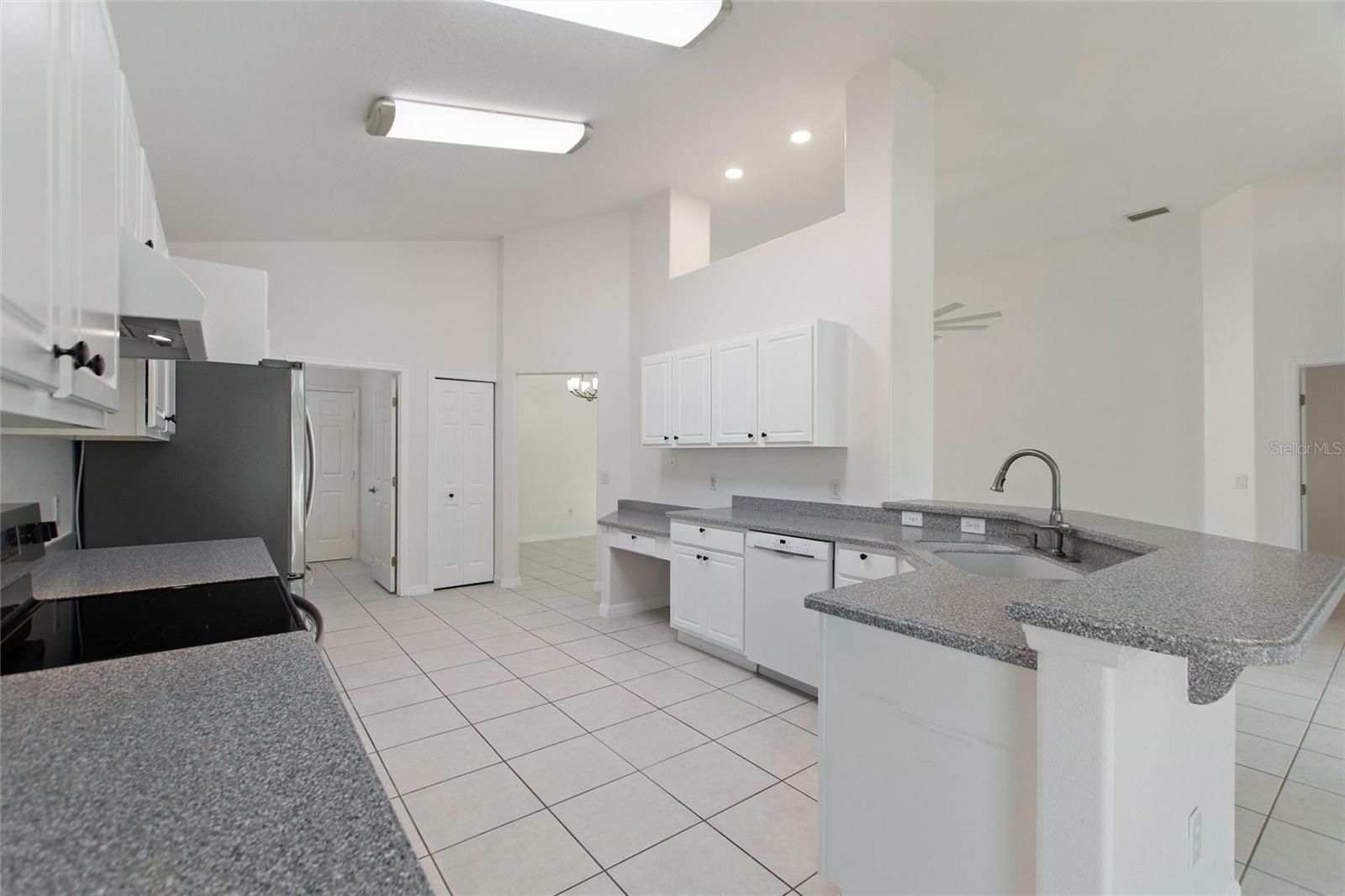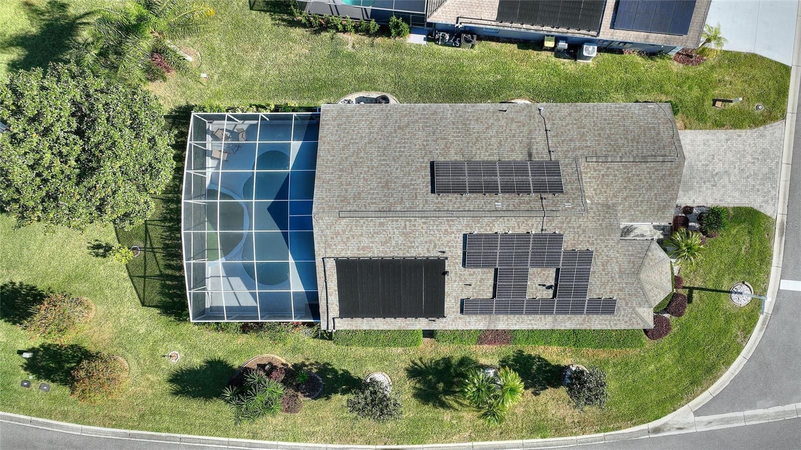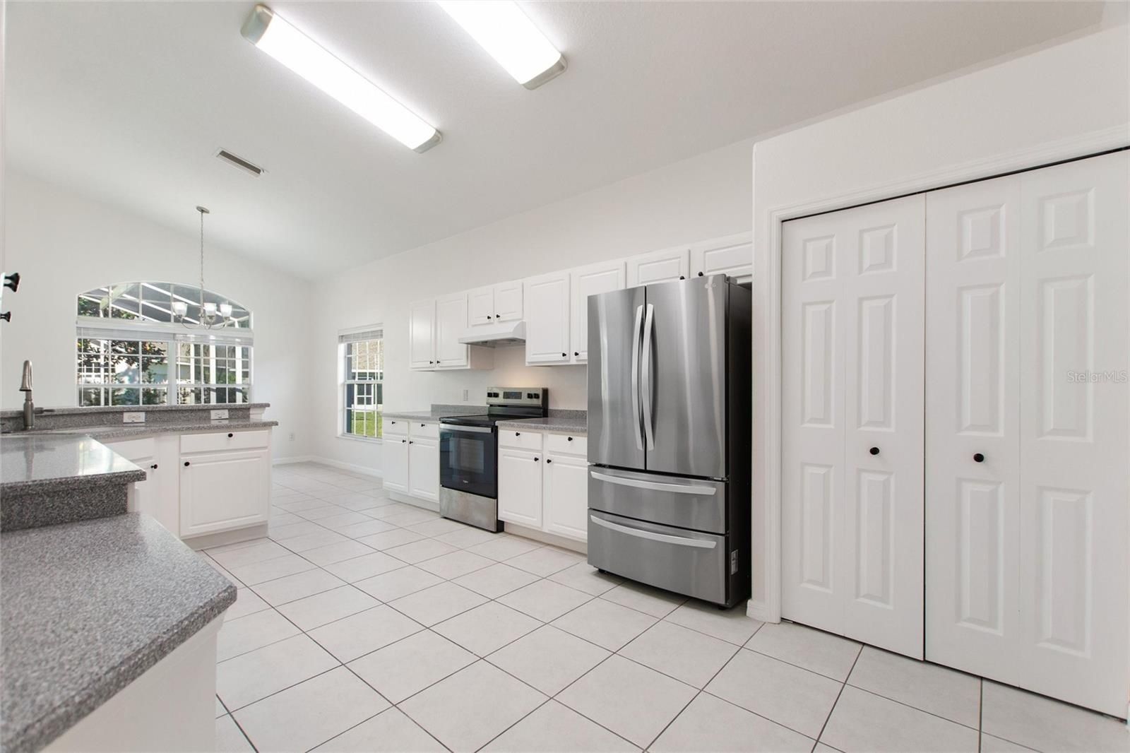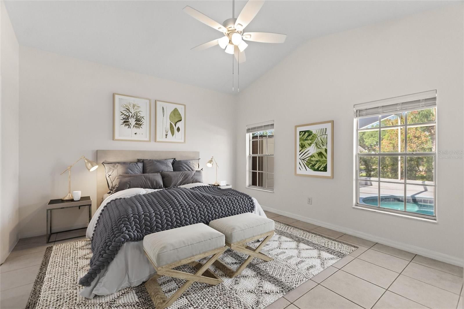 One or more photo(s) has been virtually staged. RidgeDale 3/2 with preferred bay window elevation, private pool, SunRun solar panels for low monthly electric bills, tile floors and an extended garage on a corner lot in High Vista’s active 55+ community. Current owner’s last 14-month average monthly electric bill was $86. Bright open central great room has 12 FT ceilings and a wall of patio doors leading to a nearly 1100 SF west-facing screened lanai and pool. Eat-in kitchen has Corian counters, breakfast bar & built-in desk, Bosch dishwasher, stainless-steel refrigerator & range, pantry and storage closet. Cathedral ceiling in primary bedroom with full private bath, linen closet, double sink vanity and 6x6 walk-in closet. Split bedroom design offers a cozy guest area with adjacent full bath and linen closet between guest rooms. Corridor garage-access laundry room with washer & dryer has storage closet and utility sink. Garage has pull-down ladder access to attic, opener with keypad entry and extra refrigerator. Current owner replaced water heater in 2025, painted exterior and interior in 2022, replaced window blinds, ceiling fans & lighting and installed full-view front storm door with integrated rolling screen. Prior owner replaced pool heater in 2019 and roof in 2018. Solar panels are leased; buyer must apply for SunRun credit approval and sign transfer of Sunrun Solar Service Agreement. Sold As-Is. Ridgewood Lakes is a golf cart friendly community. $230 monthly High Vista HOA fee includes Spectrum internet and basic cable TV with 2 cable boxes, lawn mowing and exclusive access to resident-owned 12,000 SF private clubhouse and amenities. $425 semi-annual Ridgewood Lakes HOA fee provides 24x7 staffed security gate and master association-owned private road maintenance. Adjacent to 18-hole White Heron Golf Club with restaurant, privately owned and open to the public. High Vista is a 55+ community with outdoor heated pool and spa, fitness center, library, pub & many organized activities. Pickle ball, tennis, bocce and shuffleboard courts. Miles of biking and walking trails within Ridgewood Lakes gated community. Shopping, Disney, Universal, Orlando & Central FL entertainment nearby, easy access to I-4, medical facilities, airports & Sunrail Station. Advent Health hospital is 3 miles away.