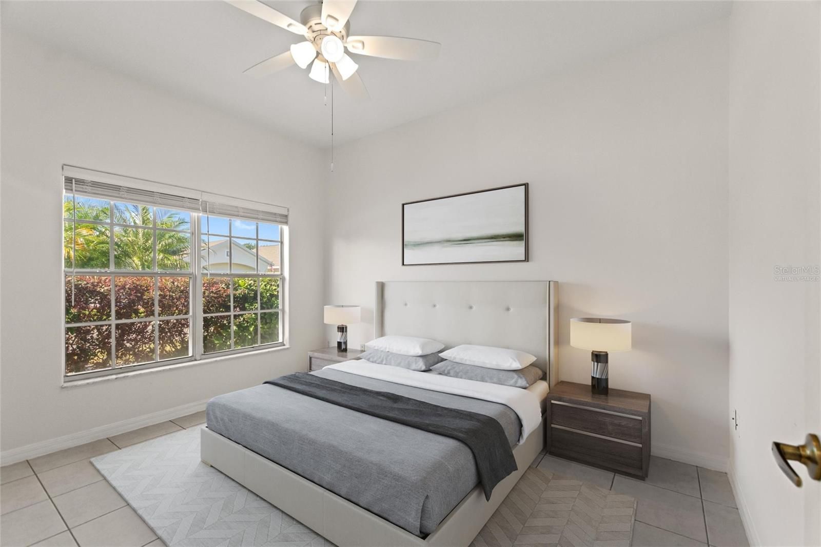 - Ceiling Fan(s), Eat-in Kitchen, High Ceilings, Main Level Primary, Solid Surface Counters, Split Bedrooms, Thermostat, Walk-In Closet(s), Window Treatments