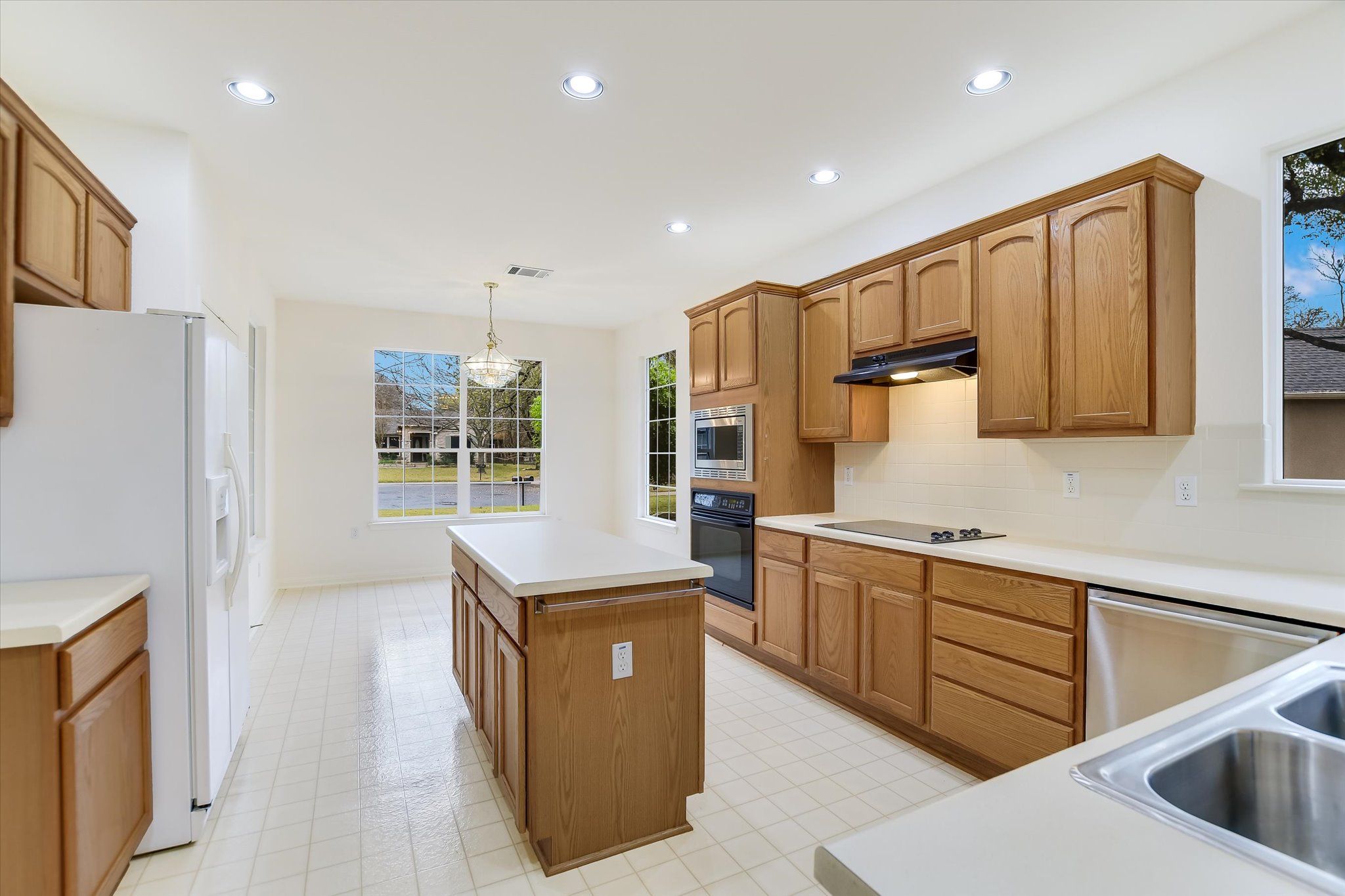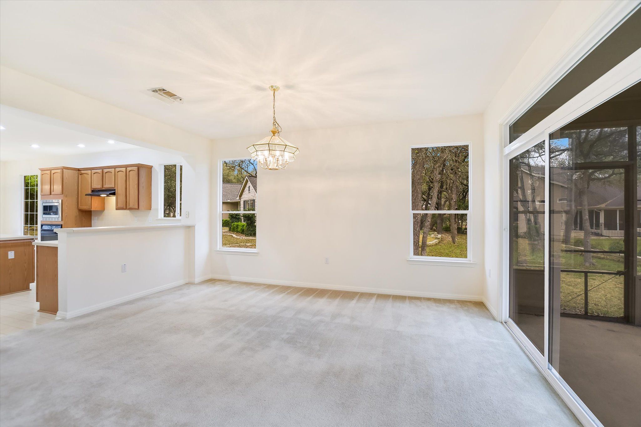 Located in one of Sun City’s most desirable areas, this Williamson (Trinity) floor plan sits on a quiet cul-de-sac in popular Neighborhood 11, just minutes from the Village Center, golf, fitness facilities, and community activities. This step-free, single-story home offers 1,934 square feet, 3 bedrooms, 2 bathrooms, and multiple dining areas, designed for comfortable everyday living and entertaining. An inviting front porch and eight-foot entry door welcome you into a bright, open great room with high ceilings and abundant wall space. The spacious island kitchen, the hallmark of this popular floor plan, features plentiful cabinetry, generous counter space, a pantry, and a breakfast bar that opens to the main living area. A bay-window breakfast nook overlooks the landscaped cul-de-sac setting. At the back of the home, the primary suite features a bay-window sitting area, a large walk-in closet, and an ensuite bath with dual vanities, a garden tub, and a separate shower. Two extra bedrooms offer space for guests, hobbies, or a home office. One of the home’s most enjoyable features is the screened porch, overlooking mature trees and a peaceful park-like setting created by the convergence of neighboring yards — a rare and tranquil outdoor space. Additional highlights include: an extended two-car garage with a workshop area and separate A/C; a laundry room with a sink and a gas dryer hookup; mature trees and a landscaped lot; and a location close to golf, shopping, and the Village Center. This one-owner Sun City home offers solid construction, a highly desirable floor plan, and an exceptional location, ready for the next owner to make it their own. Come experience the lifestyle that makes Sun City Georgetown one of Texas’ premier active adult communities.