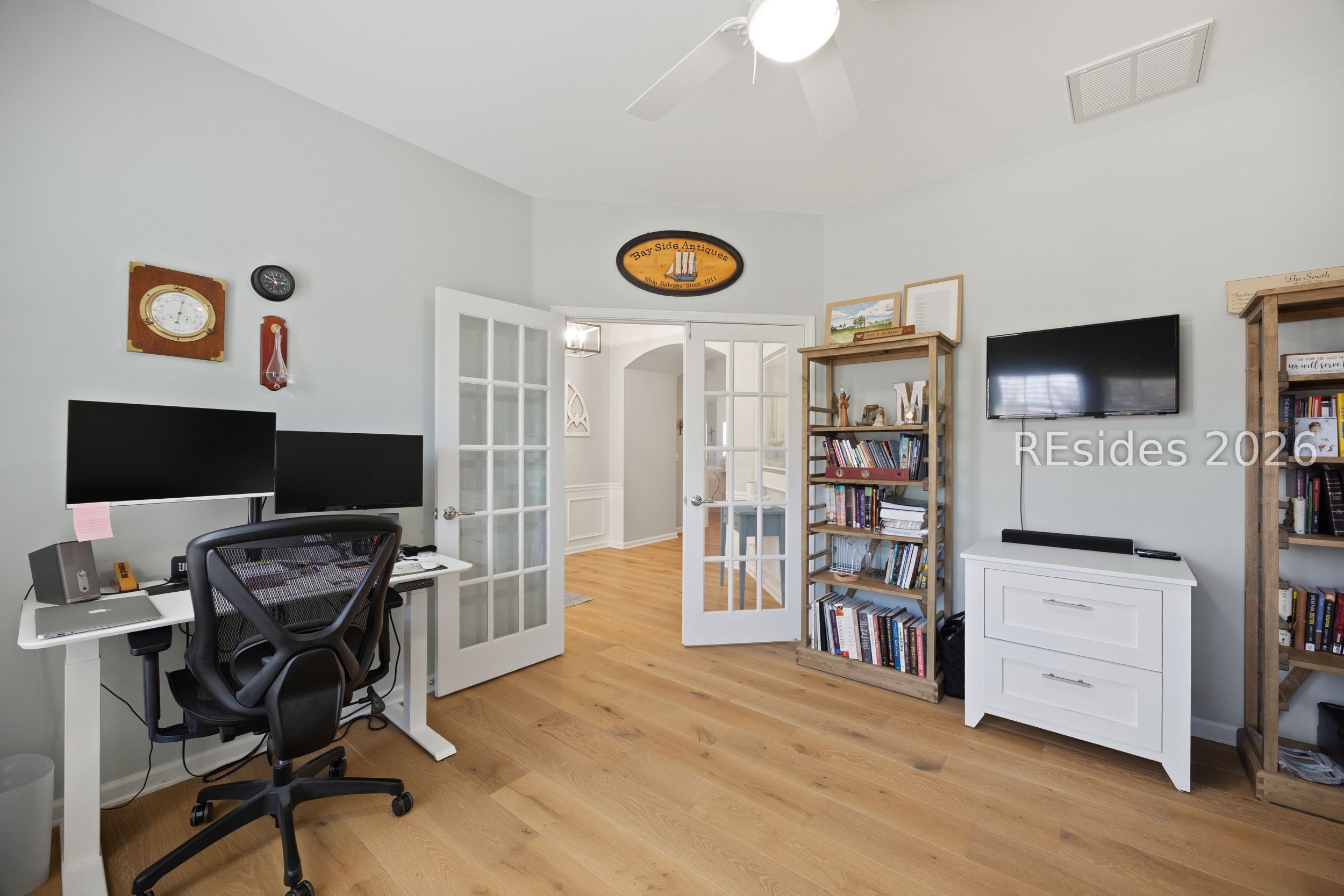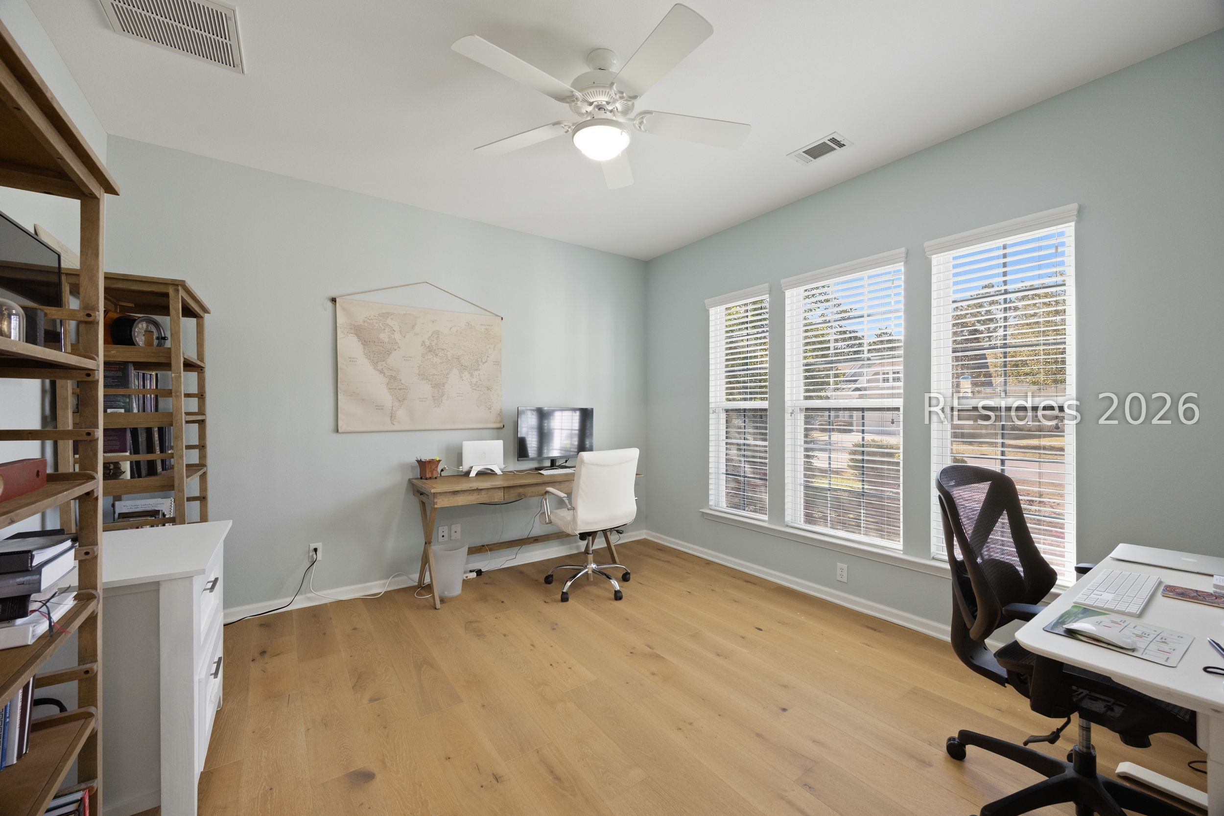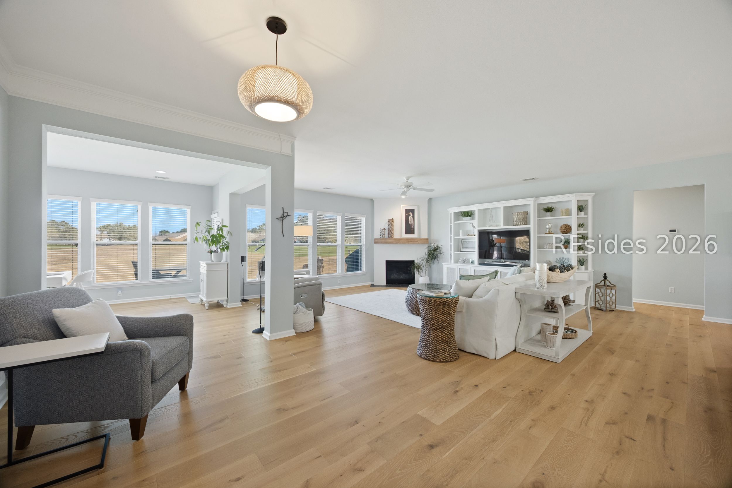 Breathtaking golf and lagoon views set the stage for this light-filled Cumberland Hall on Sun City's coveted north side. From the moment you arrive, the pebble-coated drive and porch hint at the quality within. Inside, the open kitchen shines with quartz countertops, new stainless appliances, painted cabinetry, gas cooktop, pull-out pantry, and solar tube lighting-flowing effortlessly into the dining area and great room with a modern gas fireplace. The expansive Carolina Room, wrapped in windows, brings the outdoors in and showcases those sweeping views from every main living space.The primary suite offers a tray ceiling, custom closet, and spa-inspired tiled shower with rain head. A French-door OFFICE or den provides privacy and flexibility. Enjoy abundant storage, built-ins, an oversized epoxy-coated garage with attic lift, new patio with electric awning, hurricane shutters, and fresh landscaping. Move-in ready. Unmatched views. Why wait to build when this one already feels like home?