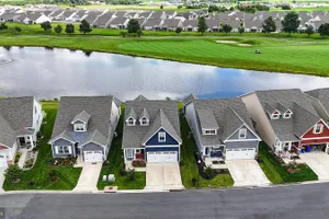 Experience waterfront living at its finest in this stunning, custom featured, three bedroom with a with an additional upper level suite that is sure to please and enhance your lifestyle to fit your needs. The first three bedrooms are conveniently on the first floor, including a primary suite overlooking the water, and the suite, with its own private bath and walk-in closet, enjoys privacy on the second level that you can use as guest quarters, a large office or whatever fits your lifestyle. This charmer is perfectly situated on a tranquil pond in the desirable 55+ community of Heritage Shores. Wake up to breathtaking year-round sunrises from the primary bedroom, back patio, and screened-in porch, and drift off at night to the soothing sounds of the fountain right outside your window. From the front porch, you can enjoy equally captivating sunsets, making every day here a masterpiece. Inside, the home is filled with special architectural touches, including a board-and-batten accent wall in the primary bedroom, shiplap walls in the living room and elegant wainscoting in the foyer. The kitchen boasts beautiful “Tranquility” quartz countertops and luxury stainless steel appliances. The thoughtful layout is complemented by six ceiling fans—each with lights and remotes—located in all three bedrooms, 2nd floor suite, the living room, and the screened-in porch. Throughout the home, you will be thoroughly impressed by the gorgeous luxury vinyl plank floors. The location is simply unbeatable—just over a tenth of a mile to the Sugar Beet, less than two-tenths of a mile to the indoor and outdoor pools and the gym, under three-tenths of a mile to the clubhouse, and about a half-mile to the tennis and pickleball courts. Heritage Shores offers resort-style amenities, including golf, dining, fitness facilities, pools, walking trails, and endless social activities—all just steps from your door. Here, you’re not just buying a home—you’re embracing a lifestyle that blends comfort, beauty, and convenience in one of the community’s very best locations.