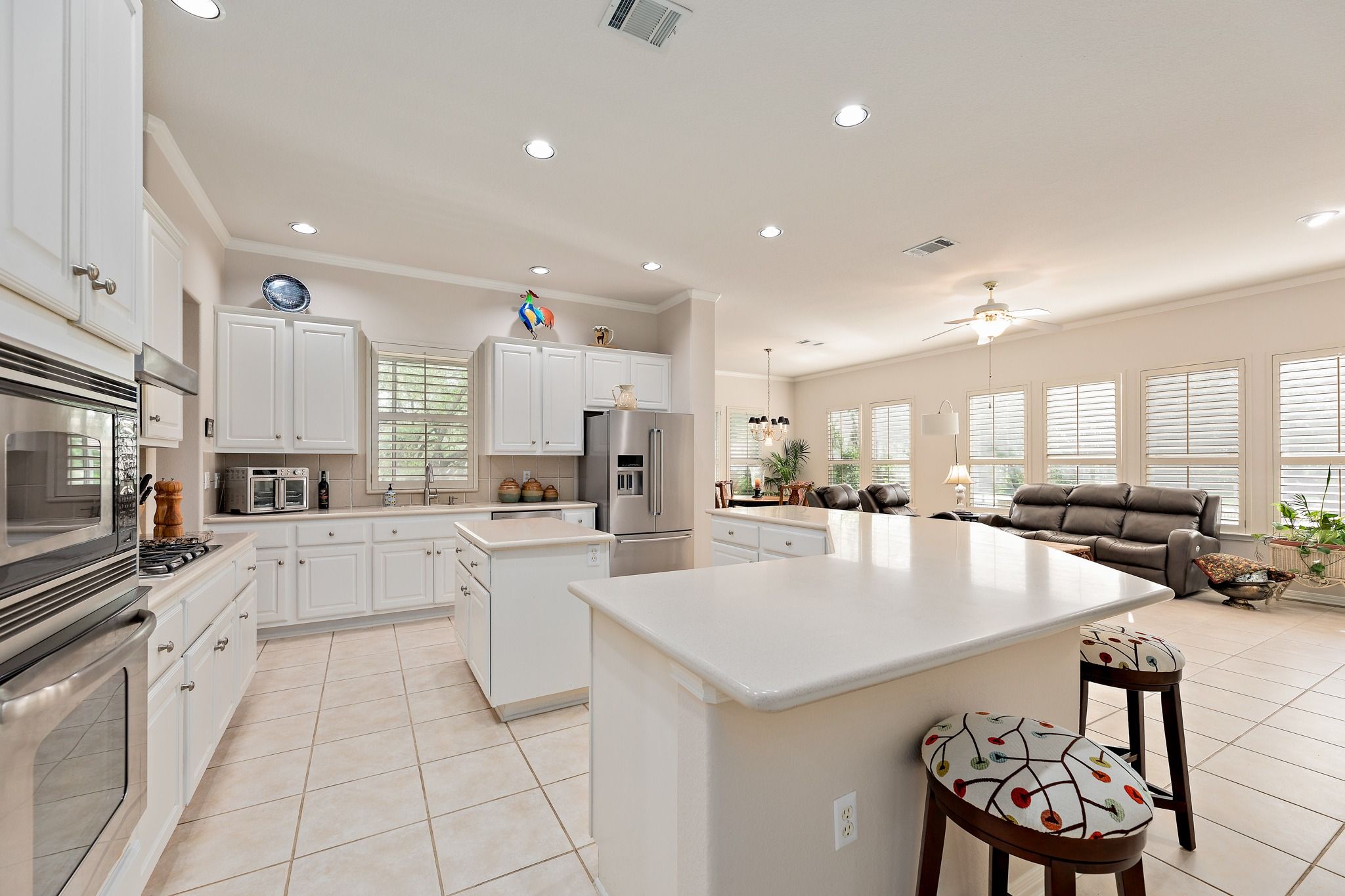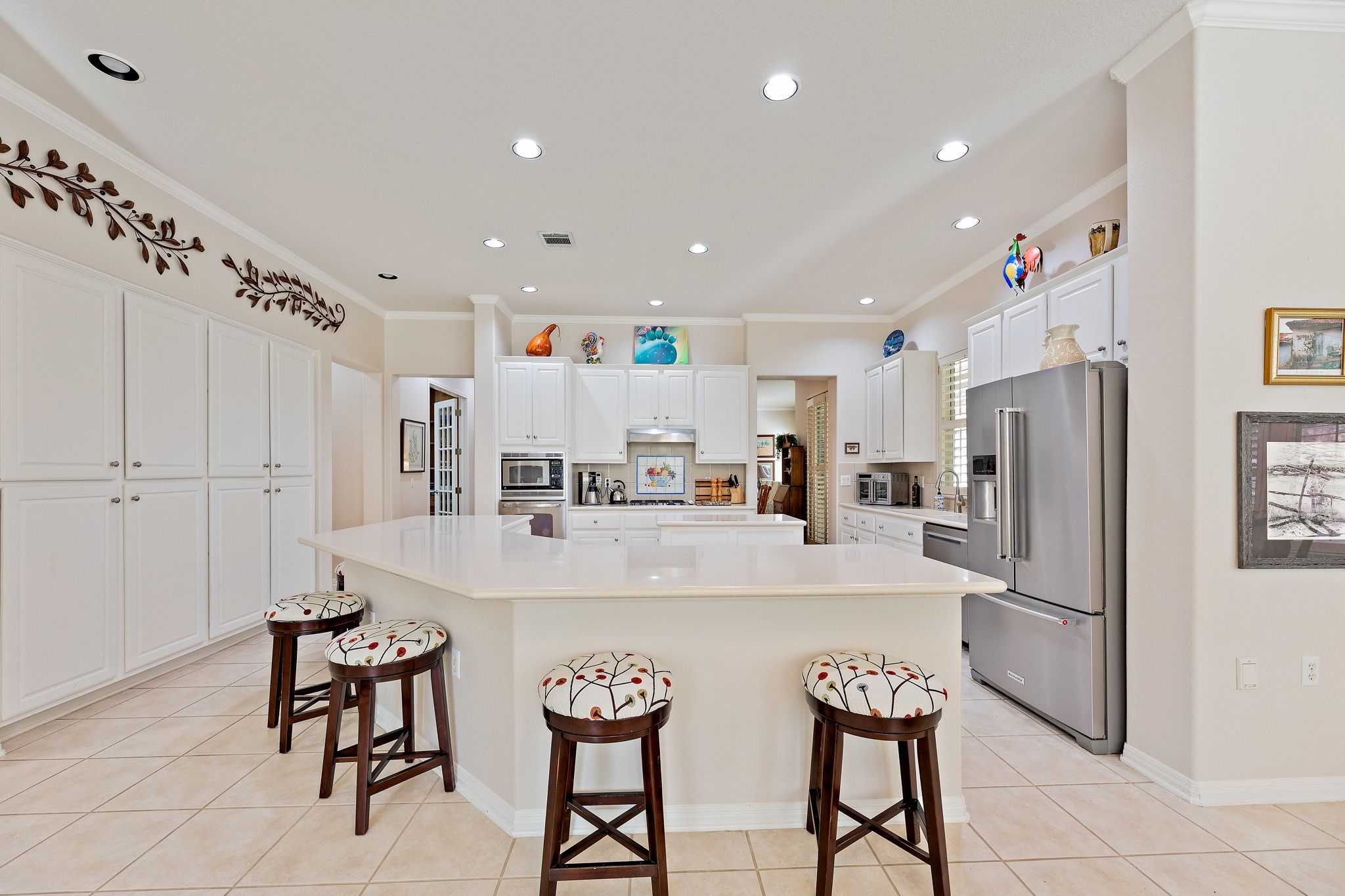 - Bookcases, Built-in Features, Ceiling Fan(s), Chandelier, Crown Molding, Central Vacuum, Dry Bar, Separate/Formal Dining Room, Double Vanity, Entrance Foyer, High Ceilings, Kitchen Island, Multiple Living Areas, Multiple Dining Areas, Main Level Primary, MurphyBed, NoInteriorSteps, Open Floorplan, Storage, Solid Surface Counters, Soaking Tub