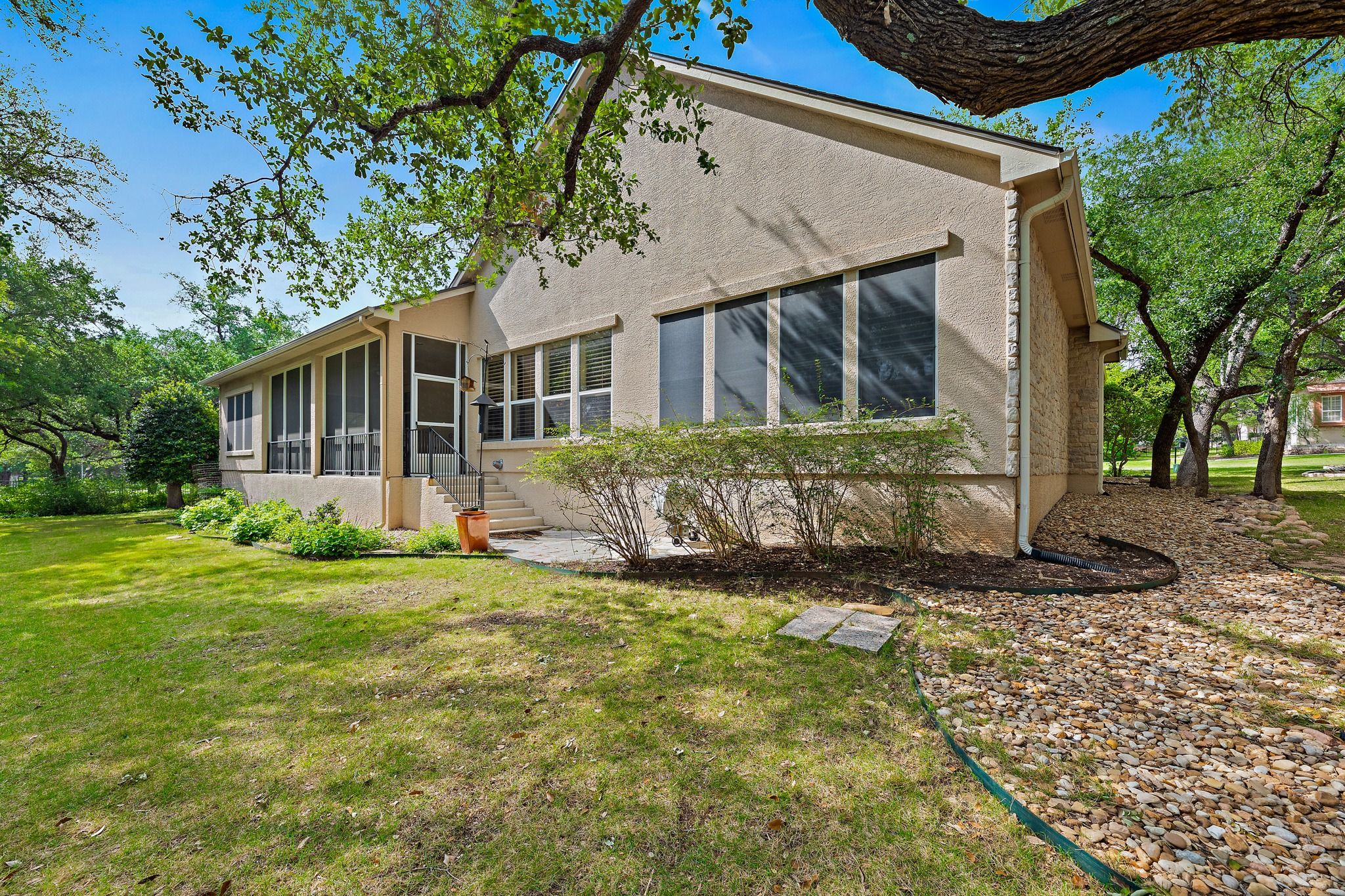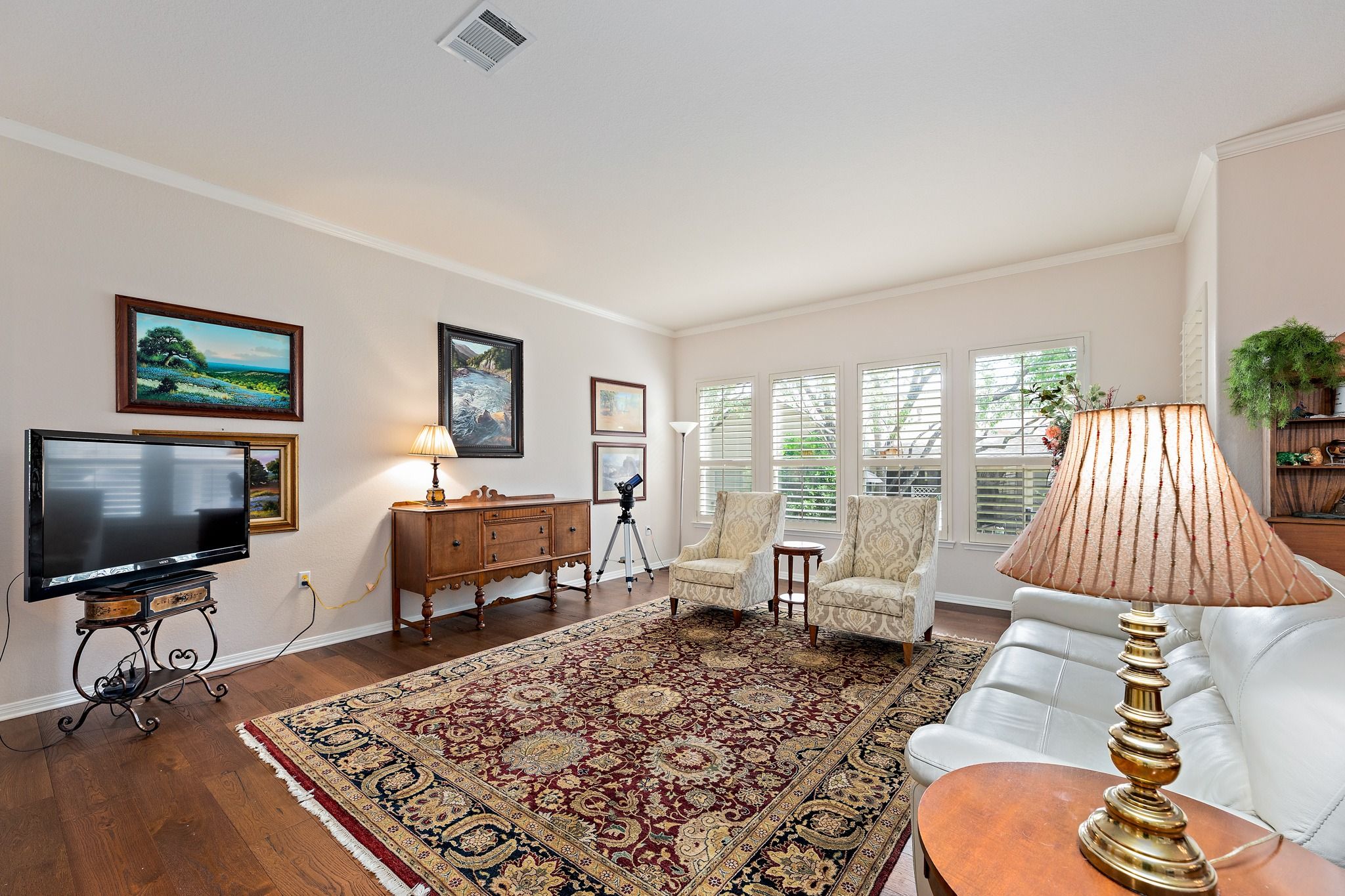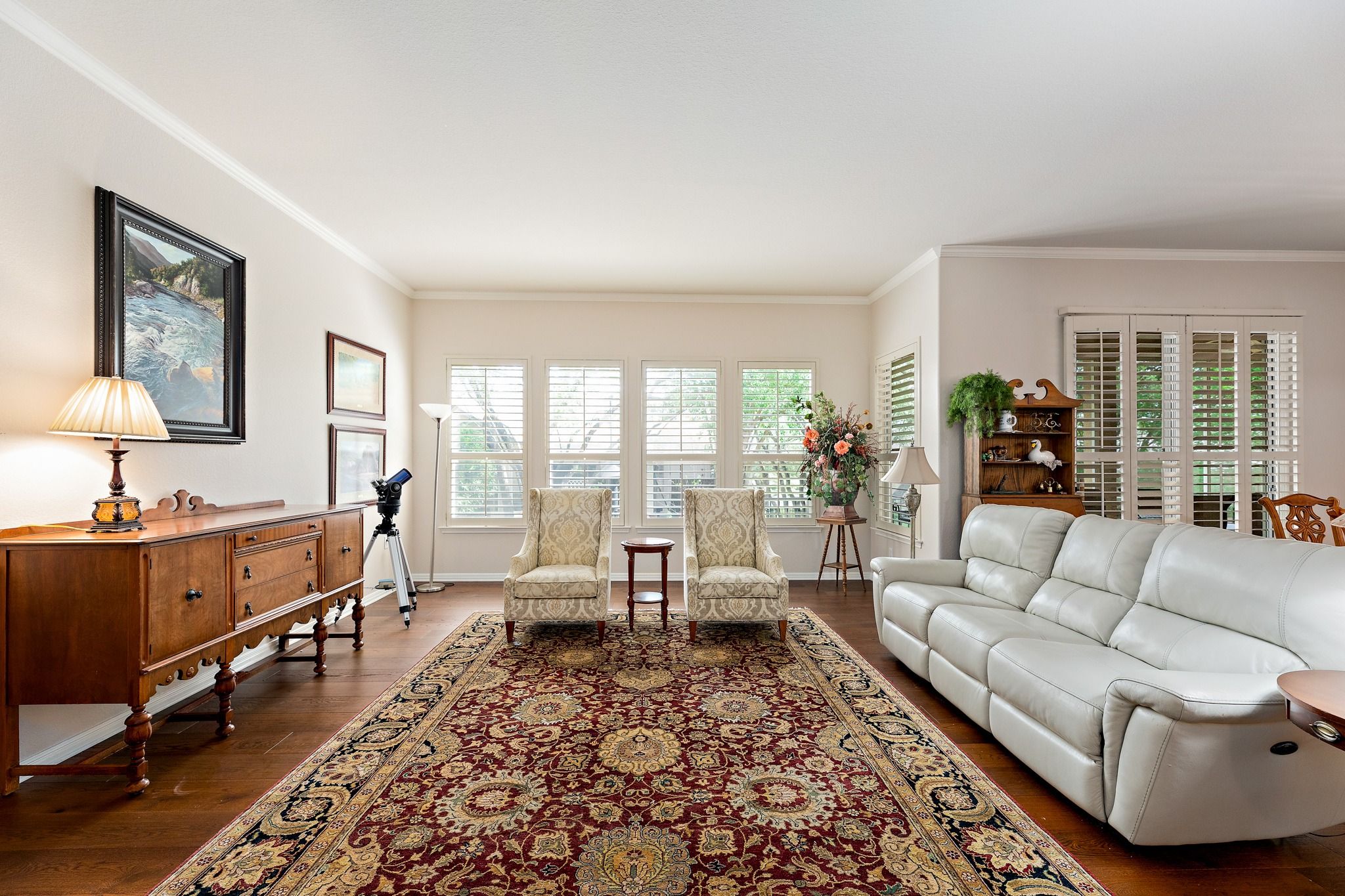 Comfortable elegance defines this exceptional Rio Grande estate home, nestled at the end of a tree-lined cul-de-sac in Del Webb's original Sun City estate neighborhood — one of the community's most coveted addresses. With a pocket park to one side and an inviting flagstone courtyard out front, the curb appeal alone will stop you in your tracks. At 2,913 square feet, this 2-bedroom, 2.5-bath home lives large. Two generous living areas, a formal dining room, a sunny breakfast space, a dedicated home office, and a laundry room with sewing space mean every member of the household has exactly the room they need. And when guests arrive, the layout makes entertaining feel effortless. The details are what elevate this home above the rest — rich wood floors, soaring 10-foot ceilings trimmed with crown molding, stainless appliances, designer paint, plantation shutters, and a central vacuum system. The screened back porch extends your living space outdoors, offering a shaded retreat for morning coffee or evening conversation year-round. Centrally located within Sun City, golf courses and amenity centers are just minutes away. A front-entry double garage paired with a side-entry golf cart door means no more shuffling vehicles — just grab your clubs and go. Roof and gutters replaced in 2020. Sitting on a third-of-an-acre-plus lot, this is the rare Sun City home that checks every single box.