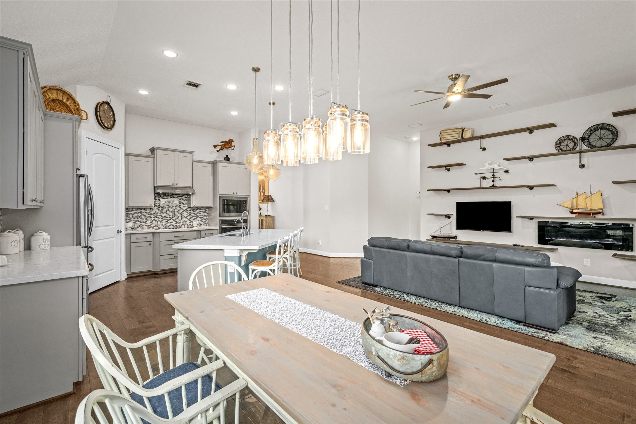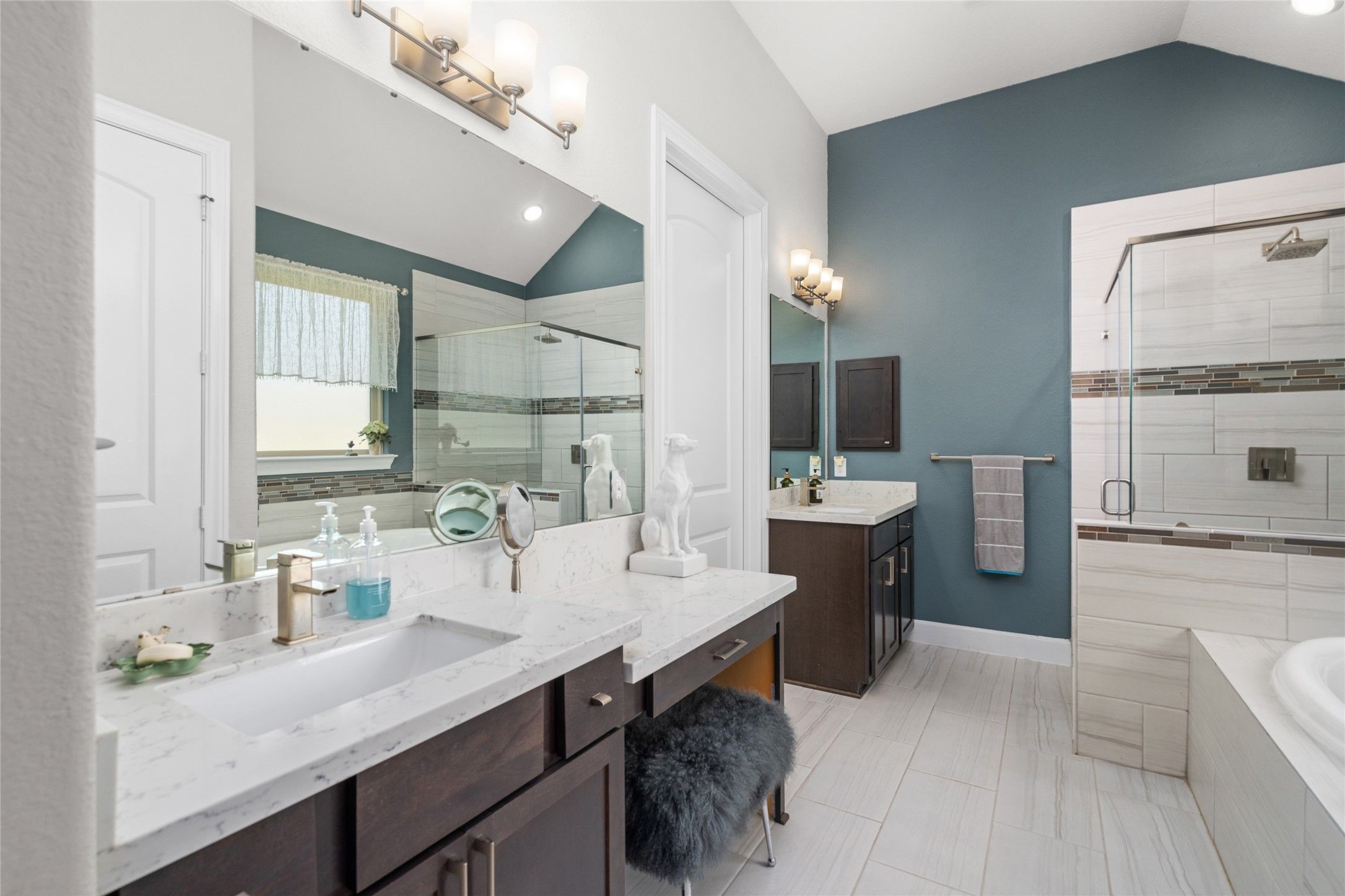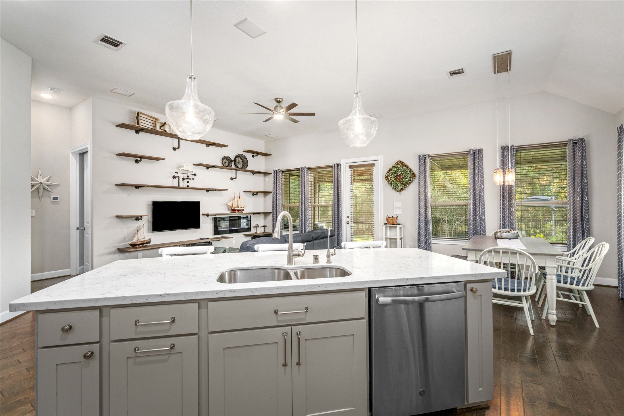 - Double Vanity, Kitchen Island, Kitchen/Family Room Combo, Pots & Pan Drawers, Pantry, Quartz Countertops, Self-closing Drawers, Soaking Tub, Separate Shower, Tub Shower, Makeup/Vanity Space, Wired for Sound, Ceiling Fan(s), Kitchen/Dining Combo, Living/Dining Room, Programmable Thermostat