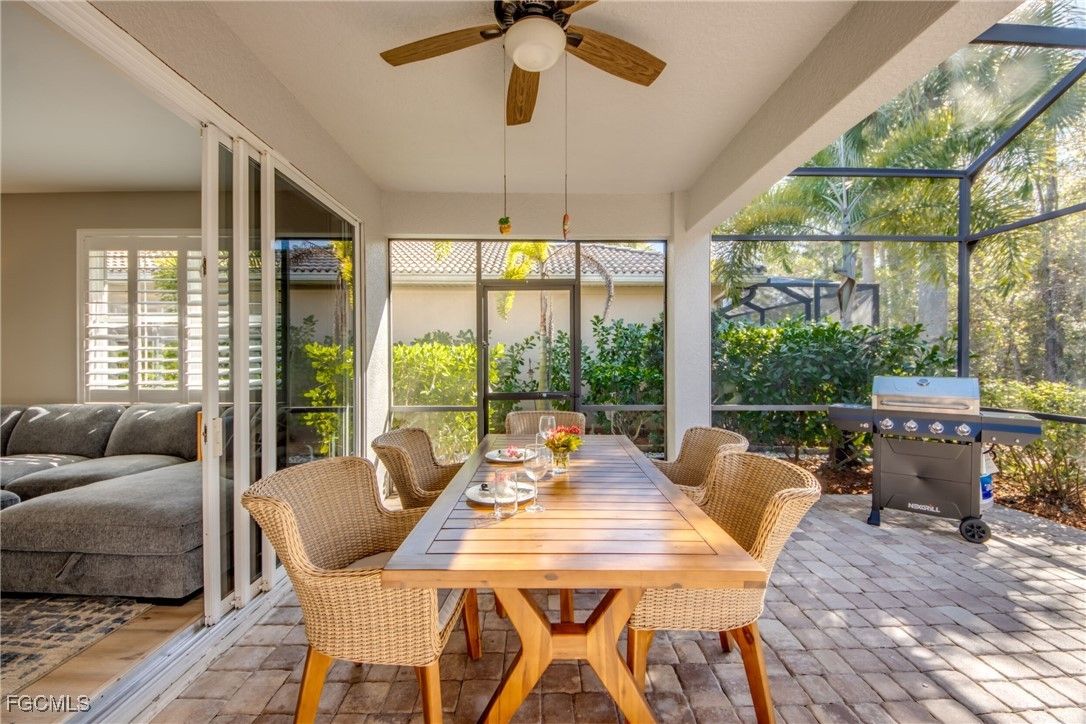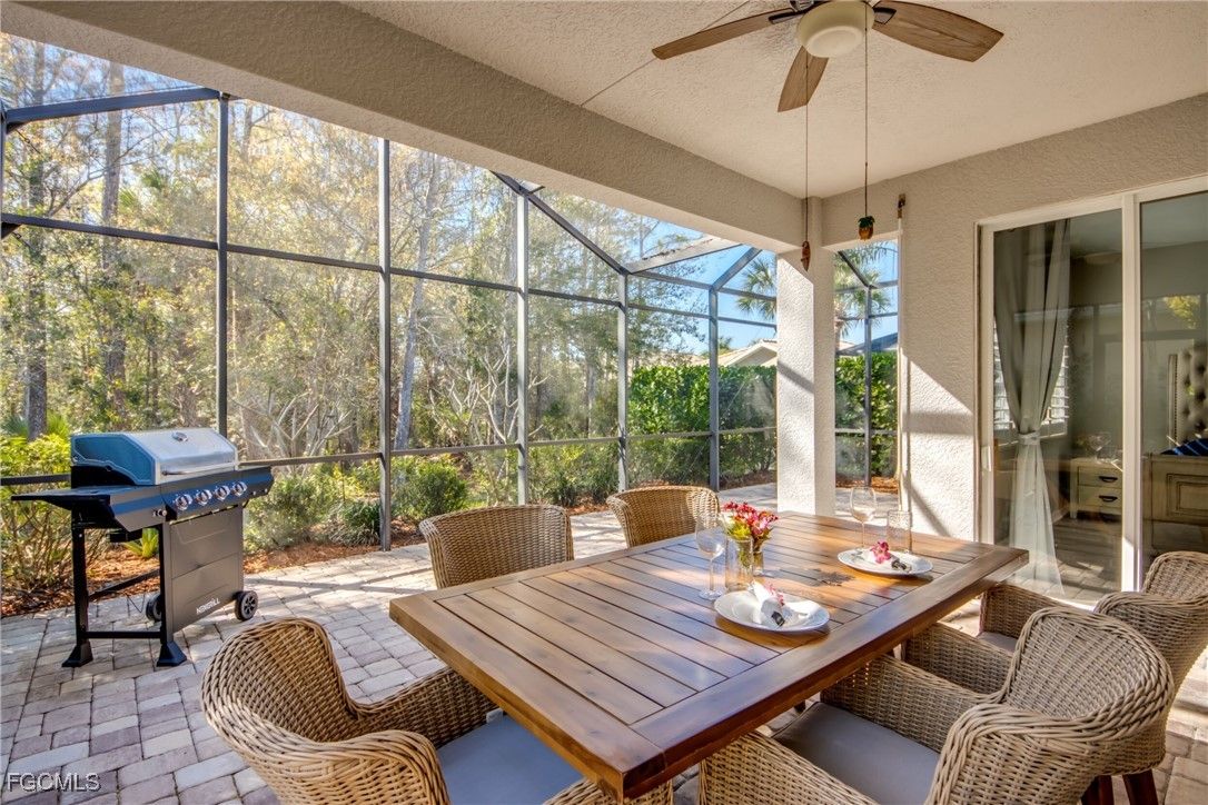 Welcome to 10600 Tirano Way in Pelican Preserve, a beautifully maintained 2-bedroom, 2-bath home offering comfort, privacy, and exceptional indoor-outdoor living. The open layout is filled with natural light and features a well-designed kitchen and living area ideal for everyday enjoyment or entertaining. The primary suite includes generous closet space and an en-suite bath, while the guest bedroom and bath provide a welcoming retreat for visitors. One of the standout features of this home is the expansive outdoor paver lanai. A spacious under-truss seating area creates a perfect shaded spot for relaxing, while the large screened extension offers endless possibilities, including space for an outdoor kitchen or additional seating and dining. The lanai overlooks a serene wooded preserve, creating a peaceful and private backdrop that feels truly sublime. Additional features include an attached garage and low-maintenance living within Pelican Preserve, an award-winning 55+ community known for its resort-style amenities, including pools, fitness, dining, pickleball, tennis, walking trails, and more. This home blends comfort, lifestyle, and natural beauty, ready for its next owner to enjoy.