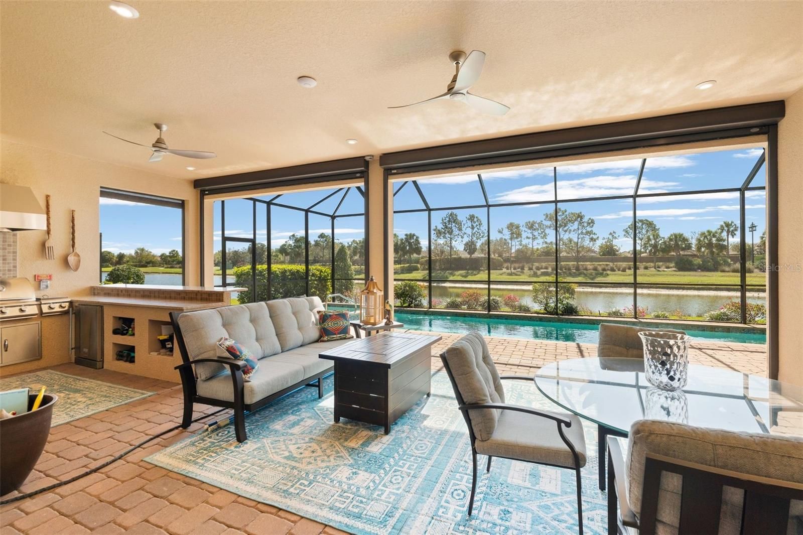 Looking for your very own piece of paradise? Step into this stunning Pallazio, designed with IMPACT windows and doors for your safety and ease, perfectly situated in the enchanting, maintenance-free community of Esplanade at Artisan Lakes. As you enter through the exquisite leaded glass double doors, an expansive open-concept floor plan bathed in natural light welcomes you. With soaring ceilings and elegant designer finishes, your eyes are irresistibly drawn to the magnificent back of the home, where a wall of glass pocket sliding doors invites the outside in, leading you to your own private outdoor haven. This space is undeniably the crown jewel, featuring a heated jetted pool and spa, a fully equipped outdoor kitchen, and a spacious screened lanai that overlooks tranquil pond views. Pool is designed with the BADU JET system, the ultimate in swimming resistance to enhance your swimming exercise. For your convenience lanai is protected with electric hurricane screens. Inside, the allure continues with tray ceilings, and crown molding that impart sophistication to every room. Custom lighting and fans in every living and dining area create a warm, welcoming atmosphere. For those with a culinary passion, the gourmet kitchen is a dream realized, featuring stunning quartz countertops, a spacious center island, upgraded cabinetry with convenient pull-out drawers, and sleek GE Café stainless-steel appliances, including a wall oven programmable for convection or air fryer, and a wine refrigerator. This kitchen is expertly designed for both daily living and entertaining. The generously appointed living and dining areas flow seamlessly into your outdoor paradise, creating the perfect backdrop for gatherings. The owner’s suite serves as a serene retreat, outfitted with a spa-like bath and custom closets that blend style with practicality. Two additional bedrooms with custom closets and a versatile den present a myriad of possibilities for guests, a home office, or creative endeavors. Two plus tandem garage offers extra parking space or area for your hobbies or workshop. Garage is also wired with an EV charger hookup. Enjoy maintenance-free living, granting you access to two magnificent clubhouses and an events manager curating an array of social activities. The community boasts two resort-style pools, spas, pickleball and tennis courts, bocce ball courts, a gym, firepit, dog parks, and a playground. Conveniently located off I-75 and I-275, you’re just minutes away from the pristine Gulf Coast beaches, charming downtown areas, and an array of shopping, dining, and entertainment options. Whether venturing to Bradenton, Sarasota, Anna Maria Island, Ellenton Outlet Mall, St. Pete, or Tampa, this prime location allows you to fully embrace the best of Florida’s Suncoast.