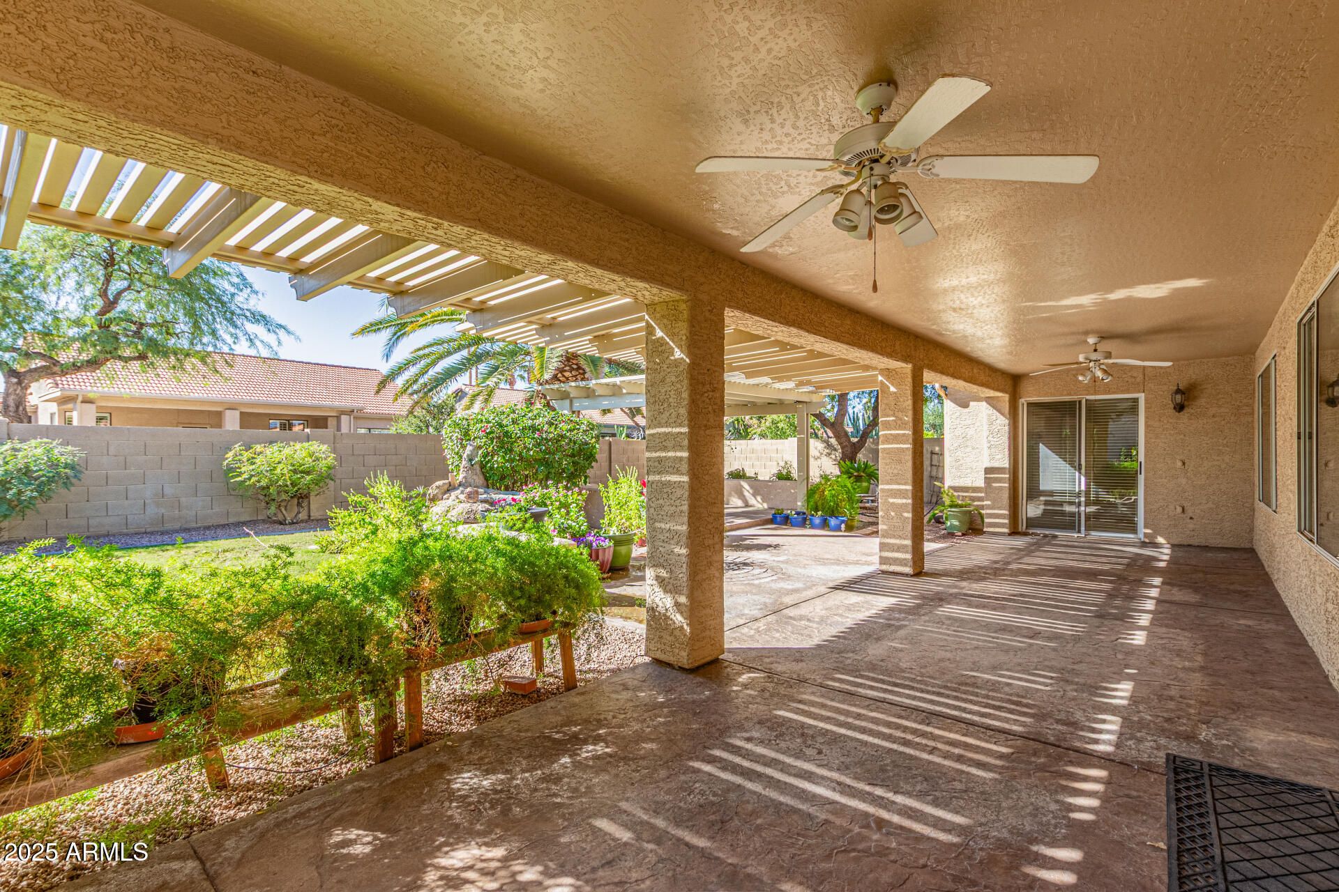 This spacious 2115 SF Palacia Plus floor plan with a 2 car garage plus GOLF CART BAY in the Adult community of Sun Lakes (Ironwood) features VAULTED CEILINGS & NEUTRAL FINISHES throughout. The Kitchen has plenty of PULL-OUT CABINETS, lots of GRANITE Countertop Space, Black Appliances & a BREAKFAST NOOK. The LARGE Primary Suite includes a HUGE Walk-in CLOSET, BUILT-IN CABINETS, a GORGEOUSLY REMODELED 2024 BATH & a Separate entry to the recently landscaped, fenced Backyard w/ PERGOLA & Large Trees. You will find lots of extra storage space in the Indoor Laundry Room & Built-in Cabinets inside the Garage. Come & See what this beautiful 55+ community has to offer including Golf, Tennis, Pickleball, Swimming & so much more!