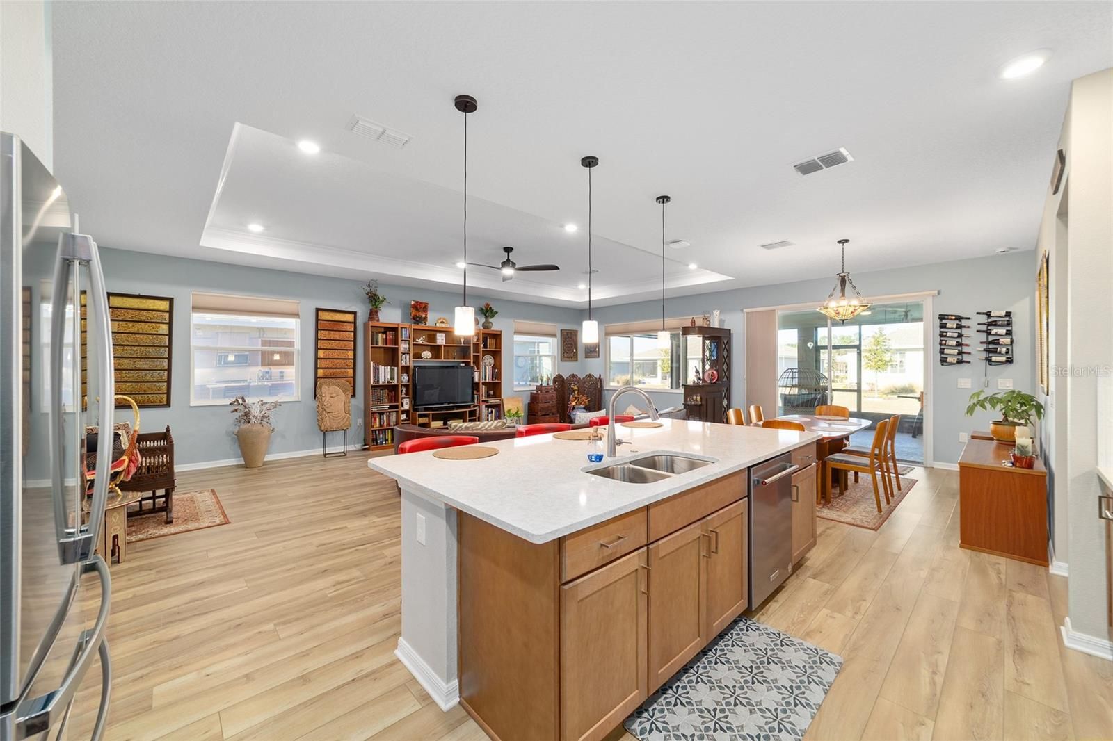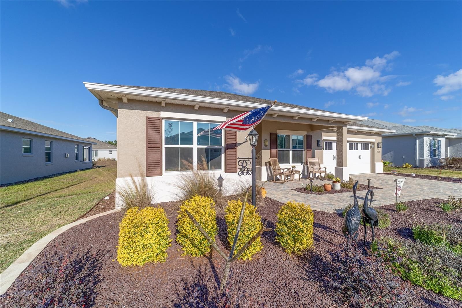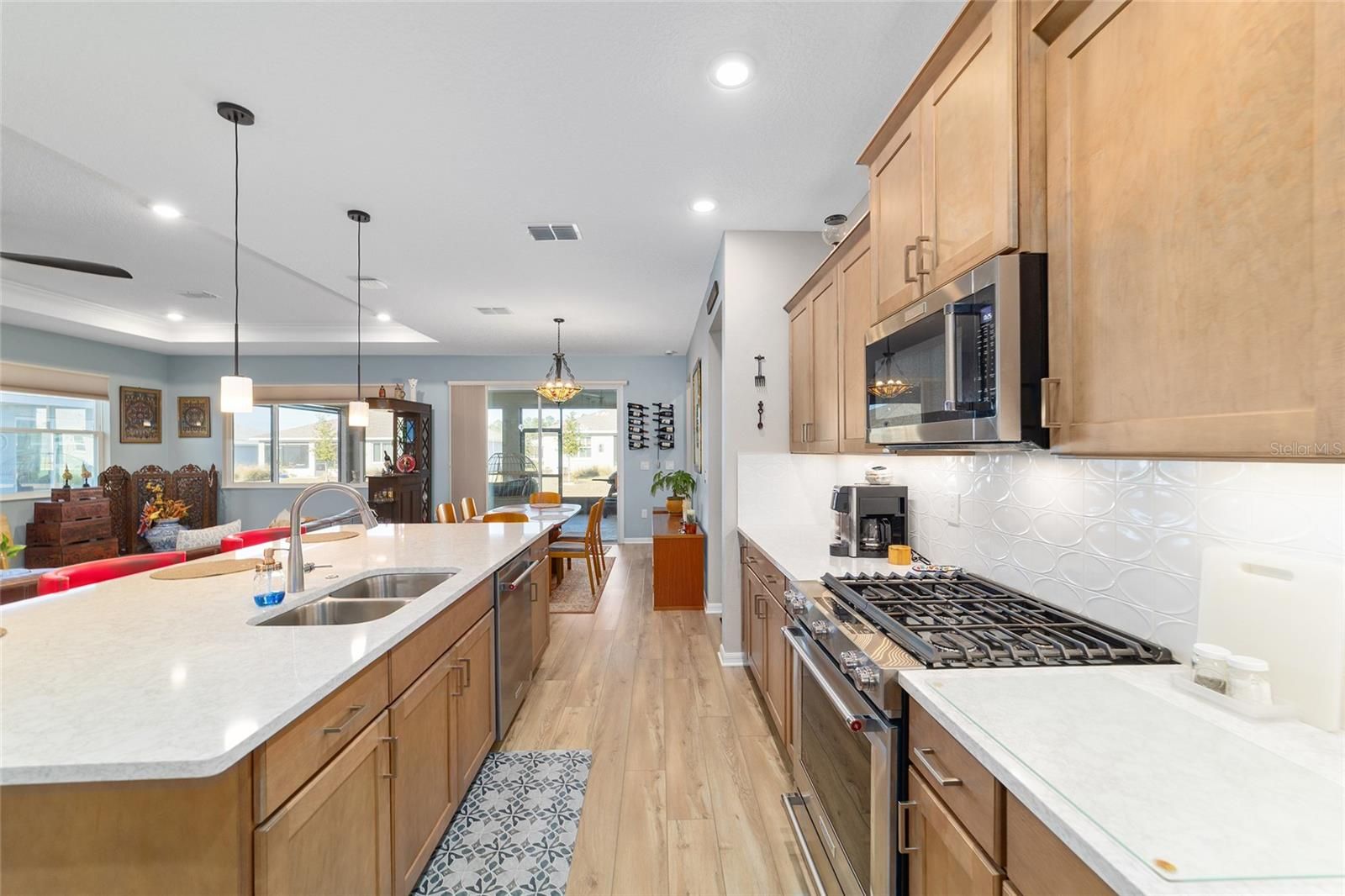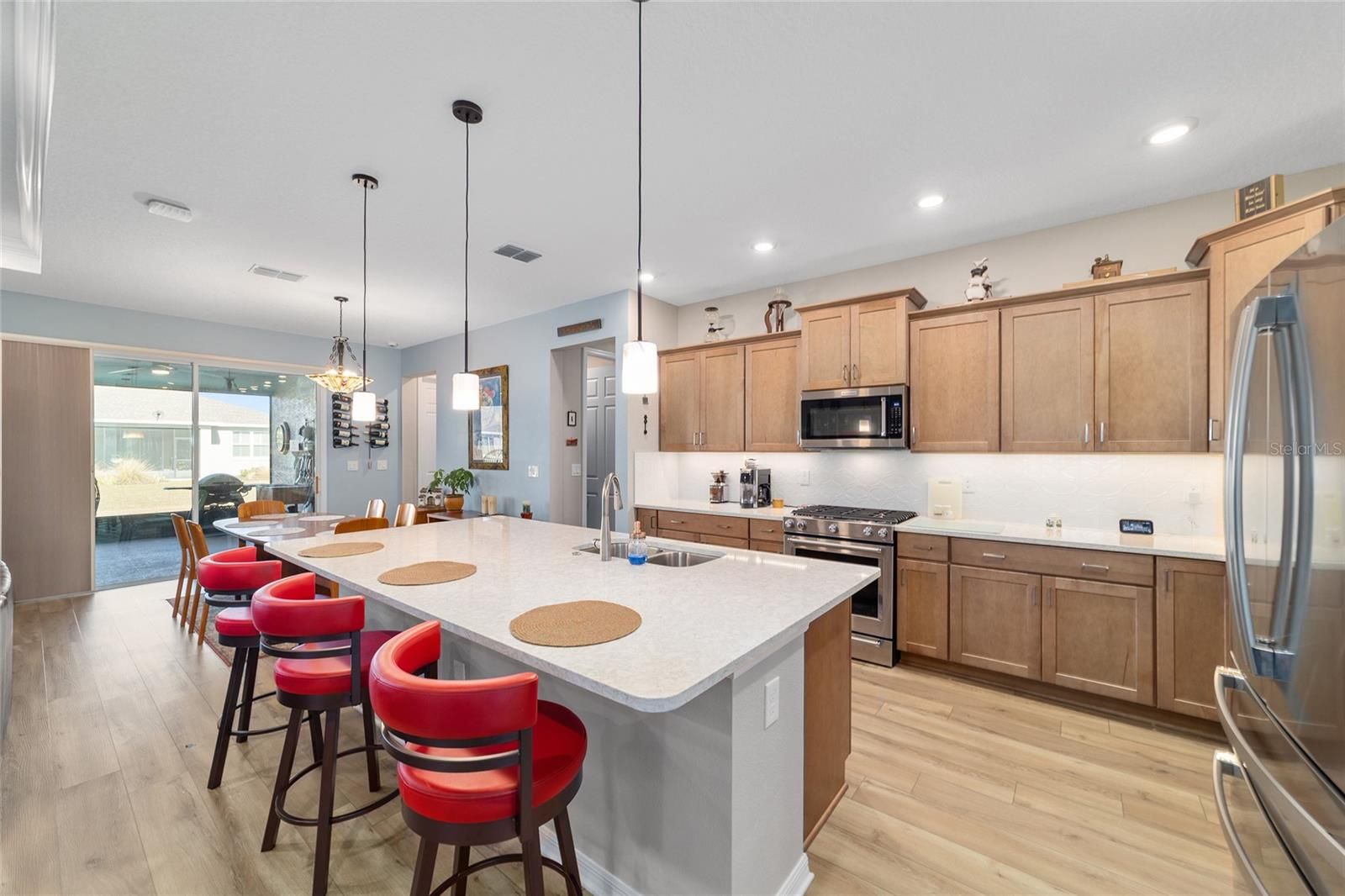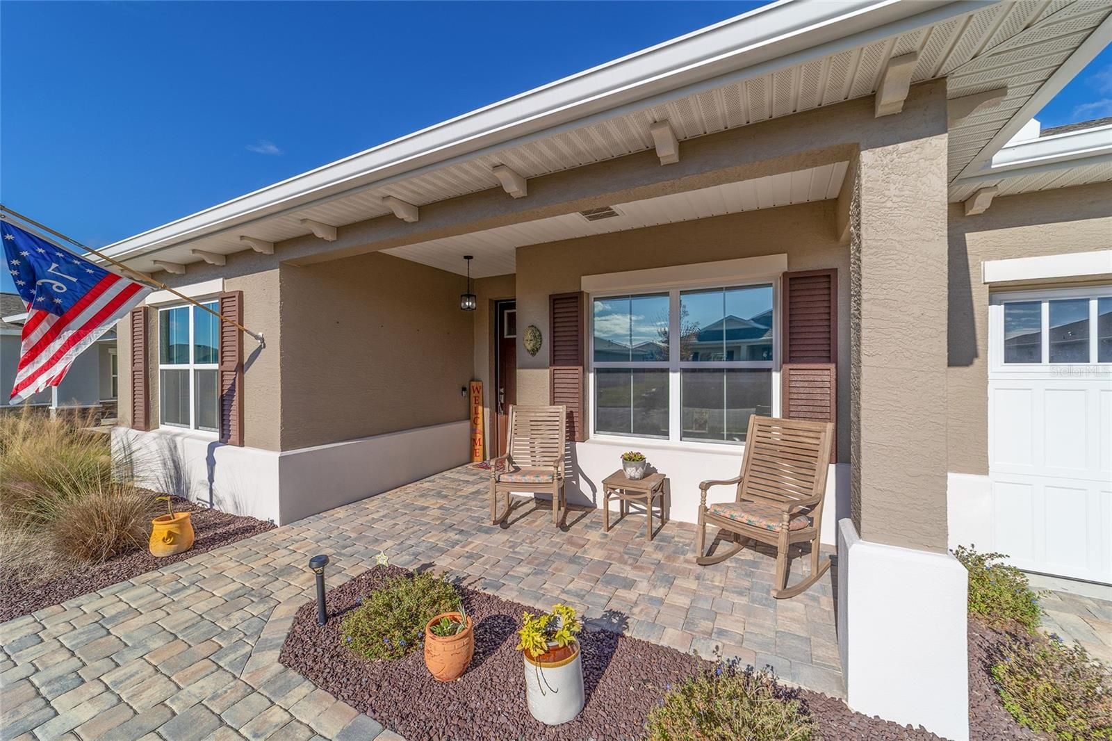 Move right in without adding a thing and experience the pinnacle of active-adult luxury in this stunning Ariana model with many upgrades, perfectly situated in the highly sought-after Longleaf Ridge neighborhood of On Top of the World. This completely customized 2-bedroom, 2-bath residence plus a versatile flex room has been thoughtfully designed with premium finishes and "smart" comforts. From the moment you arrive, the paver driveway, custom premium landscaping with stone curbing, color rocks, and professional outdoor lighting set a sophisticated tone that continues throughout the home. Step inside to an airy, open floor plan where luxury vinyl plank flooring stretches across the main living areas, accented by fresh interior paint and custom entryway molding. The living room features a tray ceiling with crown molding and a ceiling fan, creating a striking centerpiece for the home. The heart of the home is a chef's dream kitchen, featuring a large quartz center island with elegant pendant lighting, a 5-burner range, and staggered cabinetry with soft-close drawers. Thoughtful extras like under-cabinet lighting, a decorative tile backsplash, and a walk-in pantry with built-in wood shelving make this space as functional as it is beautiful. Just off the entryway, the flex room with classic French doors offers a private retreat perfect for a library, craft studio, or a quiet den for morning coffee. The primary suite is a true sanctuary, boasting a ceiling fan, custom-organized walk-in closet, and a spa-like ensuite. You'll love the luxury of the zero-entry tiled Roman shower with a built-in bench, double quartz vanity, and a heated towel rack. The guest wing is equally impressive, offering a comfortable bedroom with pull-down shades and easy access to the second bath. Both bathrooms feature exquisite custom French tile, elevating the home's aesthetic, while they further impress with updated mirrors, modern lighting, and quartz vanities. The laundry suite is equally impressive, featuring upper cabinets and a utility sink. Florida living shines on the extended covered lanai, equipped with dual fans and custom vertical blinds on the sliding glass door for effortless light control and privacy. The exterior has been thoughtfully upgraded with gutters, extra outlets, and a paver walkway. The home is also packed with high-value internal upgrades for peace of mind, including a whole-home water softener and purifier, all window tinting for energy efficiency, a Ring doorbell, and motion-sensor entry. Even the garage is optimized with shelving for maximum organization. Located in Ocala's premier 55+ community, you aren't just buying a home; you're gaining access to world-class golf, fitness centers, tennis, pickleball, and over 175 social clubs. Why wait for the construction process when you can start enjoying this impeccably maintained, highly upgraded home right now?