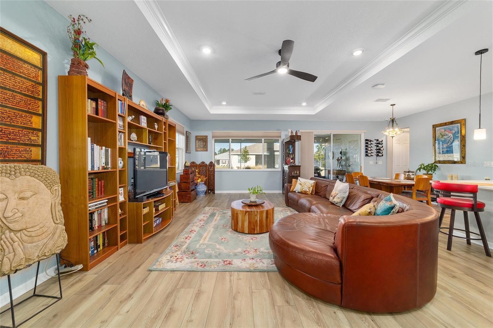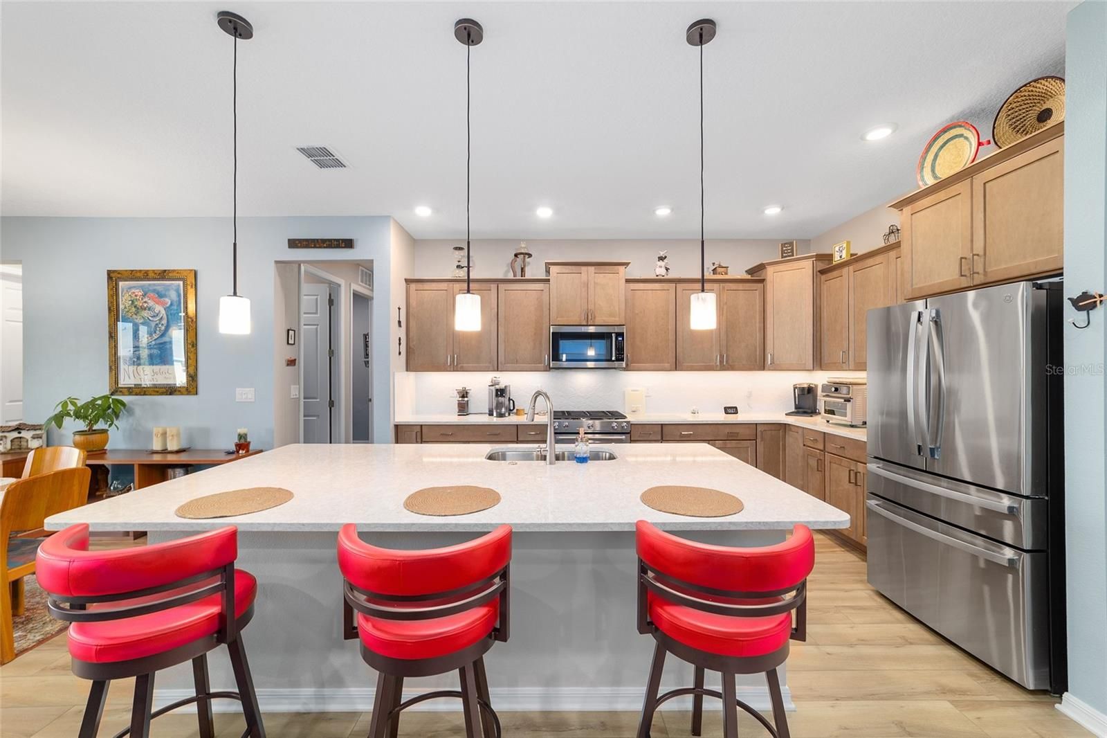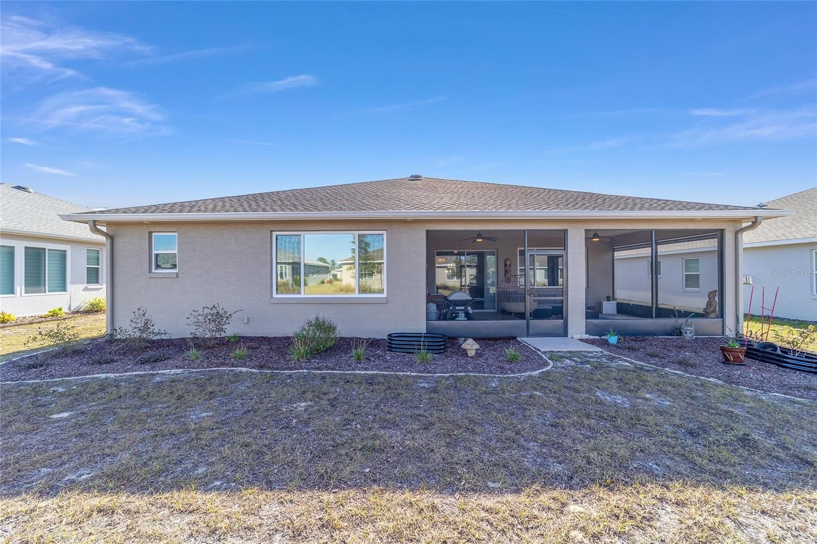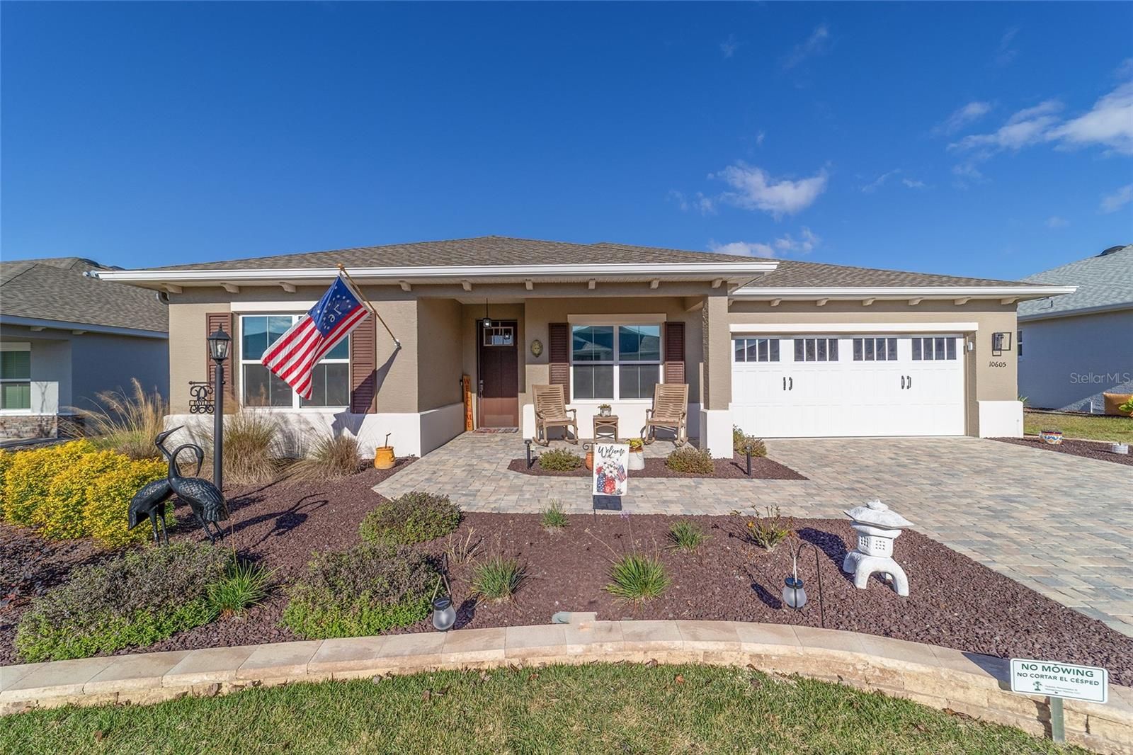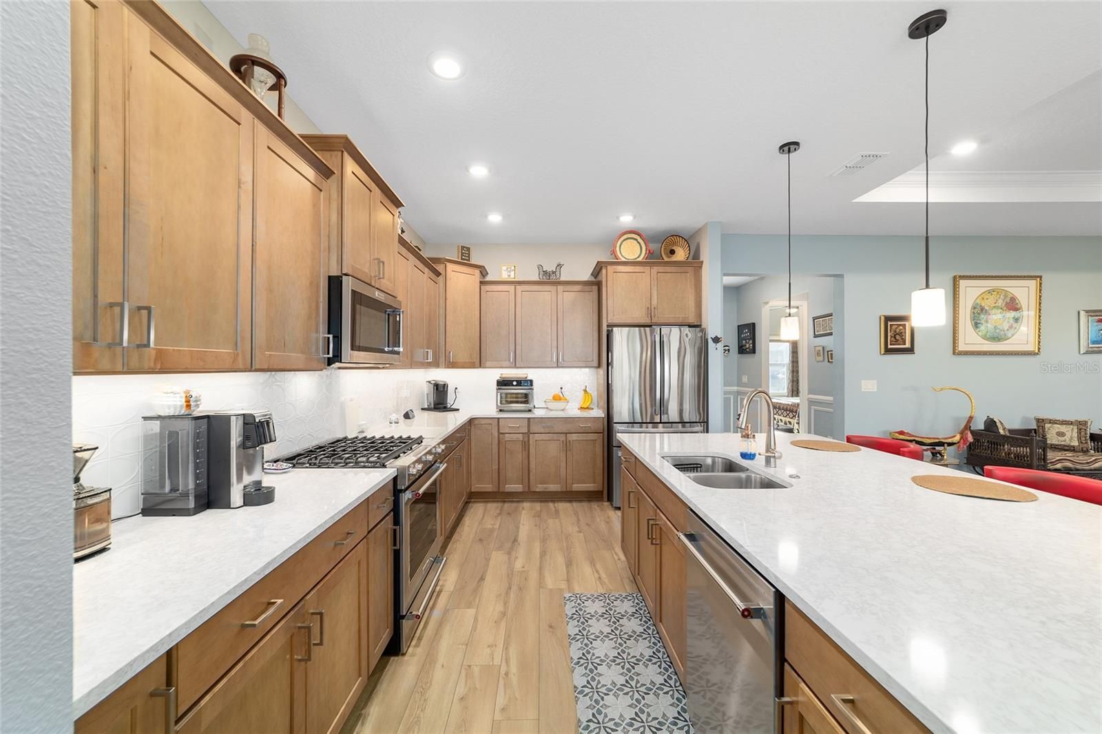 Move right in without adding a thing and experience the pinnacle of active-adult luxury in this stunning Ariana model with many upgrades, perfectly situated in the highly sought-after Longleaf Ridge neighborhood of On Top of the World. This completely customized 2-bedroom, 2-bath residence plus a versatile flex room has been thoughtfully designed with premium finishes and "smart" comforts. From the moment you arrive, the paver driveway, custom premium landscaping with stone curbing, color rocks, and professional outdoor lighting set a sophisticated tone that continues throughout the home. Step inside to an airy, open floor plan where luxury vinyl plank flooring stretches across the main living areas, accented by fresh interior paint and custom entryway molding. The living room features a tray ceiling with crown molding and a ceiling fan, creating a striking centerpiece for the home. The heart of the home is a chef's dream kitchen, featuring a large quartz center island with elegant pendant lighting, a 5-burner range, and staggered cabinetry with soft-close drawers. Thoughtful extras like under-cabinet lighting, a decorative tile backsplash, and a walk-in pantry with built-in wood shelving make this space as functional as it is beautiful. Just off the entryway, the flex room with classic French doors offers a private retreat perfect for a library, craft studio, or a quiet den for morning coffee. The primary suite is a true sanctuary, boasting a ceiling fan, custom-organized walk-in closet, and a spa-like ensuite. You'll love the luxury of the zero-entry tiled Roman shower with a built-in bench, double quartz vanity, and a heated towel rack. The guest wing is equally impressive, offering a comfortable bedroom with pull-down shades and easy access to the second bath. Both bathrooms feature exquisite custom French tile, elevating the home's aesthetic, while they further impress with updated mirrors, modern lighting, and quartz vanities. The laundry suite is equally impressive, featuring upper cabinets and a utility sink. Florida living shines on the extended covered lanai, equipped with dual fans and custom vertical blinds on the sliding glass door for effortless light control and privacy. The exterior has been thoughtfully upgraded with gutters, extra outlets, and a paver walkway. The home is also packed with high-value internal upgrades for peace of mind, including a whole-home water softener and purifier, all window tinting for energy efficiency, a Ring doorbell, and motion-sensor entry. Even the garage is optimized with shelving for maximum organization. Located in Ocala's premier 55+ community, you aren't just buying a home; you're gaining access to world-class golf, fitness centers, tennis, pickleball, and over 175 social clubs. Why wait for the construction process when you can start enjoying this impeccably maintained, highly upgraded home right now?