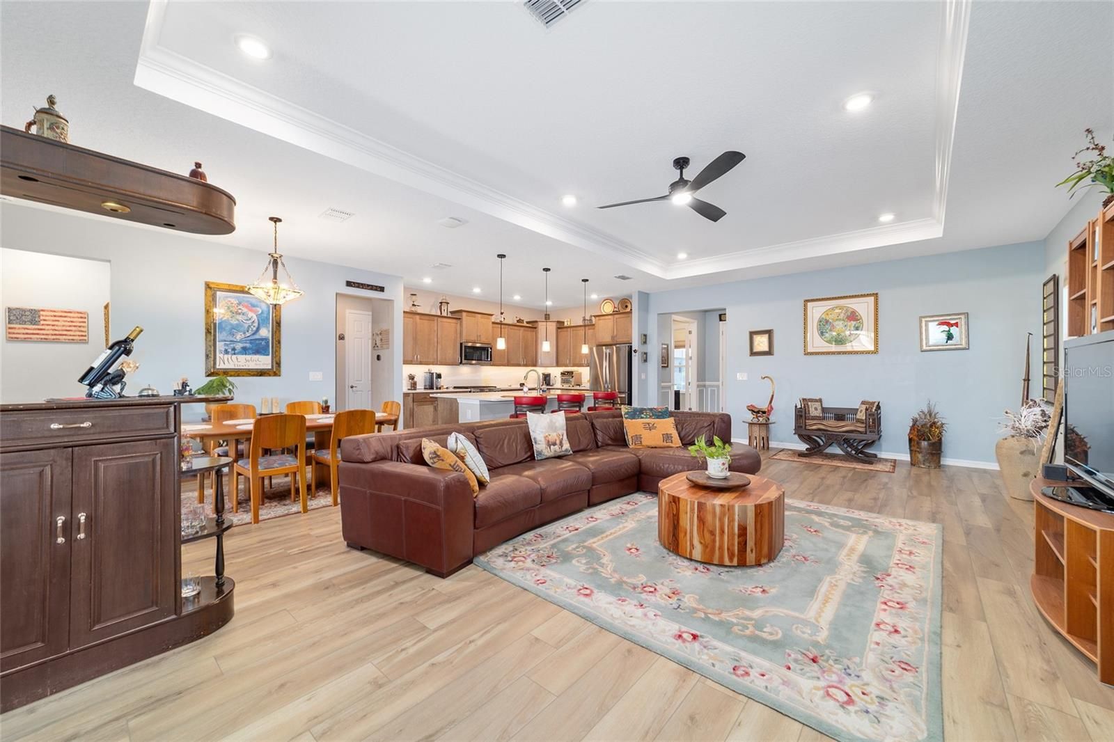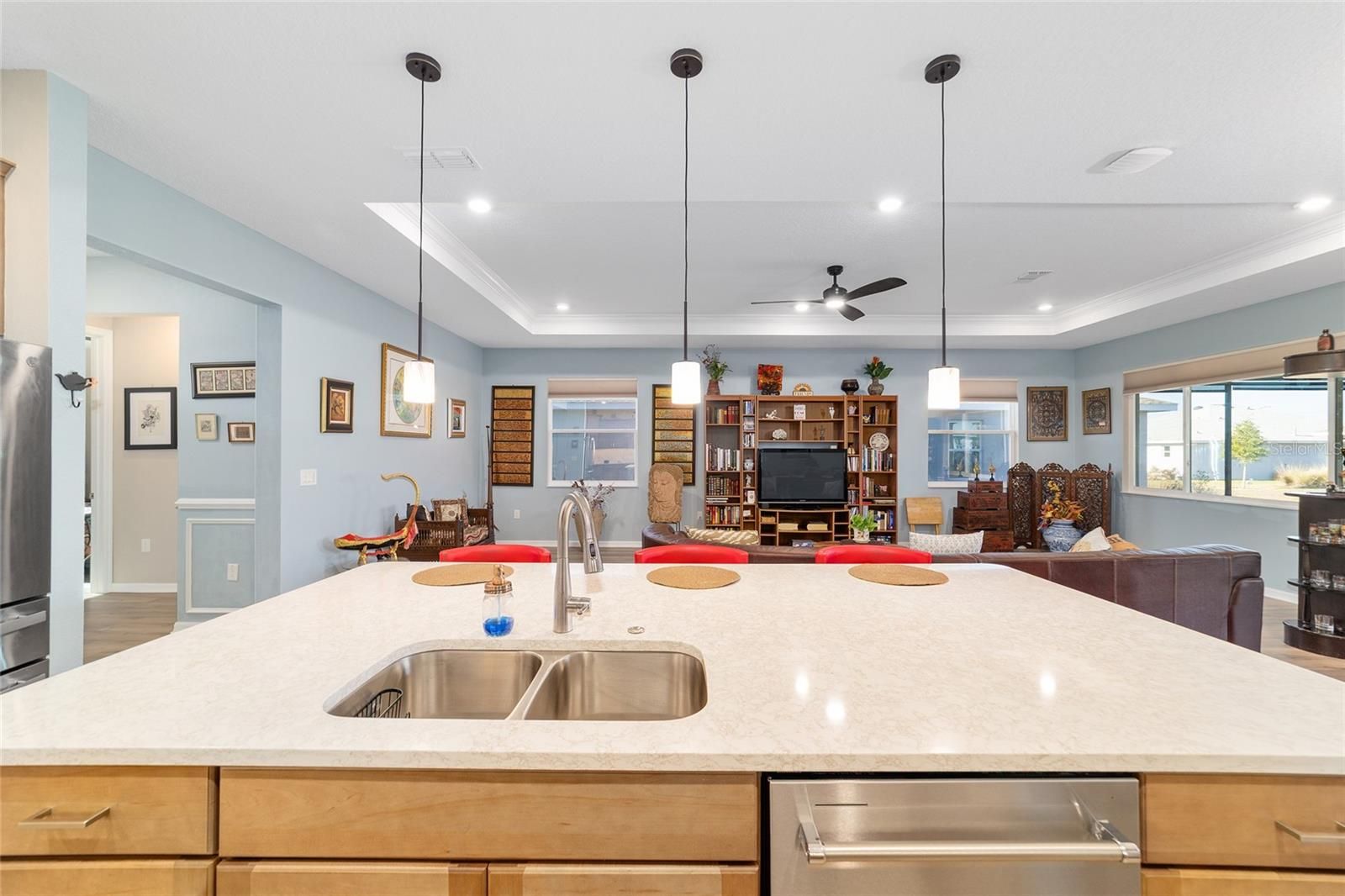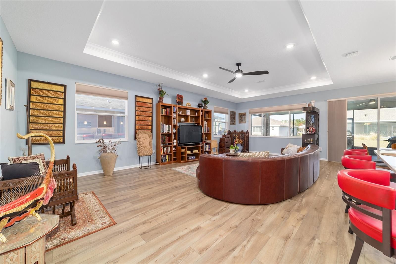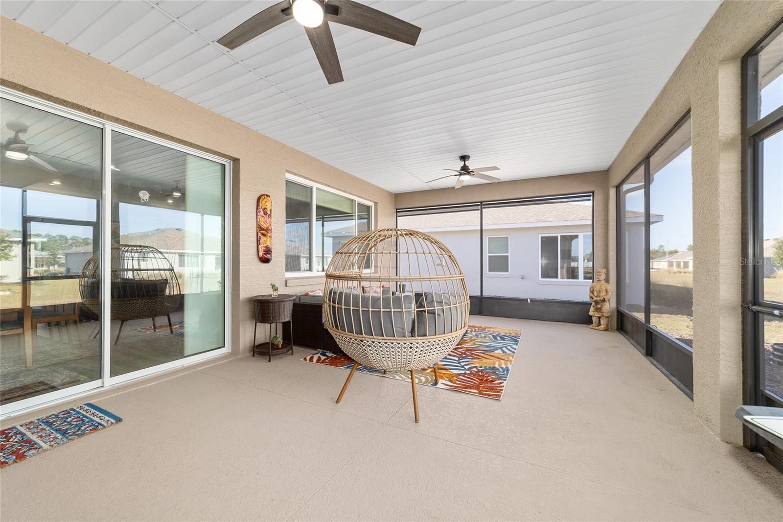 Move right in without adding a thing and experience the pinnacle of active-adult luxury in this stunning Ariana model with many upgrades, perfectly situated in the highly sought-after Longleaf Ridge neighborhood of On Top of the World. This completely customized 2-bedroom, 2-bath residence plus a versatile flex room has been thoughtfully designed with premium finishes and "smart" comforts. From the moment you arrive, the paver driveway, custom premium landscaping with stone curbing, color rocks, and professional outdoor lighting set a sophisticated tone that continues throughout the home. Step inside to an airy, open floor plan where luxury vinyl plank flooring stretches across the main living areas, accented by fresh interior paint and custom entryway molding. The living room features a tray ceiling with crown molding and a ceiling fan, creating a striking centerpiece for the home. The heart of the home is a chef's dream kitchen, featuring a large quartz center island with elegant pendant lighting, a 5-burner range, and staggered cabinetry with soft-close drawers. Thoughtful extras like under-cabinet lighting, a decorative tile backsplash, and a walk-in pantry with built-in wood shelving make this space as functional as it is beautiful. Just off the entryway, the flex room with classic French doors offers a private retreat perfect for a library, craft studio, or a quiet den for morning coffee. The primary suite is a true sanctuary, boasting a ceiling fan, custom-organized walk-in closet, and a spa-like ensuite. You'll love the luxury of the zero-entry tiled Roman shower with a built-in bench, double quartz vanity, and a heated towel rack. The guest wing is equally impressive, offering a comfortable bedroom with pull-down shades and easy access to the second bath. Both bathrooms feature exquisite custom French tile, elevating the home's aesthetic, while they further impress with updated mirrors, modern lighting, and quartz vanities. The laundry suite is equally impressive, featuring upper cabinets and a utility sink. Florida living shines on the extended covered lanai, equipped with dual fans and custom vertical blinds on the sliding glass door for effortless light control and privacy. The exterior has been thoughtfully upgraded with gutters, extra outlets, and a paver walkway. The home is also packed with high-value internal upgrades for peace of mind, including a whole-home water softener and purifier, all window tinting for energy efficiency, a Ring doorbell, and motion-sensor entry. Even the garage is optimized with shelving for maximum organization. Located in Ocala's premier 55+ community, you aren't just buying a home; you're gaining access to world-class golf, fitness centers, tennis, pickleball, and over 175 social clubs. Why wait for the construction process when you can start enjoying this impeccably maintained, highly upgraded home right now?