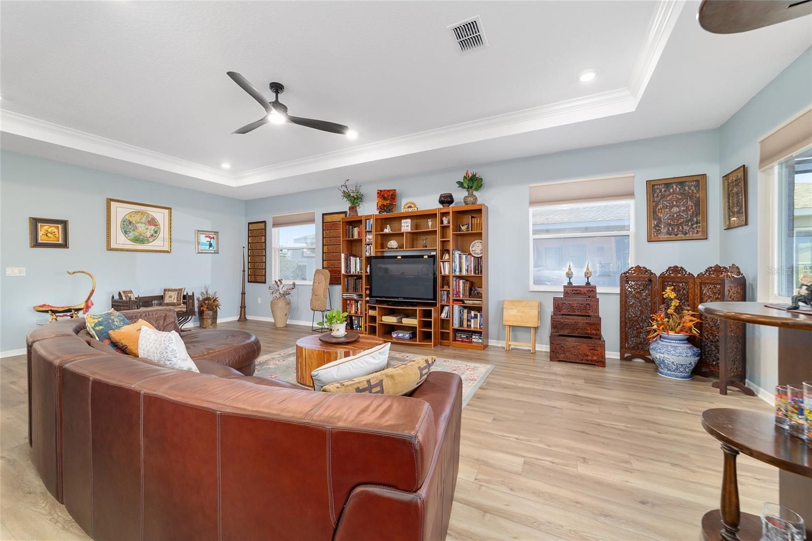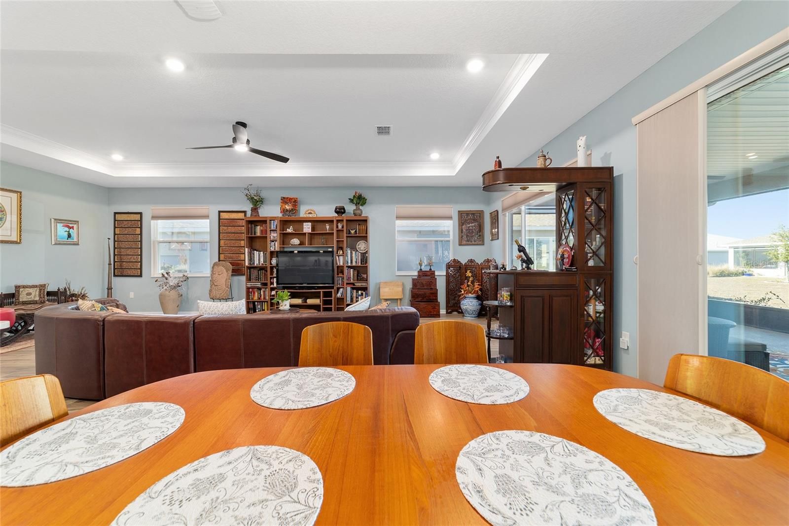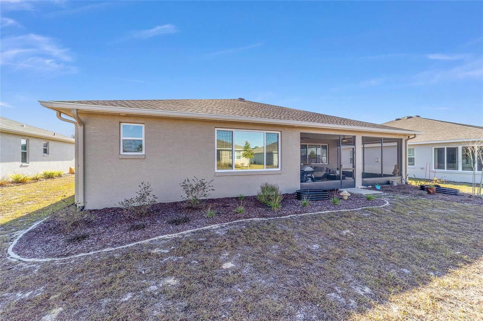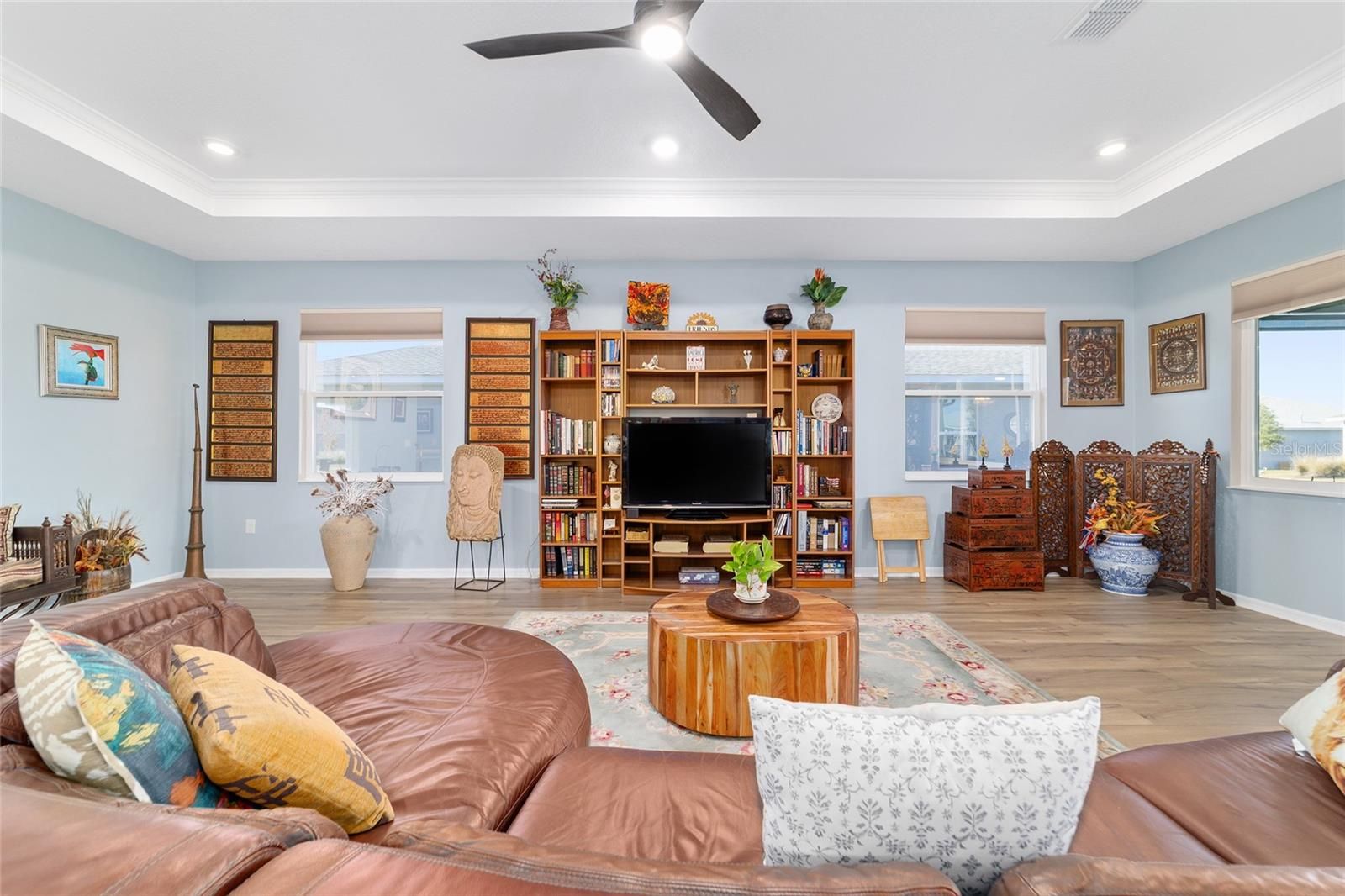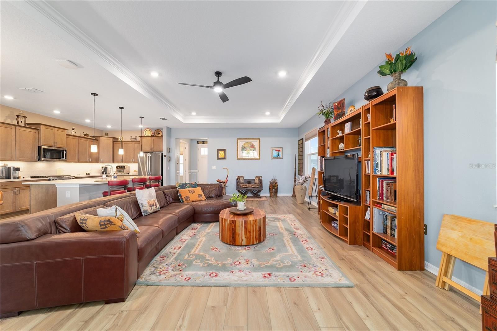 Move right in without adding a thing and experience the pinnacle of active-adult luxury in this stunning Ariana model with many upgrades, perfectly situated in the highly sought-after Longleaf Ridge neighborhood of On Top of the World. This completely customized 2-bedroom, 2-bath residence plus a versatile flex room has been thoughtfully designed with premium finishes and "smart" comforts. From the moment you arrive, the paver driveway, custom premium landscaping with stone curbing, color rocks, and professional outdoor lighting set a sophisticated tone that continues throughout the home. Step inside to an airy, open floor plan where luxury vinyl plank flooring stretches across the main living areas, accented by fresh interior paint and custom entryway molding. The living room features a tray ceiling with crown molding and a ceiling fan, creating a striking centerpiece for the home. The heart of the home is a chef's dream kitchen, featuring a large quartz center island with elegant pendant lighting, a 5-burner range, and staggered cabinetry with soft-close drawers. Thoughtful extras like under-cabinet lighting, a decorative tile backsplash, and a walk-in pantry with built-in wood shelving make this space as functional as it is beautiful. Just off the entryway, the flex room with classic French doors offers a private retreat perfect for a library, craft studio, or a quiet den for morning coffee. The primary suite is a true sanctuary, boasting a ceiling fan, custom-organized walk-in closet, and a spa-like ensuite. You'll love the luxury of the zero-entry tiled Roman shower with a built-in bench, double quartz vanity, and a heated towel rack. The guest wing is equally impressive, offering a comfortable bedroom with pull-down shades and easy access to the second bath. Both bathrooms feature exquisite custom French tile, elevating the home's aesthetic, while they further impress with updated mirrors, modern lighting, and quartz vanities. The laundry suite is equally impressive, featuring upper cabinets and a utility sink. Florida living shines on the extended covered lanai, equipped with dual fans and custom vertical blinds on the sliding glass door for effortless light control and privacy. The exterior has been thoughtfully upgraded with gutters, extra outlets, and a paver walkway. The home is also packed with high-value internal upgrades for peace of mind, including a whole-home water softener and purifier, all window tinting for energy efficiency, a Ring doorbell, and motion-sensor entry. Even the garage is optimized with shelving for maximum organization. Located in Ocala's premier 55+ community, you aren't just buying a home; you're gaining access to world-class golf, fitness centers, tennis, pickleball, and over 175 social clubs. Why wait for the construction process when you can start enjoying this impeccably maintained, highly upgraded home right now?