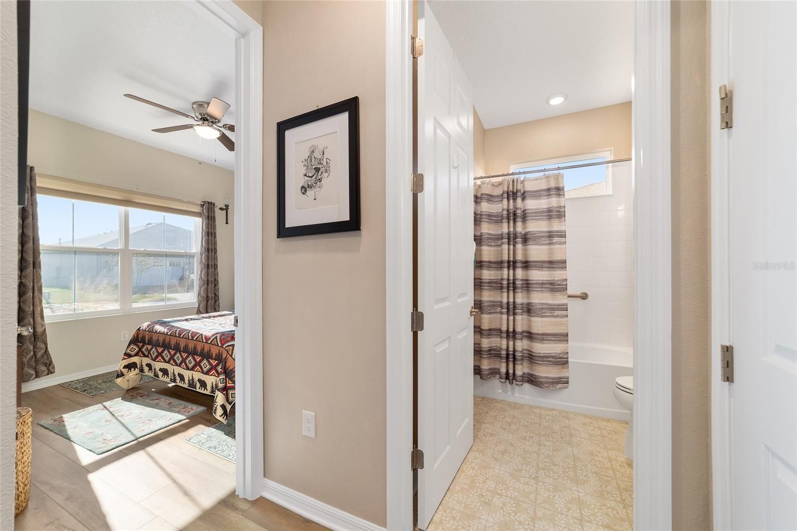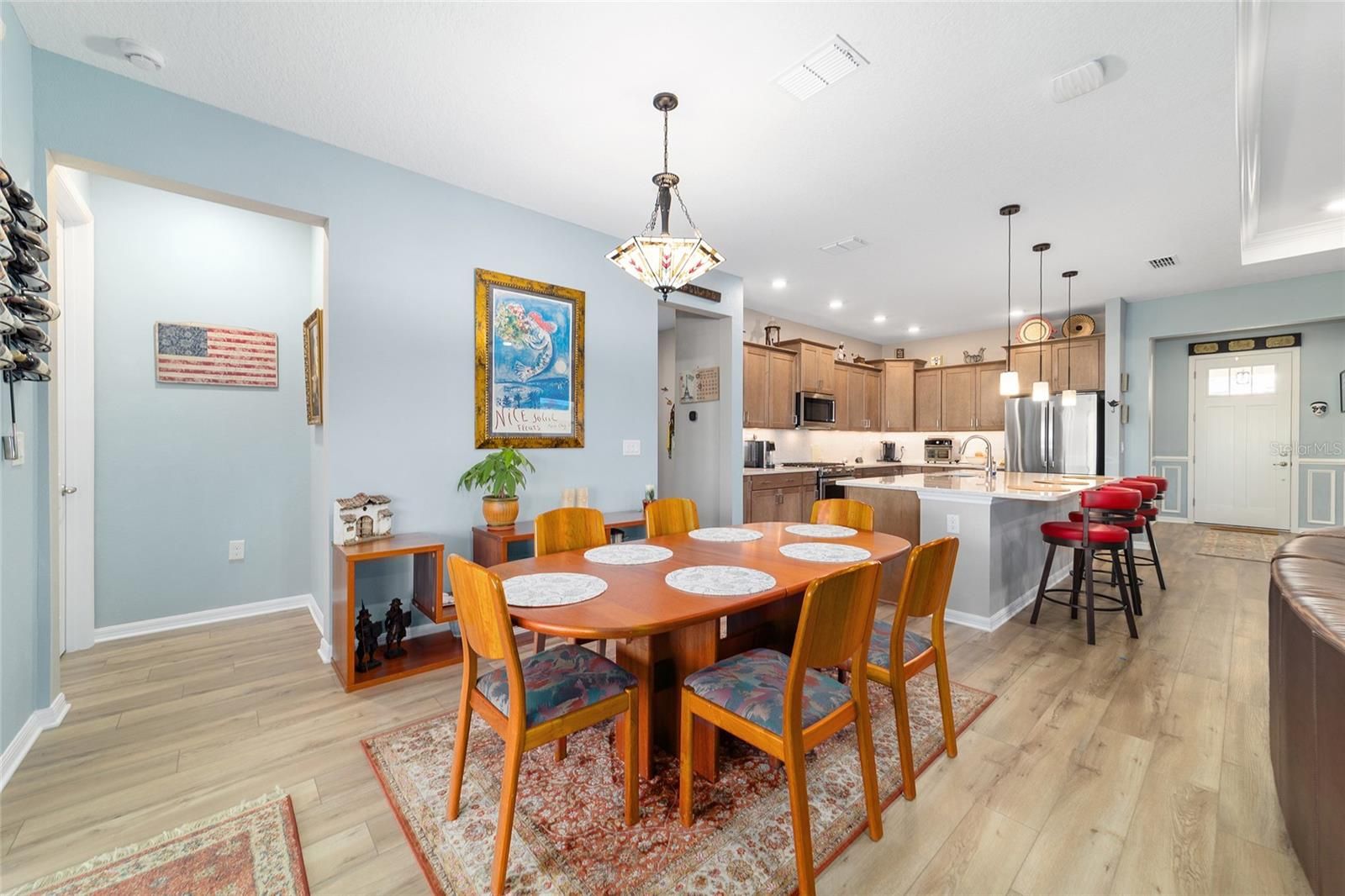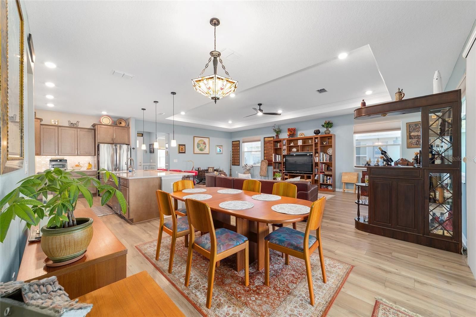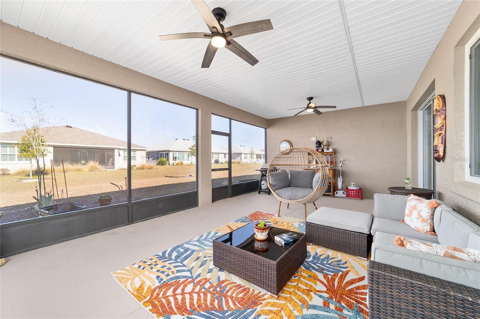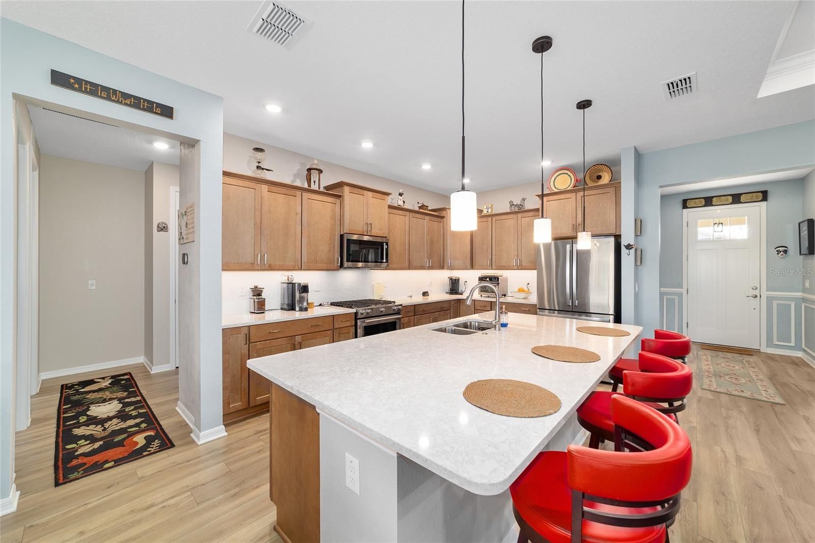 Move right in without adding a thing and experience the pinnacle of active-adult luxury in this stunning Ariana model with many upgrades, perfectly situated in the highly sought-after Longleaf Ridge neighborhood of On Top of the World. This completely customized 2-bedroom, 2-bath residence plus a versatile flex room has been thoughtfully designed with premium finishes and "smart" comforts. From the moment you arrive, the paver driveway, custom premium landscaping with stone curbing, color rocks, and professional outdoor lighting set a sophisticated tone that continues throughout the home. Step inside to an airy, open floor plan where luxury vinyl plank flooring stretches across the main living areas, accented by fresh interior paint and custom entryway molding. The living room features a tray ceiling with crown molding and a ceiling fan, creating a striking centerpiece for the home. The heart of the home is a chef's dream kitchen, featuring a large quartz center island with elegant pendant lighting, a 5-burner range, and staggered cabinetry with soft-close drawers. Thoughtful extras like under-cabinet lighting, a decorative tile backsplash, and a walk-in pantry with built-in wood shelving make this space as functional as it is beautiful. Just off the entryway, the flex room with classic French doors offers a private retreat perfect for a library, craft studio, or a quiet den for morning coffee. The primary suite is a true sanctuary, boasting a ceiling fan, custom-organized walk-in closet, and a spa-like ensuite. You'll love the luxury of the zero-entry tiled Roman shower with a built-in bench, double quartz vanity, and a heated towel rack. The guest wing is equally impressive, offering a comfortable bedroom with pull-down shades and easy access to the second bath. Both bathrooms feature exquisite custom French tile, elevating the home's aesthetic, while they further impress with updated mirrors, modern lighting, and quartz vanities. The laundry suite is equally impressive, featuring upper cabinets and a utility sink. Florida living shines on the extended covered lanai, equipped with dual fans and custom vertical blinds on the sliding glass door for effortless light control and privacy. The exterior has been thoughtfully upgraded with gutters, extra outlets, and a paver walkway. The home is also packed with high-value internal upgrades for peace of mind, including a whole-home water softener and purifier, all window tinting for energy efficiency, a Ring doorbell, and motion-sensor entry. Even the garage is optimized with shelving for maximum organization. Located in Ocala's premier 55+ community, you aren't just buying a home; you're gaining access to world-class golf, fitness centers, tennis, pickleball, and over 175 social clubs. Why wait for the construction process when you can start enjoying this impeccably maintained, highly upgraded home right now?