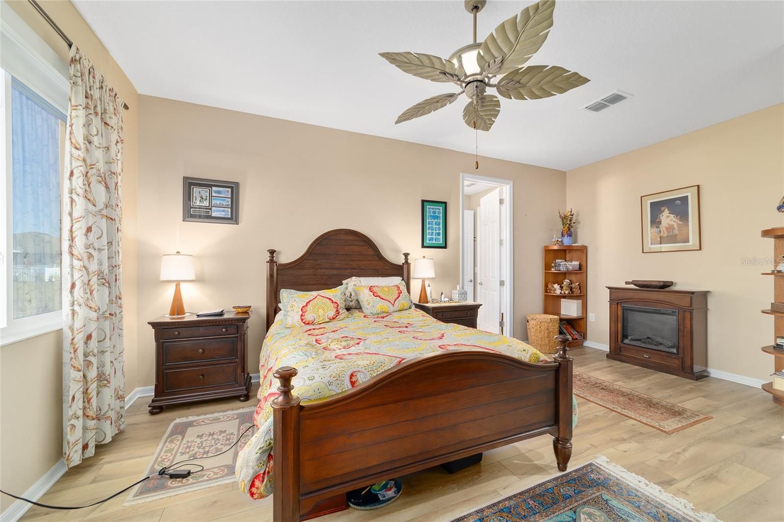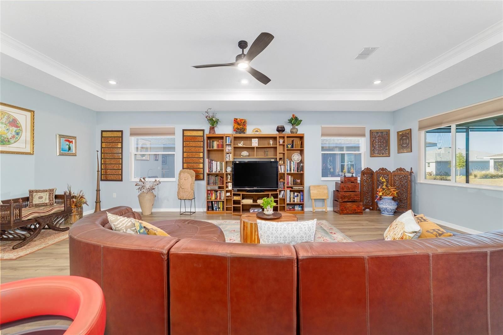 - Built-in Features, Ceiling Fan(s), Crown Molding, Open Floorplan, Main Level Primary, Split Bedrooms, Stone Counters, Thermostat, Tray Ceiling(s), Walk-In Closet(s)