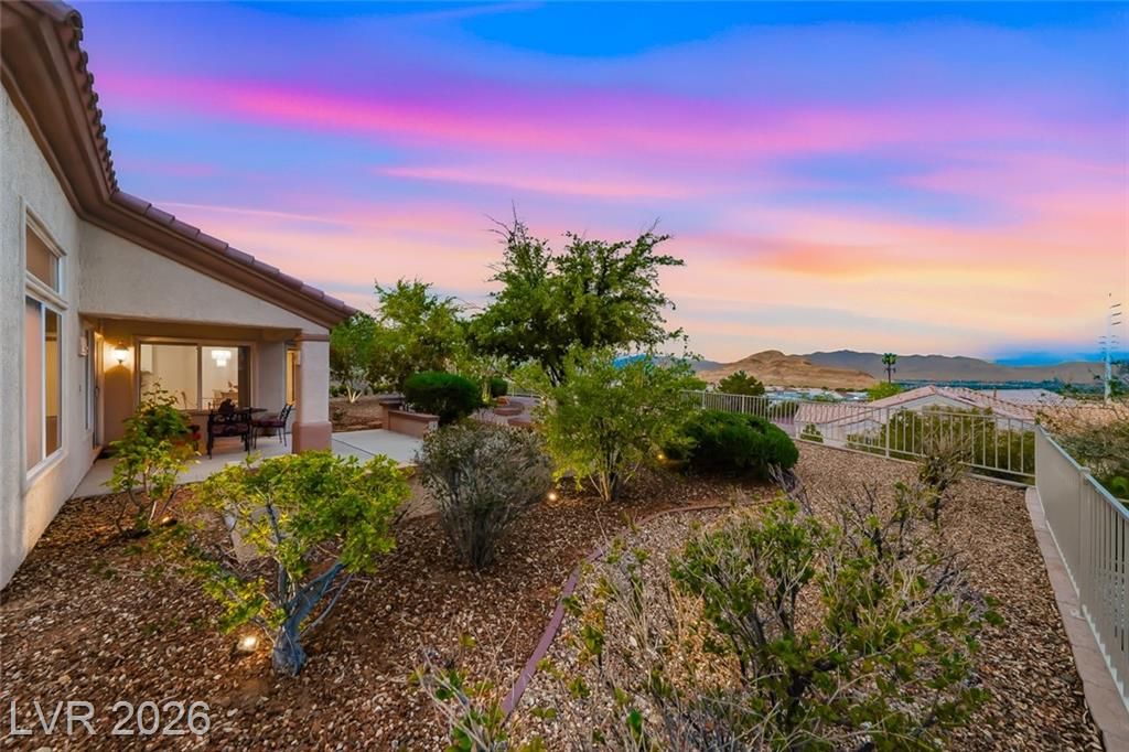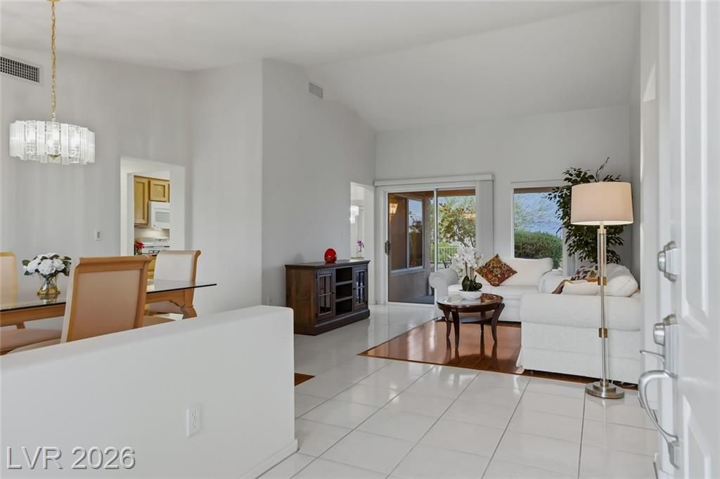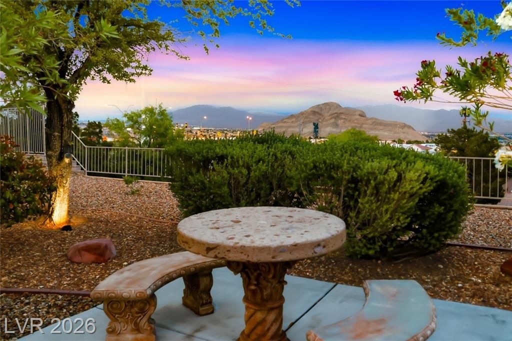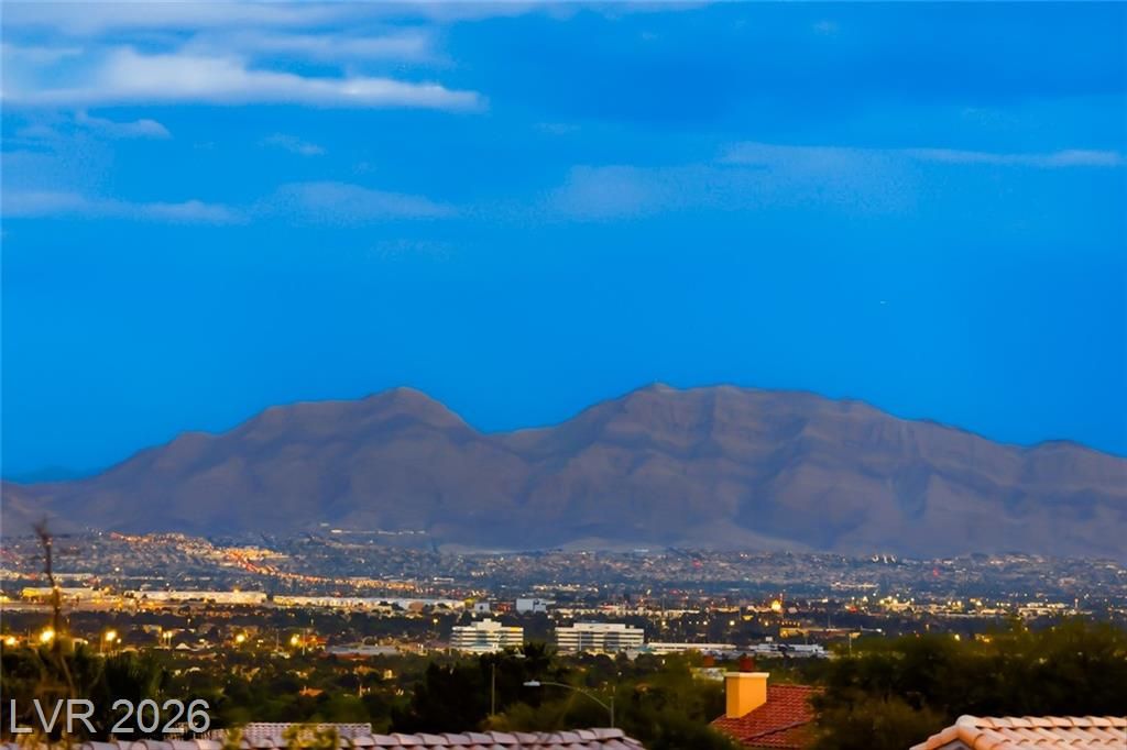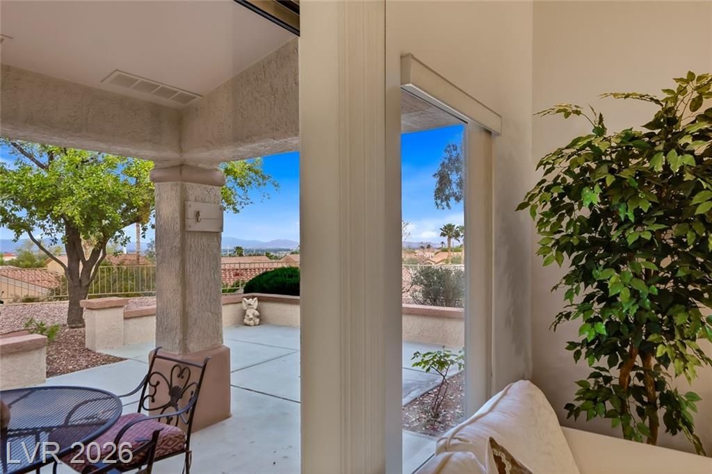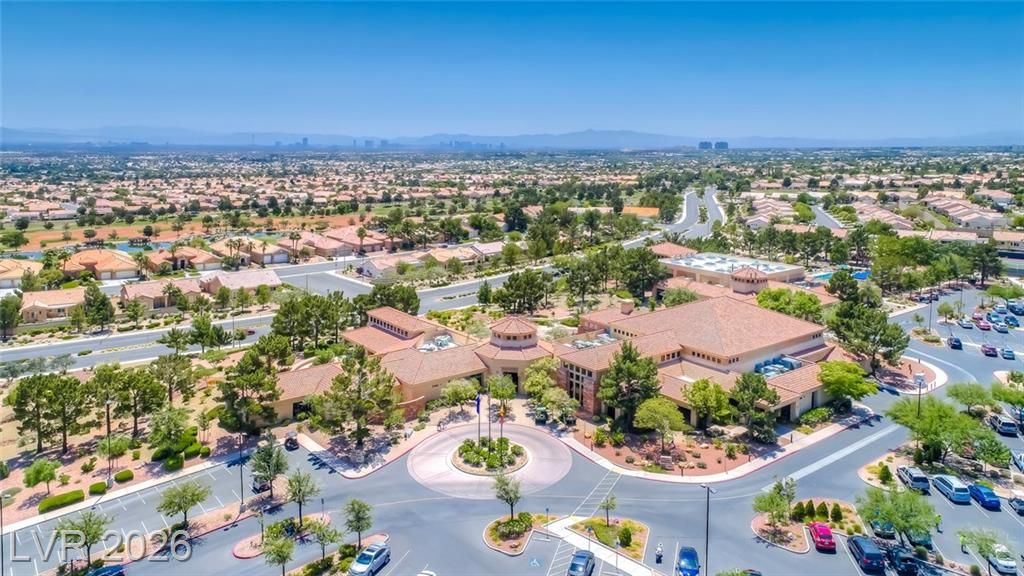 Welcome to Sun City Summerlin, a premier 55+ community ideally located near the Desert Vista Community Center. This beautifully maintained single-story home offers 2 bedrooms, 2 bathrooms, and sits on an oversized lot with stunning mountain and city views. The open-concept layout features vaulted ceilings in the living and dining areas, creating a bright and airy feel. The spacious primary suite includes a walk-in closet and an ensuite bath with a makeup vanity and walk-in shower. The secondary bedroom also offers a walk-in closet and ceiling fan. The kitchen is appointed with granite countertops and includes all appliances. Enjoy outdoor living under the covered patio—perfect for relaxing or entertaining.