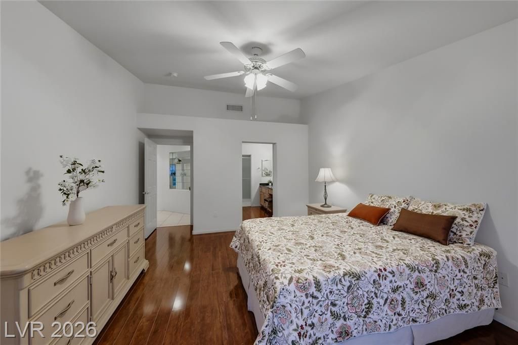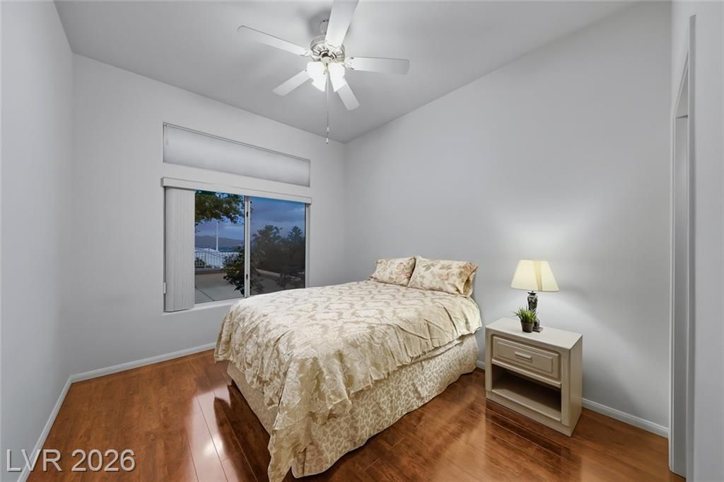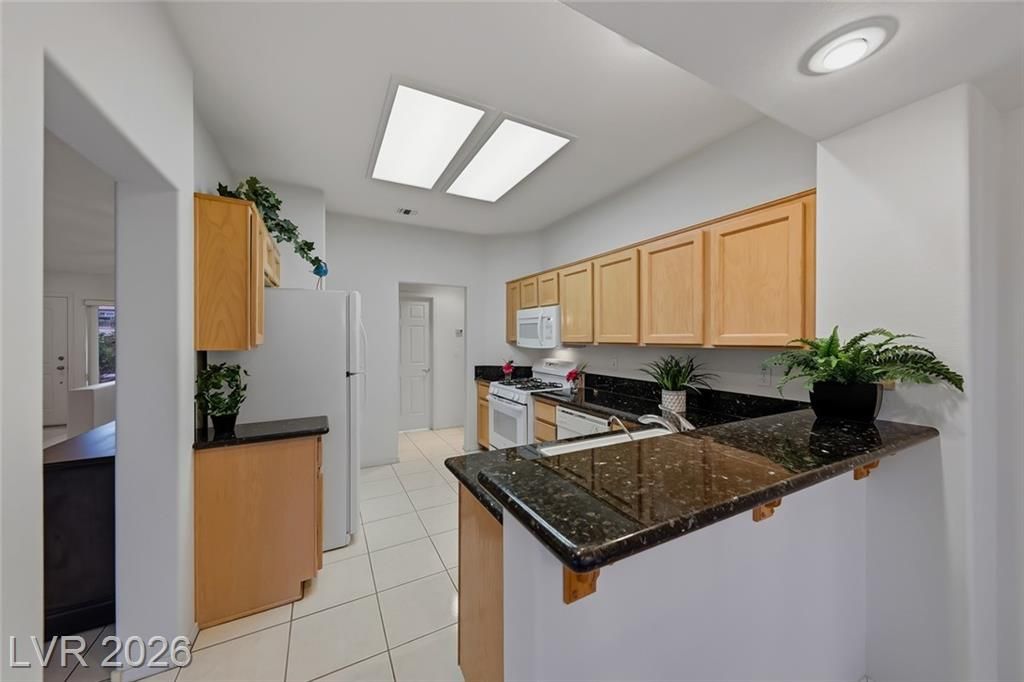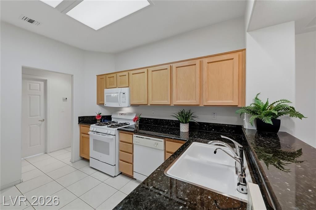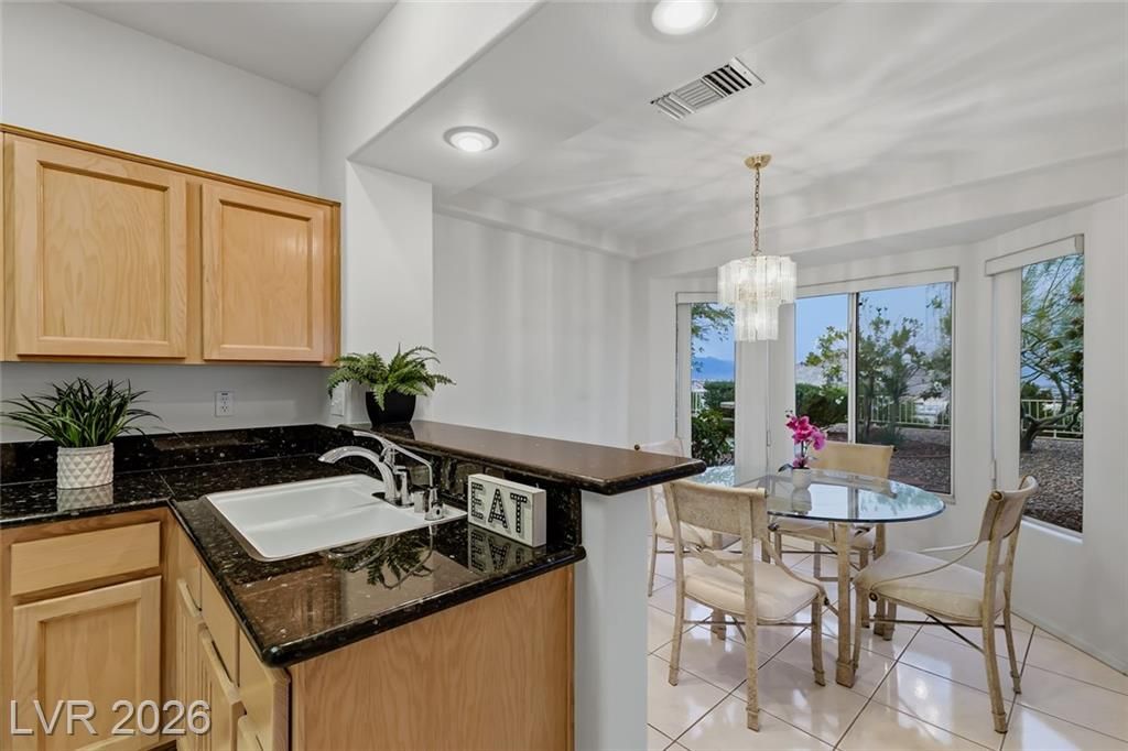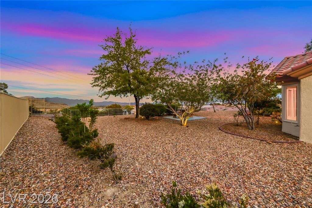 Welcome to Sun City Summerlin, a premier 55+ community ideally located near the Desert Vista Community Center. This beautifully maintained single-story home offers 2 bedrooms, 2 bathrooms, and sits on an oversized lot with stunning mountain and city views. The open-concept layout features vaulted ceilings in the living and dining areas, creating a bright and airy feel. The spacious primary suite includes a walk-in closet and an ensuite bath with a makeup vanity and walk-in shower. The secondary bedroom also offers a walk-in closet and ceiling fan. The kitchen is appointed with granite countertops and includes all appliances. Enjoy outdoor living under the covered patio—perfect for relaxing or entertaining.