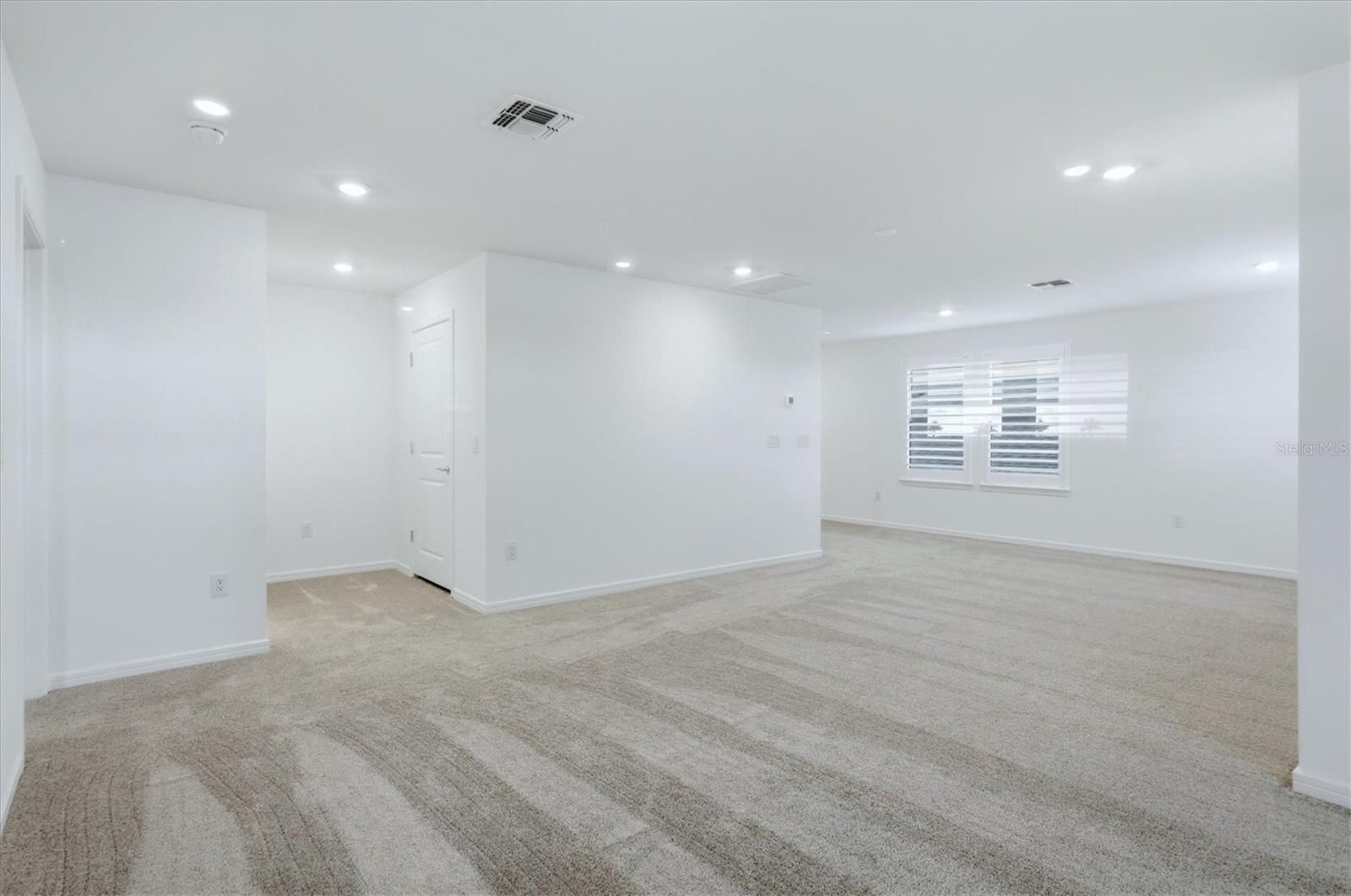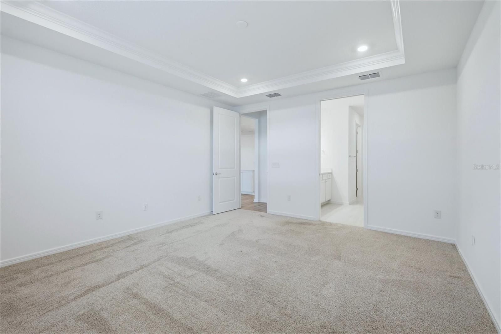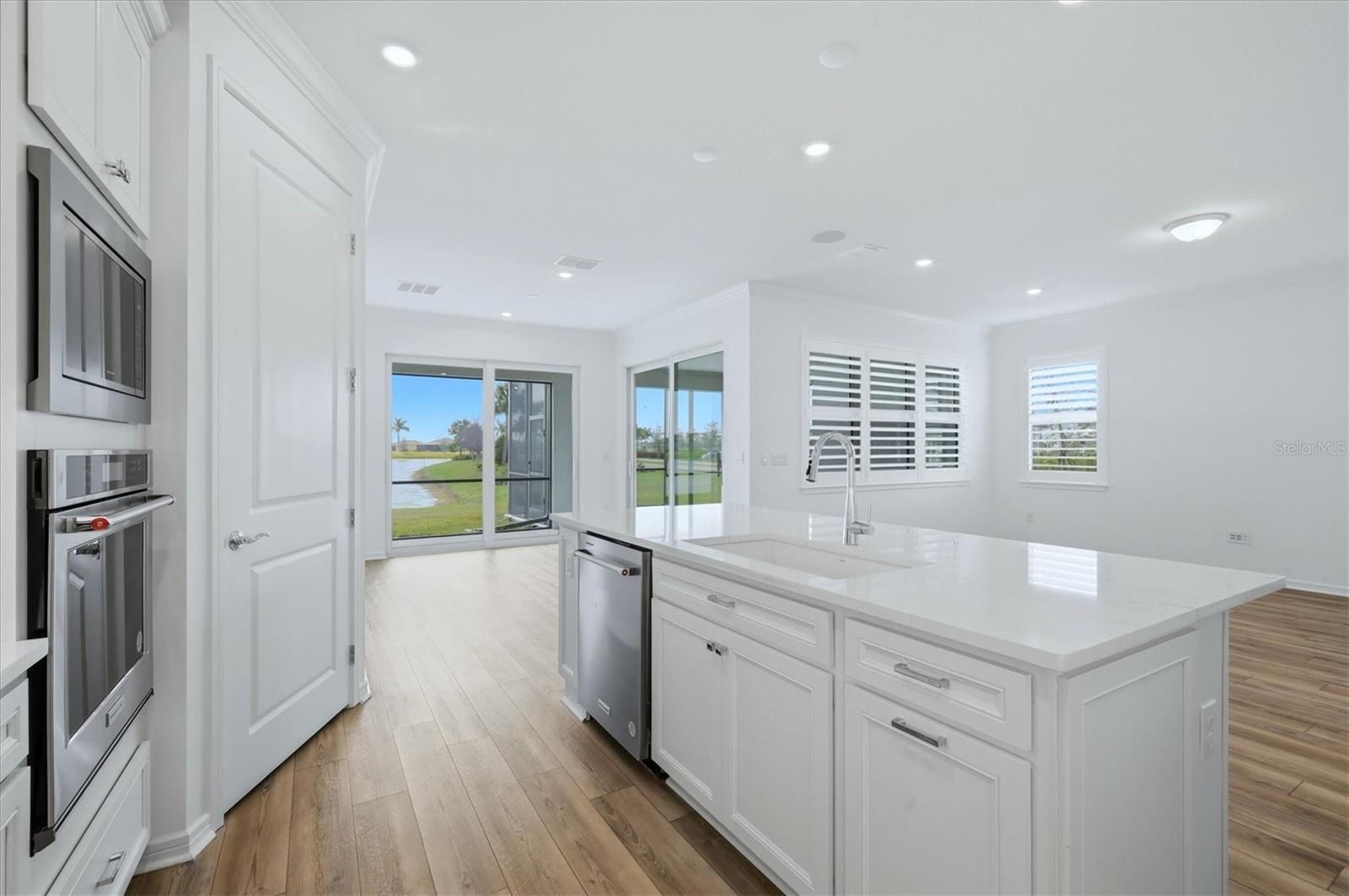 Like-new and barely lived in, this Mystique Grand floor plan offers beautiful water views and is just steps from the amenity center. This spacious home features 3 bedrooms, 3 bathrooms, and a private den with doors, making it the perfect home office or flex space. The first floor offers over 1,800 sq ft of open-concept living, featuring luxury vinyl plank flooring, custom plantation shutters, and a chef’s kitchen equipped with KitchenAid appliances. The main level includes two bedrooms and a private den, offering convenient everyday living and privacy for work or guests. The home also includes an oversized tandem garage, ideal for a golf cart, workshop, or additional storage. The expansive second floor is perfect for guests, complete with a large living area, bedroom, and full bathroom—creating a private retreat for visitors. Situated on a premium corner lot with serene water views, the home also features a large covered lanai, perfect for relaxing or entertaining while enjoying the peaceful setting. Del Webb Bay View is a gated, active community offering amenities like fitness, bocce, pickleball, tennis, shuffleboard, numerous clubs, a heated walk-in pool, resistance pool, community garden, and on-site restaurant—all in a golf cart-friendly neighborhood