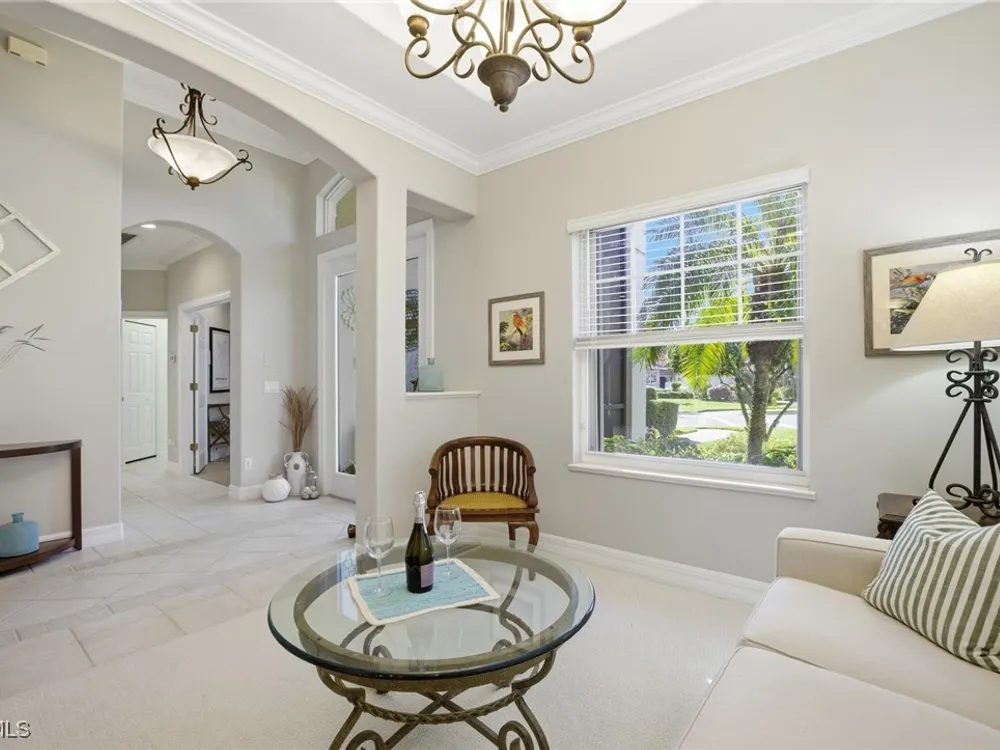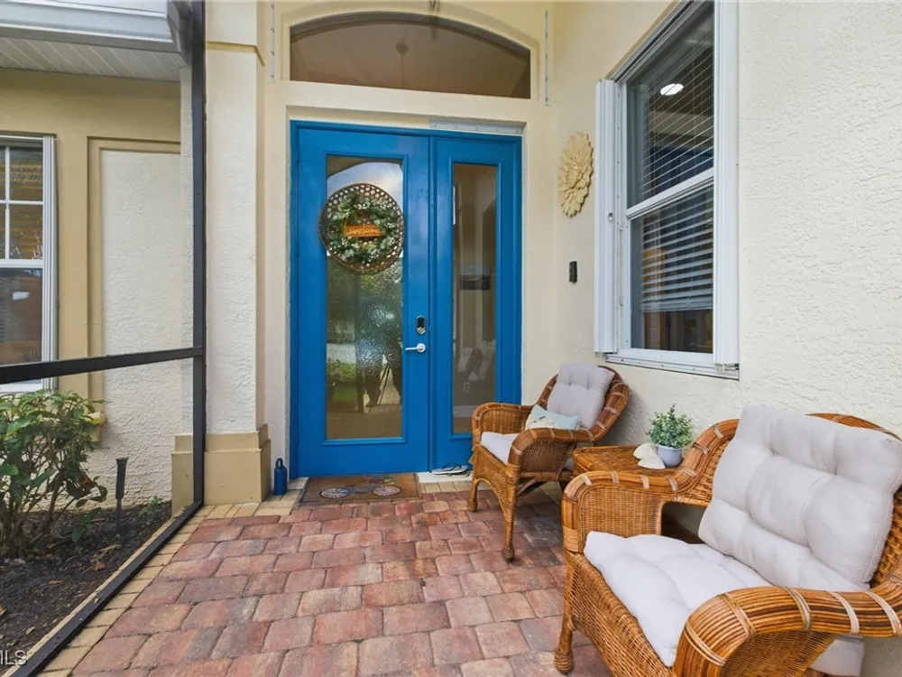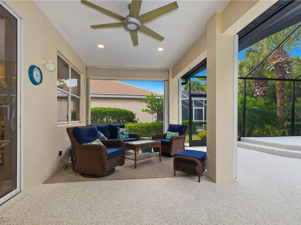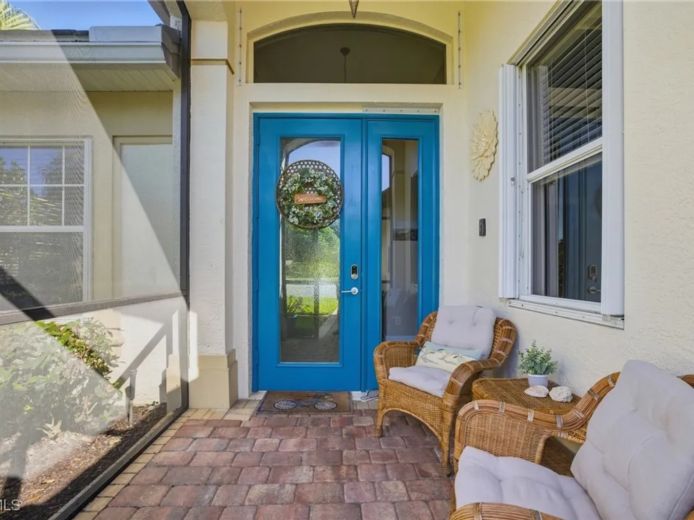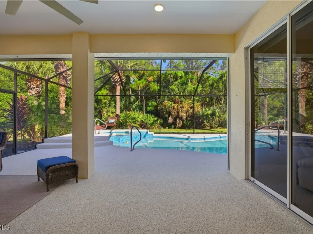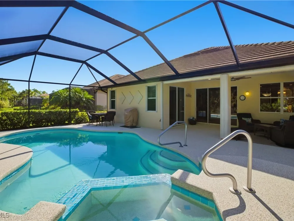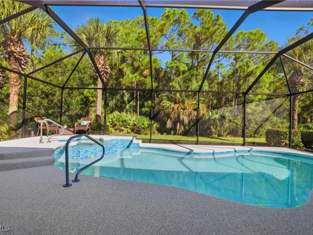 LOCATION! LOCATION! LOCATION! Imagine the convenience of being within walking distance to the Town Center, walking trails, tennis and pickleball courts, swimming pools, fitness center, farmers market, restaurants like Flip Flops and Destinations, and the amphitheater for concerts. You can even walk to the golf course if you desire. This was a WCI model home and has amazing 13' ceilings and 8'doors. This home boasts over $85,000 in recent upgrades, all completed for you. The recently renovated pool and cage area feature a sparkling blue saltwater pool and spa with a new heater that can be controlled from your phone. The deck has been resurfaced with a "soft on your feet" rubber concrete surface. There is ample space for relaxation or entertaining under cover and on the pool deck. The property backs up to a preserve area, offering privacy and tranquility, with deer often spotted in the vicinity. The Barcelona floor plan includes a great room, flex room, den, and two bedrooms. The entry features a screen-enclosed entryway to welcome guests. The entire interior has been repainted, with new carpet, crown molding throughout, new kitchen appliances, a brand-new AC unit, and a water treatment system. Another special feature of this home is that there is natural gas being used for the water heater, dryer, cook top and grill. The roof is only five years old, and all windows are equipped with accordion shutters for added protection. This home is sure to attract attention and offers the opportunity to live the dream in Pelican Preserve, a sought-after 55+ community that has received national recognition for its exceptional lifestyle amenities. Don't miss out on the chance to experience the best of what this community has to offer. You will love it here.