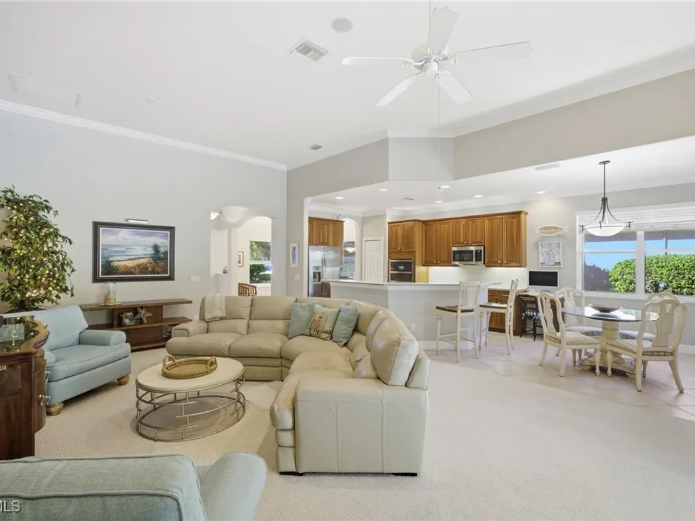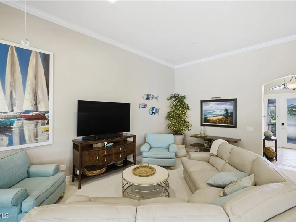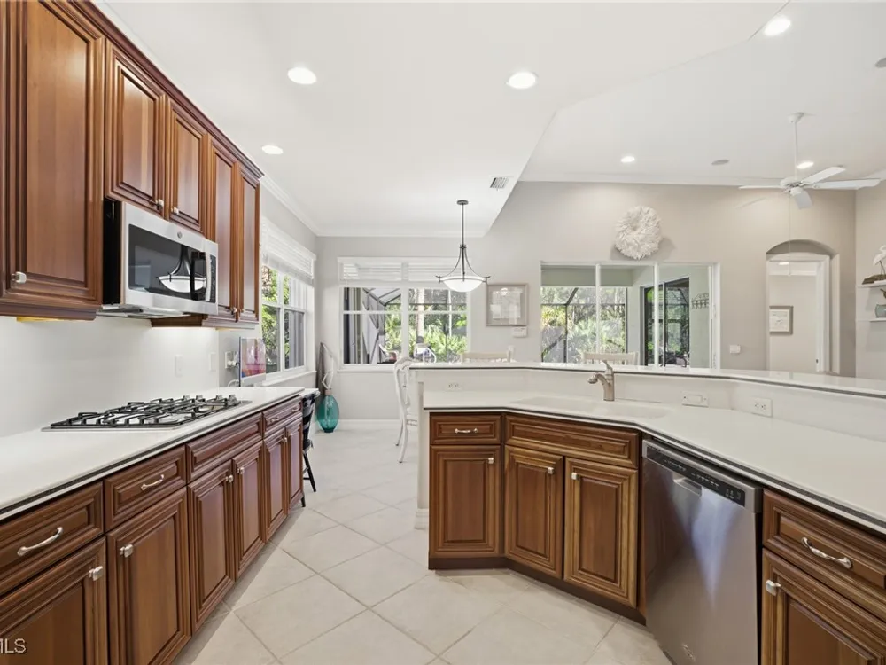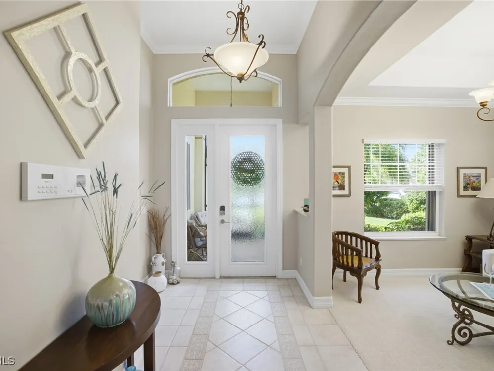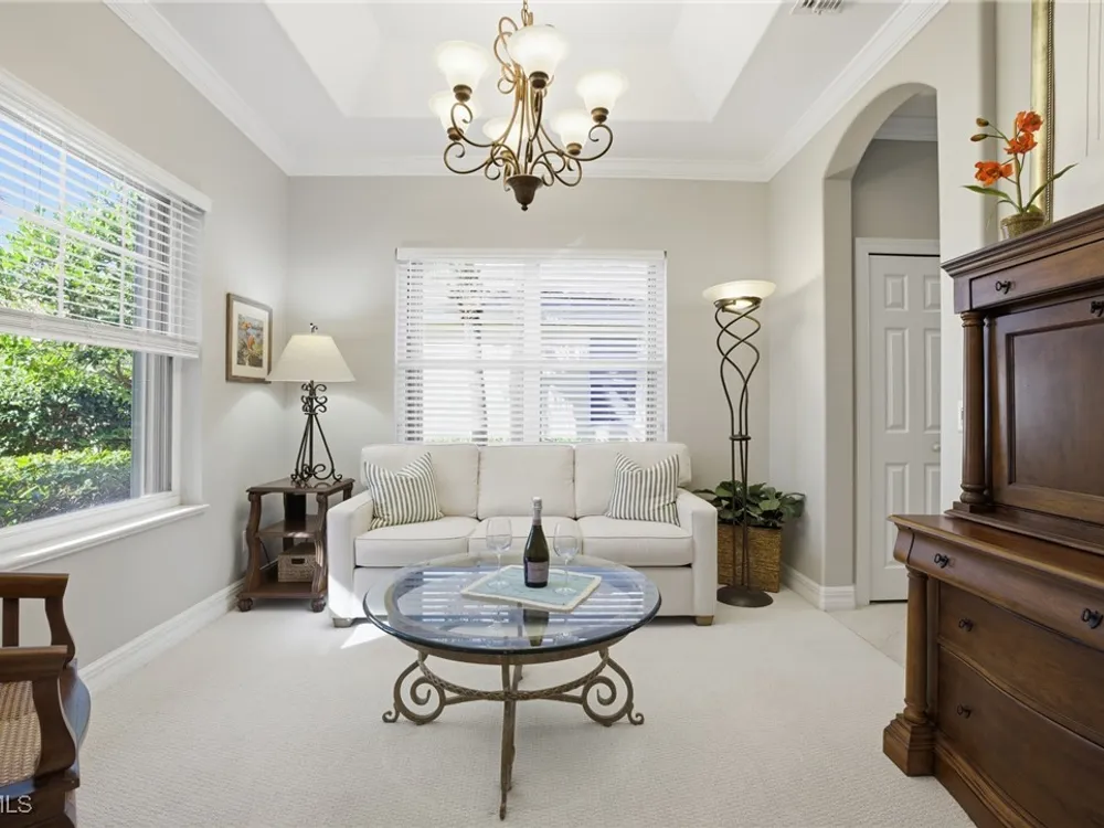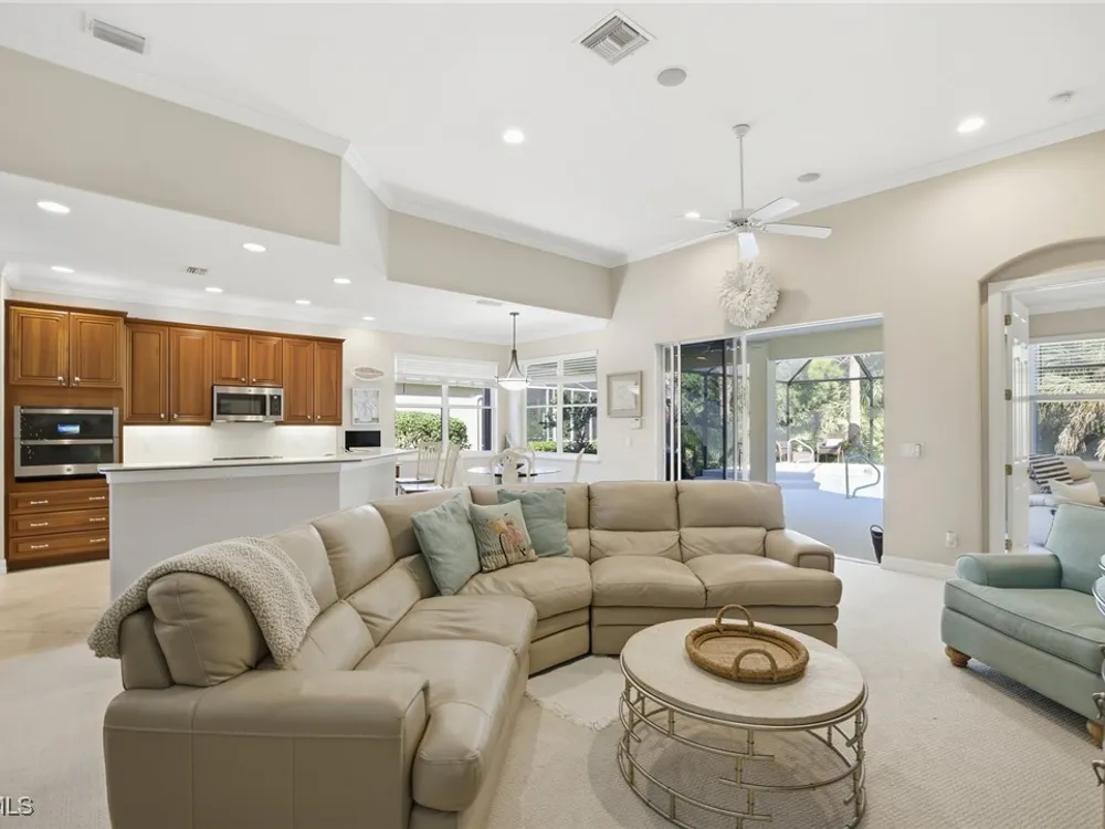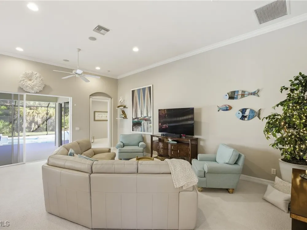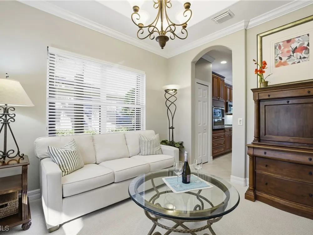 LOCATION! LOCATION! LOCATION! Imagine the convenience of being within walking distance to the Town Center, walking trails, tennis and pickleball courts, swimming pools, fitness center, farmers market, restaurants like Flip Flops and Destinations, and the amphitheater for concerts. You can even walk to the golf course if you desire. This was a WCI model home and has amazing 13' ceilings and 8'doors. This home boasts over $85,000 in recent upgrades, all completed for you. The recently renovated pool and cage area feature a sparkling blue saltwater pool and spa with a new heater that can be controlled from your phone. The deck has been resurfaced with a "soft on your feet" rubber concrete surface. There is ample space for relaxation or entertaining under cover and on the pool deck. The property backs up to a preserve area, offering privacy and tranquility, with deer often spotted in the vicinity. The Barcelona floor plan includes a great room, flex room, den, and two bedrooms. The entry features a screen-enclosed entryway to welcome guests. The entire interior has been repainted, with new carpet, crown molding throughout, new kitchen appliances, a brand-new AC unit, and a water treatment system. Another special feature of this home is that there is natural gas being used for the water heater, dryer, cook top and grill. The roof is only five years old, and all windows are equipped with accordion shutters for added protection. This home is sure to attract attention and offers the opportunity to live the dream in Pelican Preserve, a sought-after 55+ community that has received national recognition for its exceptional lifestyle amenities. Don't miss out on the chance to experience the best of what this community has to offer. You will love it here.