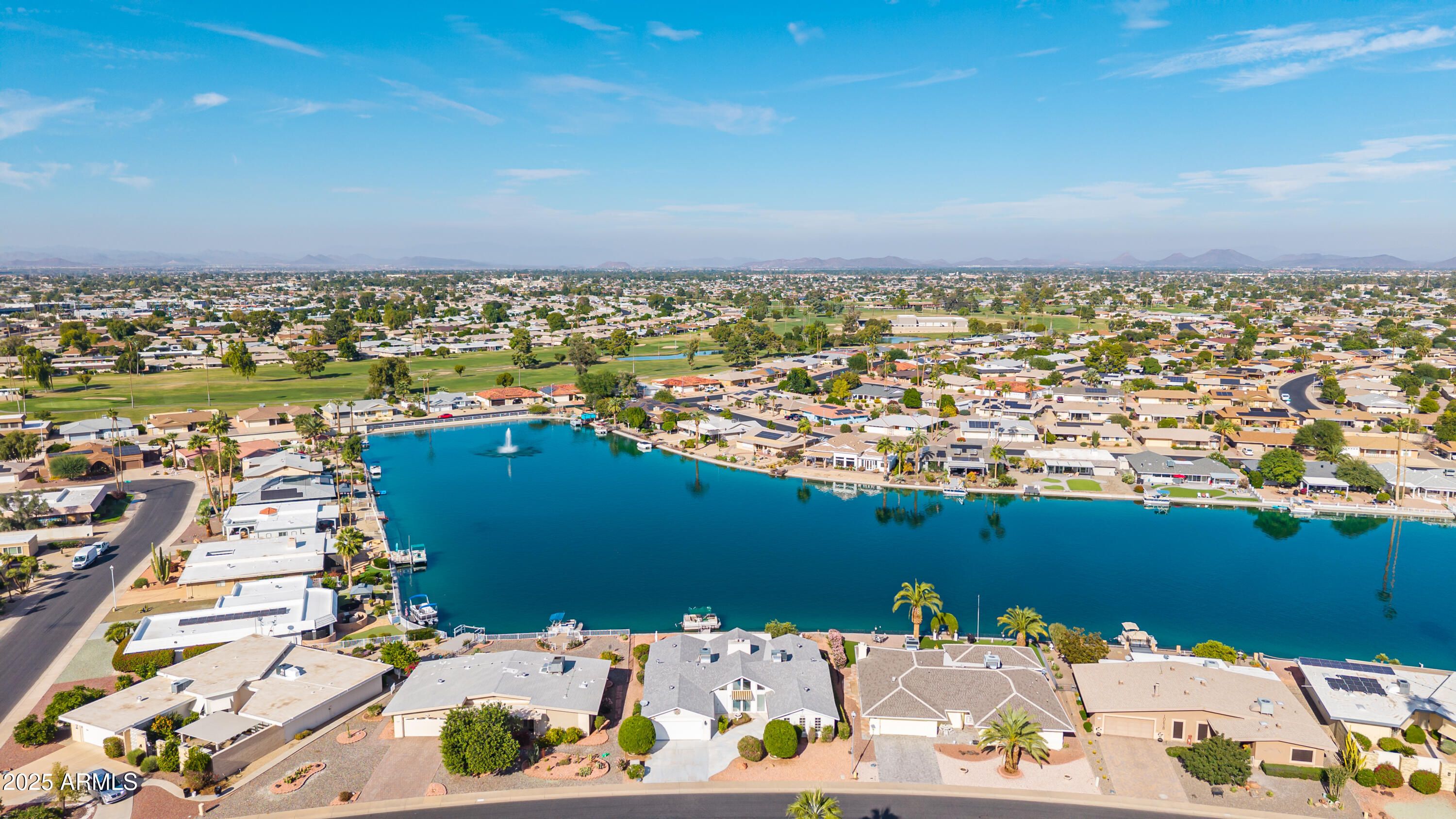 Enjoy stunning lake views from several rooms in this 3BR/3BA home on Viewpoint Lake in Sun City's sought-after age-restricted community. Step into a spacious living room with vaulted ceilings and a cozy fireplace, then stroll into the family room—complete with a second fireplace and panoramic water views. The kitchen offers abundant counter space and stainless appliances, with a nearby laundry room and separate den. The primary suite features a bay window overlooking the lake and an en suite bath. Bedroom 2 includes access to extra storage and a golf cart garage, while Bedroom 3 is conveniently located near a full bath. Relax year-round on the covered patio and soak in the serene lakeside setting. Eighty-one homes surround the 33 acre lake, which boasts many activities!