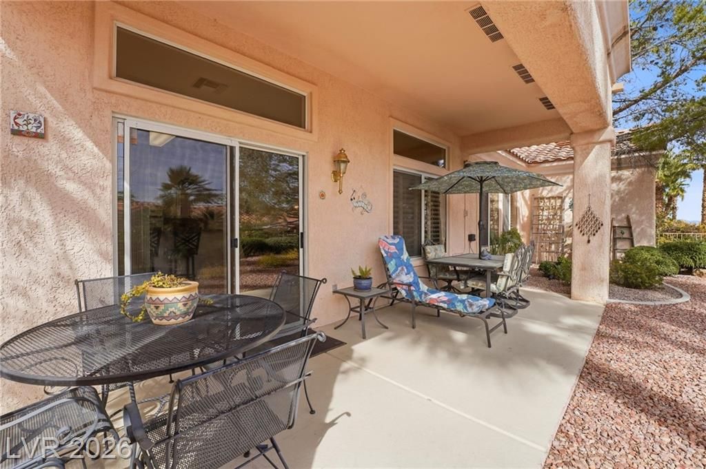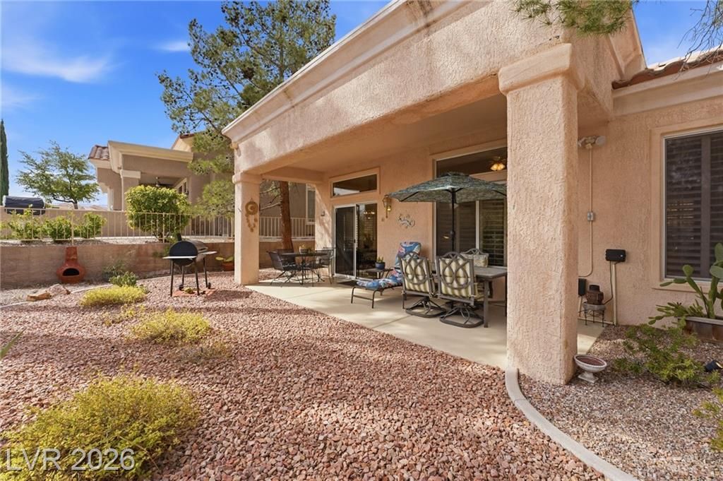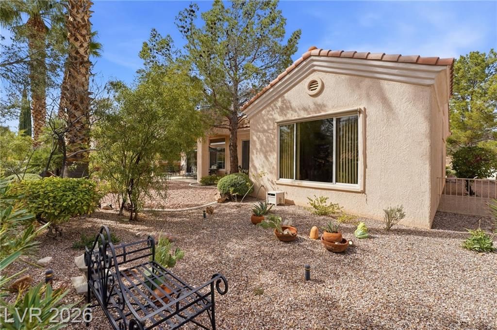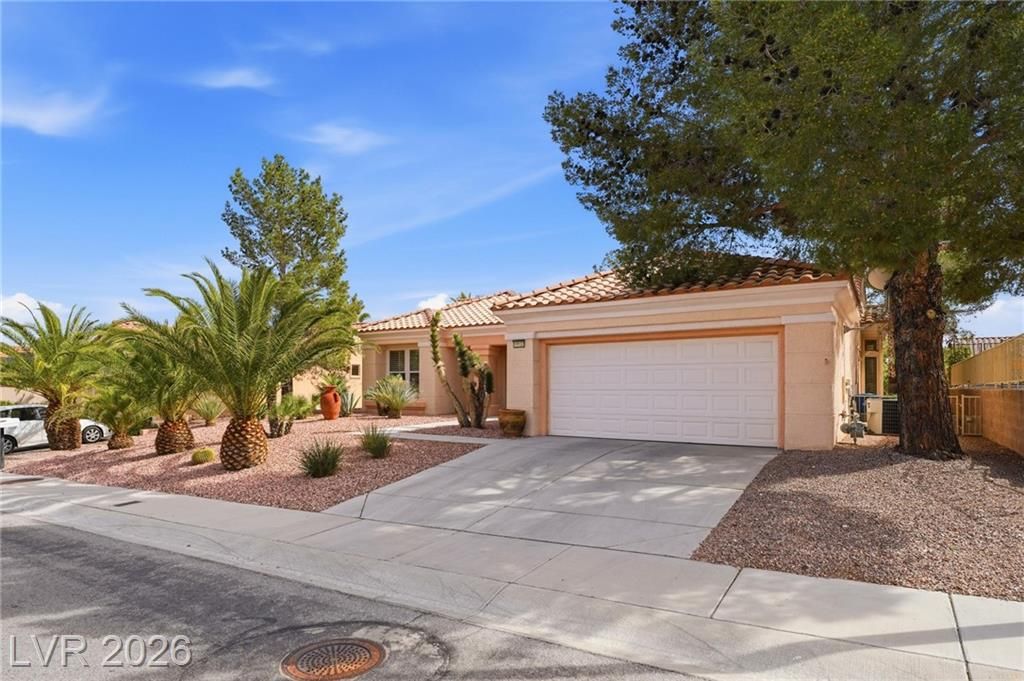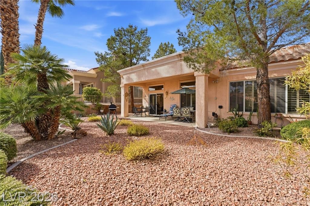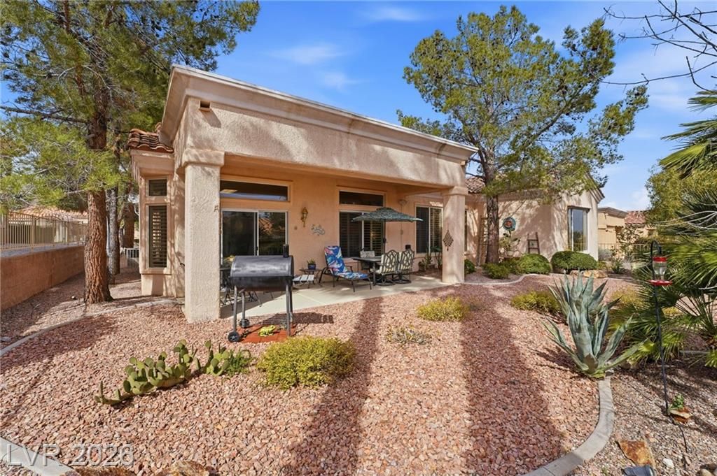 This well-maintained home in an age restricted 55+ master plan retirement community, has a fully fenced backyard with two side gates and over 100 lush plants, creating a private park like setting. Enjoy a large covered patio, perfect for relaxing or entertaining. The kitchen features granite countertops, a breakfast nook with sliding glass doors, new stainless steel stove and hood, and a new dishwasher. Travertine tile floors enhance the kitchen, baths equipped with grab bars, and family room, while both bedrooms have newer carpet. The primary suite offers backyard views, double sinks, spacious closet, and easy entry shower. The home includes shutters throughout, ceiling fans, updated fixtures, newer water heater, laundry room with storage, and garage workshop with golf cart space.Summerlin Sun City, consistently one of the countries top retirement communities, the home is minutes from Downtown Summerlin shopping, local golf courses, and community walking trails.