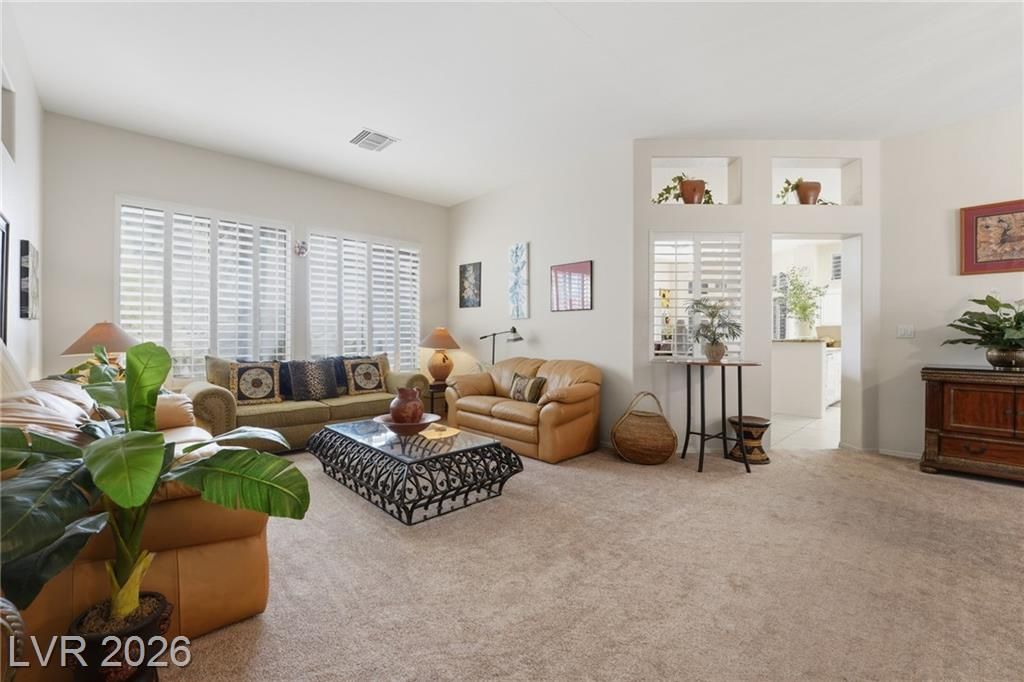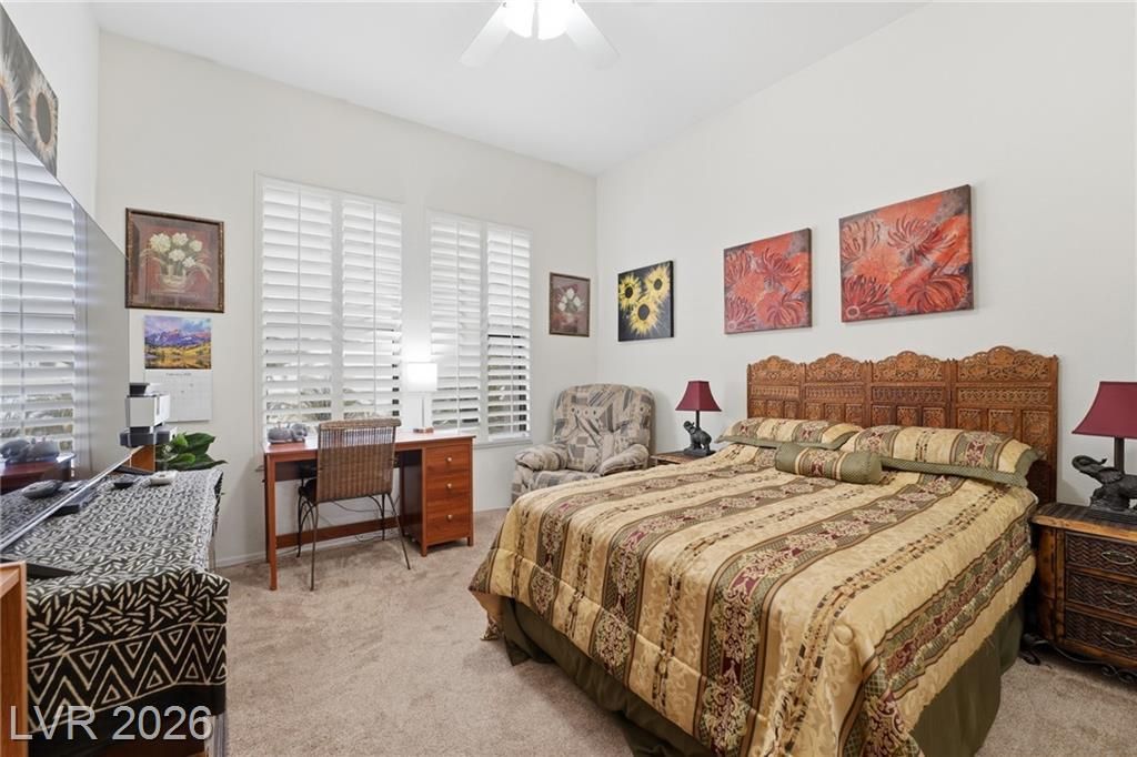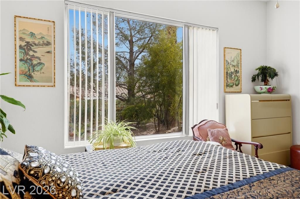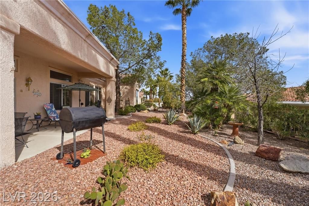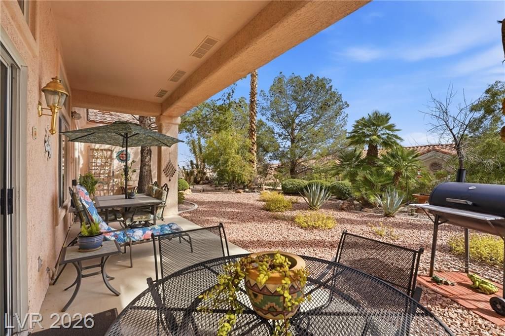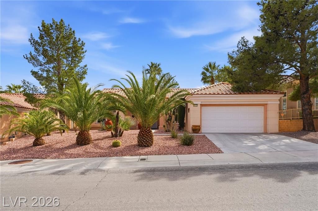 This well-maintained home in an age restricted 55+ master plan retirement community, has a fully fenced backyard with two side gates and over 100 lush plants, creating a private park like setting. Enjoy a large covered patio, perfect for relaxing or entertaining. The kitchen features granite countertops, a breakfast nook with sliding glass doors, new stainless steel stove and hood, and a new dishwasher. Travertine tile floors enhance the kitchen, baths equipped with grab bars, and family room, while both bedrooms have newer carpet. The primary suite offers backyard views, double sinks, spacious closet, and easy entry shower. The home includes shutters throughout, ceiling fans, updated fixtures, newer water heater, laundry room with storage, and garage workshop with golf cart space.Summerlin Sun City, consistently one of the countries top retirement communities, the home is minutes from Downtown Summerlin shopping, local golf courses, and community walking trails.
