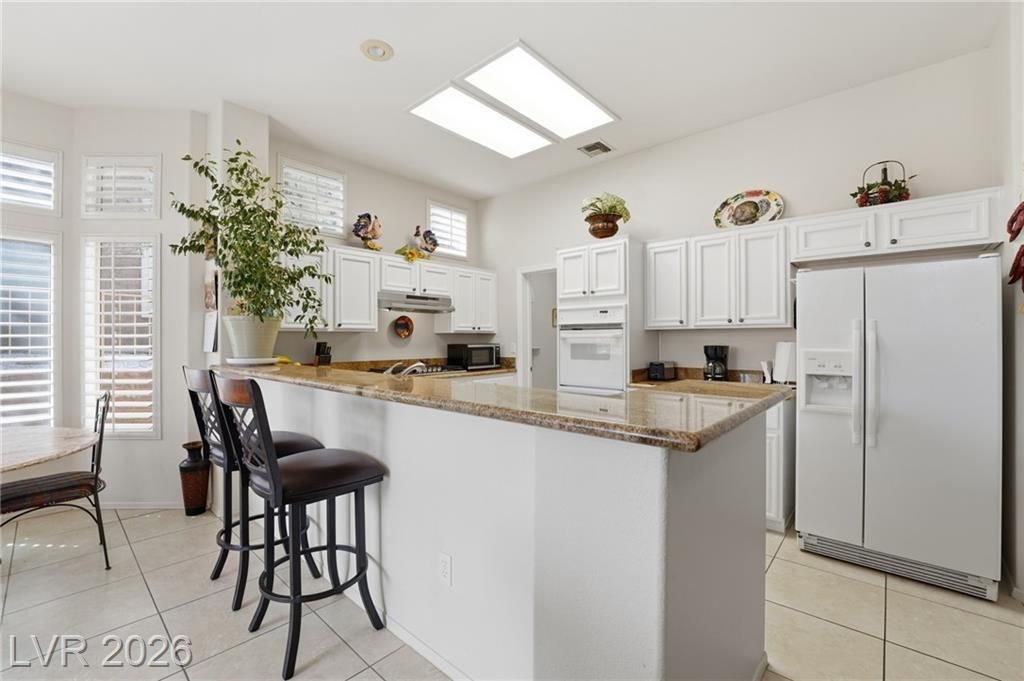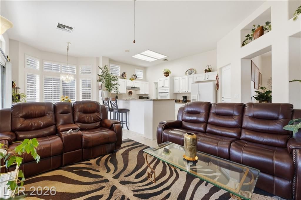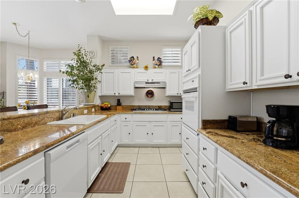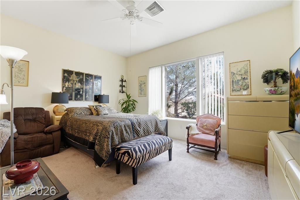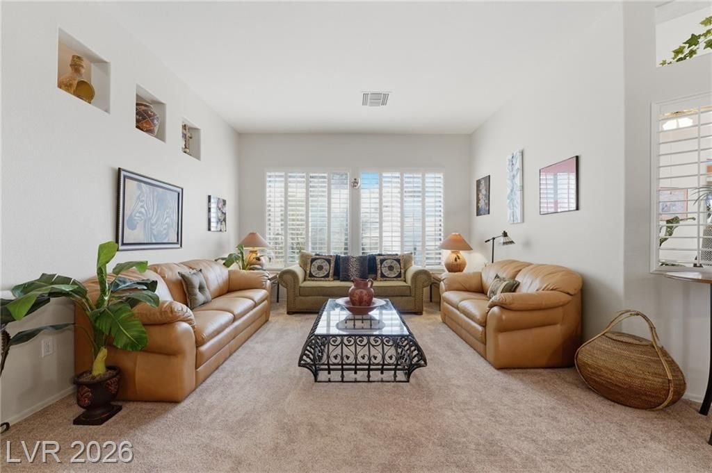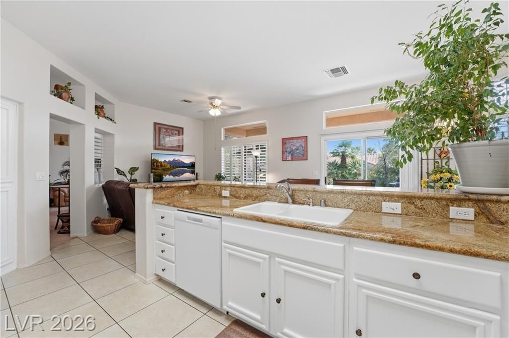 This well-maintained home in an age restricted 55+ master plan retirement community, has a fully fenced backyard with two side gates and over 100 lush plants, creating a private park like setting. Enjoy a large covered patio, perfect for relaxing or entertaining. The kitchen features granite countertops, a breakfast nook with sliding glass doors, new stainless steel stove and hood, and a new dishwasher. Travertine tile floors enhance the kitchen, baths equipped with grab bars, and family room, while both bedrooms have newer carpet. The primary suite offers backyard views, double sinks, spacious closet, and easy entry shower. The home includes shutters throughout, ceiling fans, updated fixtures, newer water heater, laundry room with storage, and garage workshop with golf cart space.Summerlin Sun City, consistently one of the countries top retirement communities, the home is minutes from Downtown Summerlin shopping, local golf courses, and community walking trails.