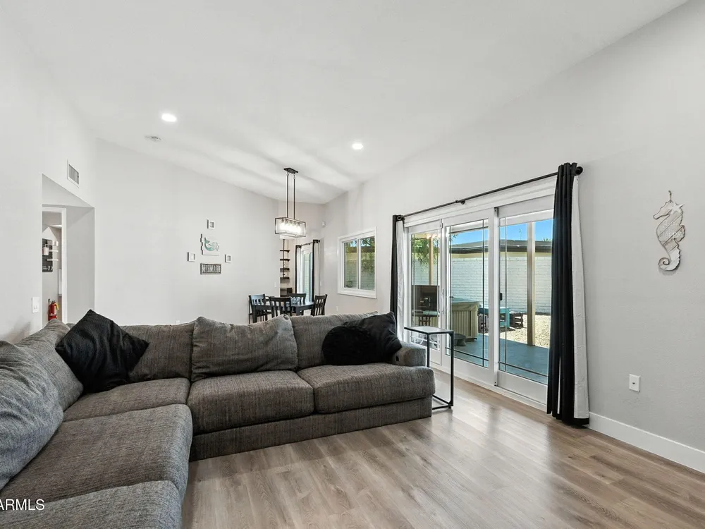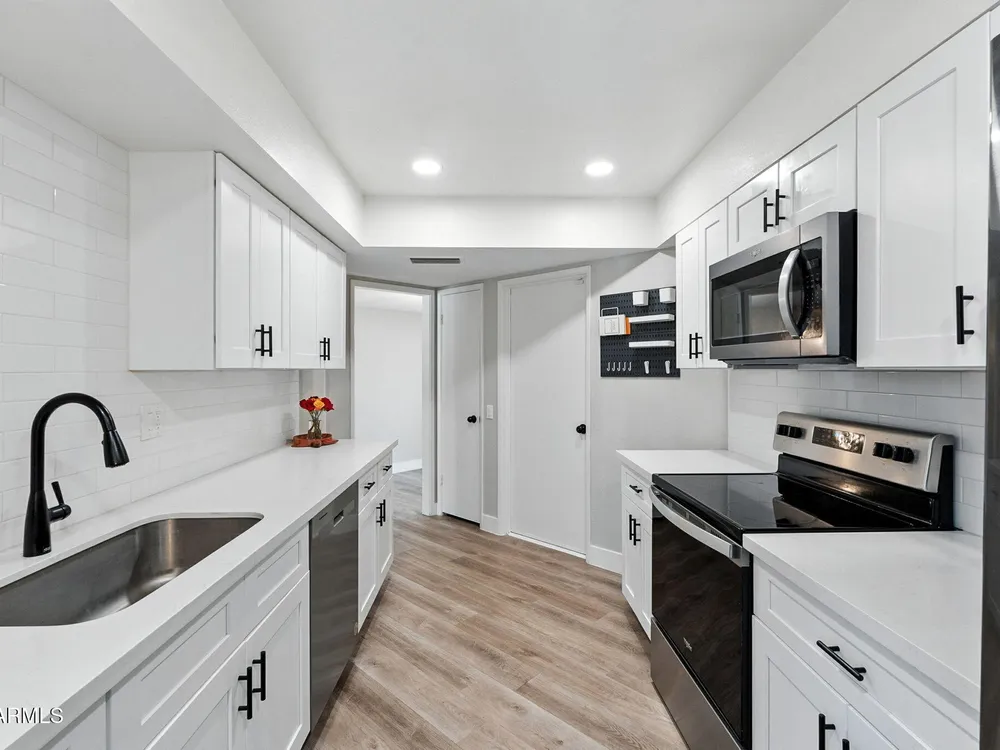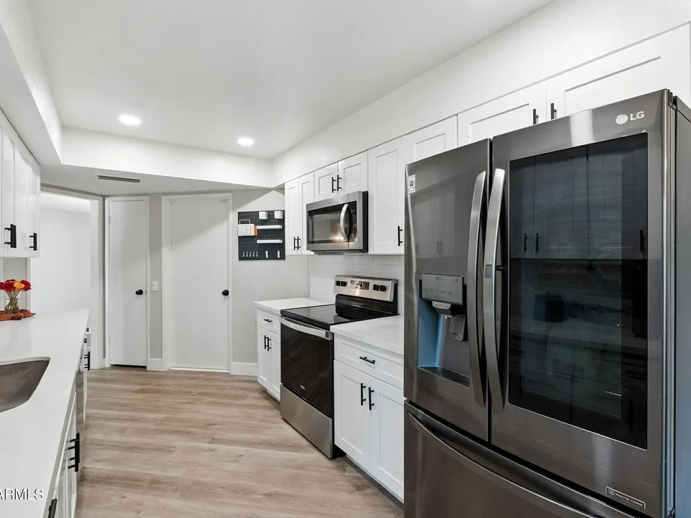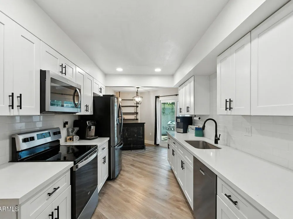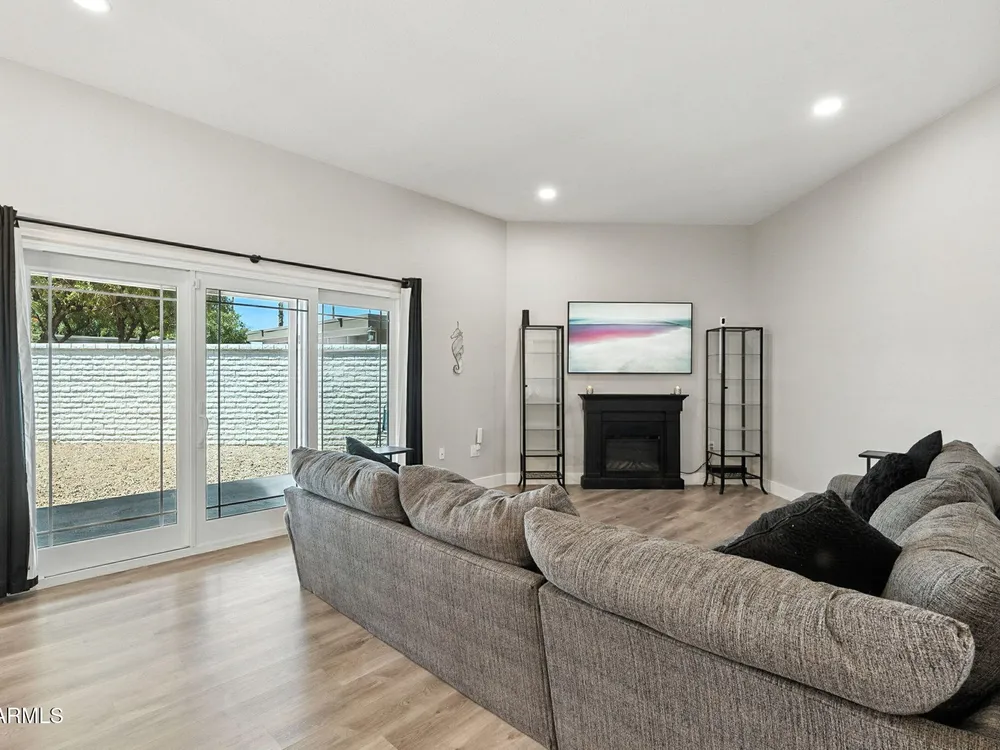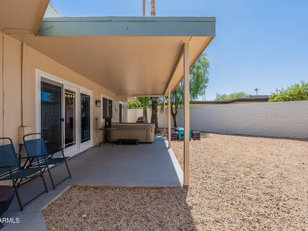 Fully remodeled gem in the heart of Sun City's vibrant 55+ community. Thoughtfully updated w/modern finishes, this home features two spacious bedrooms, each with walk-in closets, & a stylish bathroom showcasing a custom-tiled walk-in shower. The modern chef's kitchen is complete w/ stainless steel appliances, crisp white shaker cabinetry, & quartz countertops. Enjoy peace of mind w/a NEW ROOF, NEW WINDOWS & glass slider door, fresh exterior paint & luxury vinyl wood look flooring. Outdoor living shines w/ large privately fenced backyard, inviting above ground spa & covered patio. Garage has golf cart parking & EV charger. Low-maintenance landscaping in both yards allows more time to enjoy Sun City's incredible amenities—golf, pools, recreation centers, clubs. Modern & Cozy. Move In Ready!