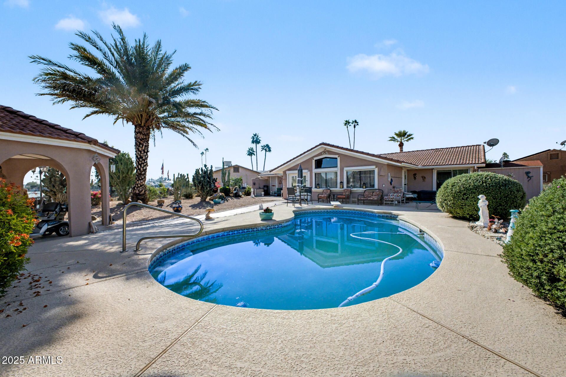 This beautifully Sun City home offers a exceptional combination of lake-front living, a spacious 3-bedroom layout, and a large 0.44-acre lot with a private diving pool. It features an eat-in kitchen, a bright great room, and a flexible office/den with its own exterior entrance. With fruit trees, tranquil outdoor space, and a prime location on Viewpoint Lake, this home blends relaxation, convenience, and resort-style living.