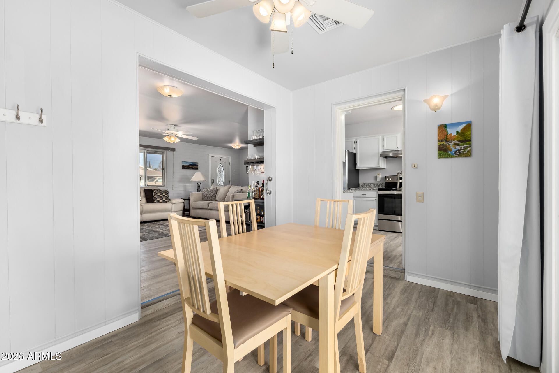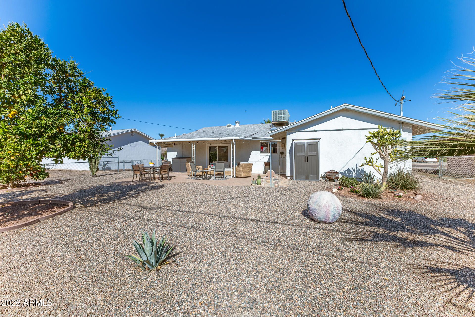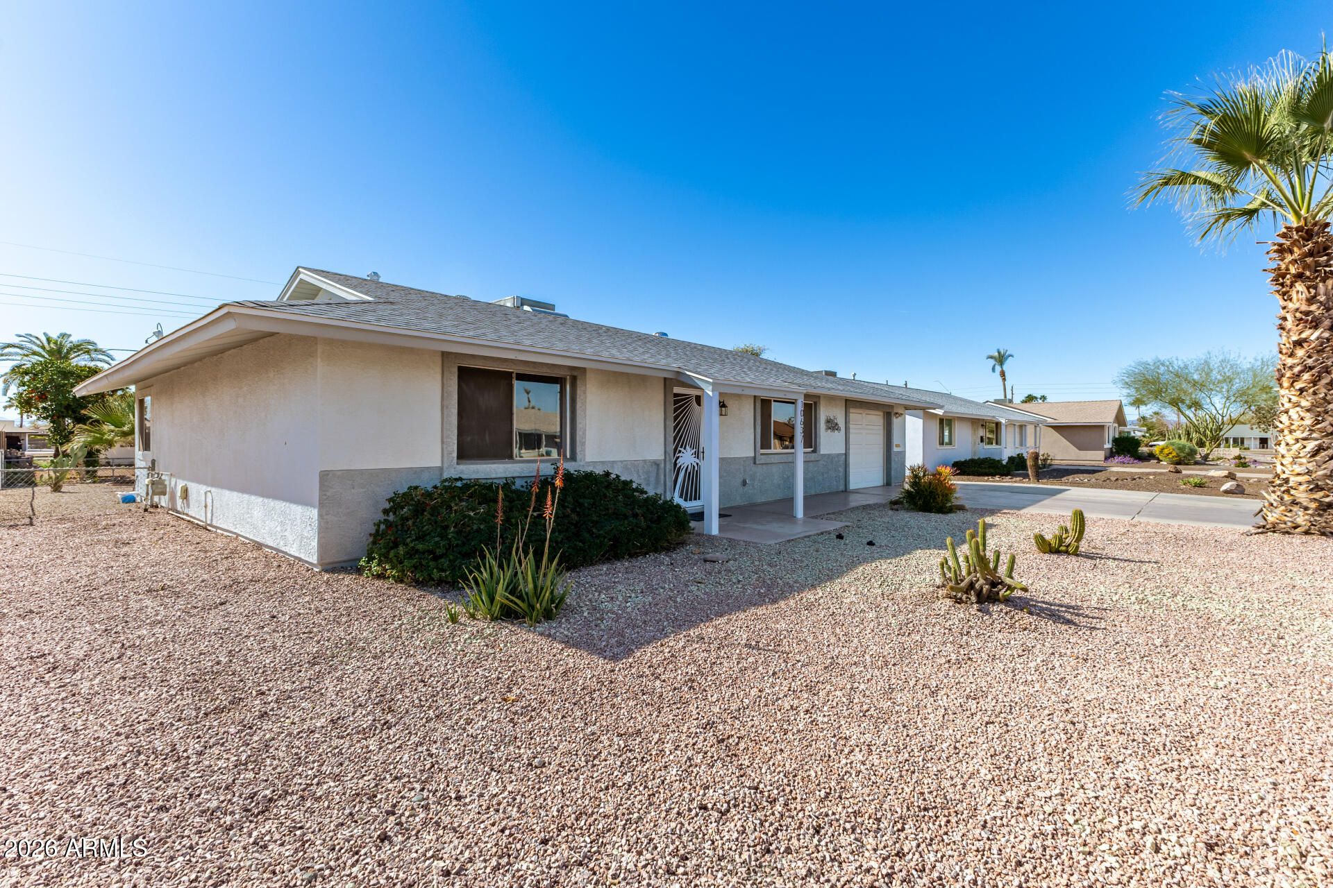 Introducing this charming single-story home in Sun City where comfort meets convenience. The open floor plan is filled with natural light and features a neutral palette, wood-look flooring, and ceiling fans throughout. The spotless kitchen offers recessed lighting, stainless steel appliances, and ample white cabinetry. Major updates include a new roof, sewer line, and electrical panel (2021), new flooring, sliding glass door, and laundry room barn door (2022), plus a new water heater and refreshed bathrooms with new lighting, vanities, and faucets (2025). The spacious backyard features a covered patio and fragrant citrus trees—perfect for relaxing outdoors. Move-in ready and not to be missed!