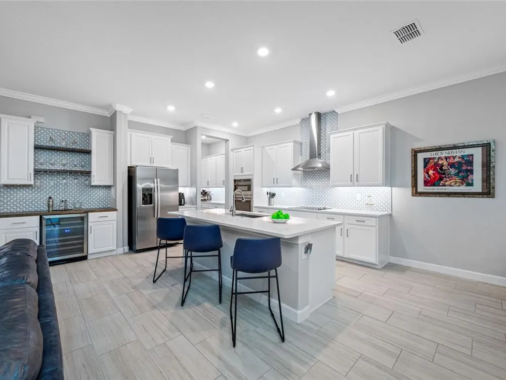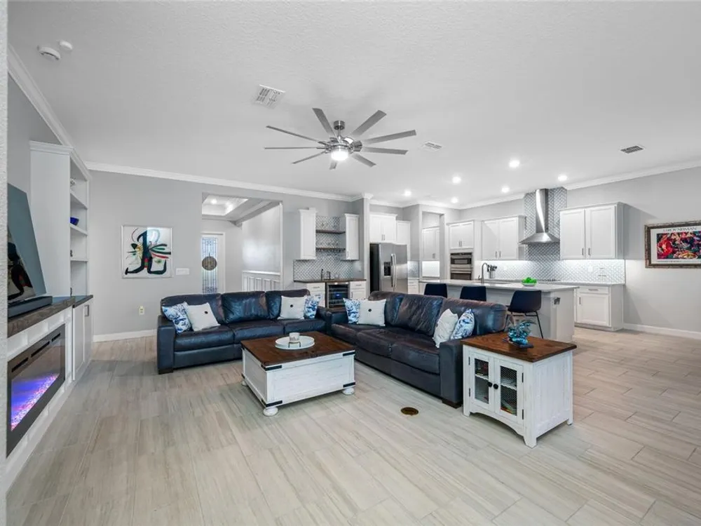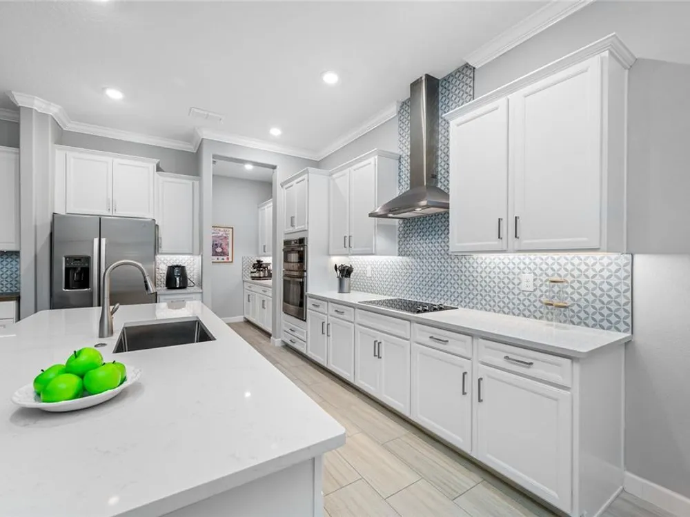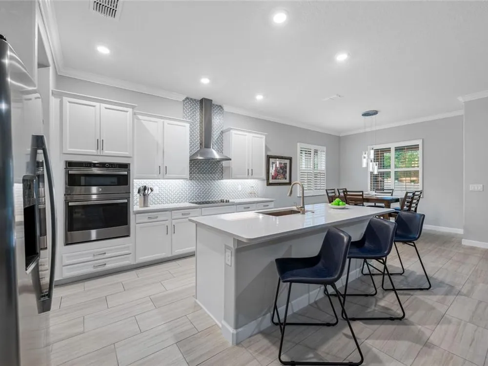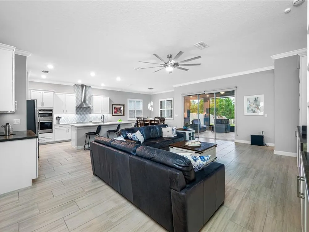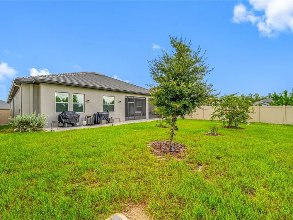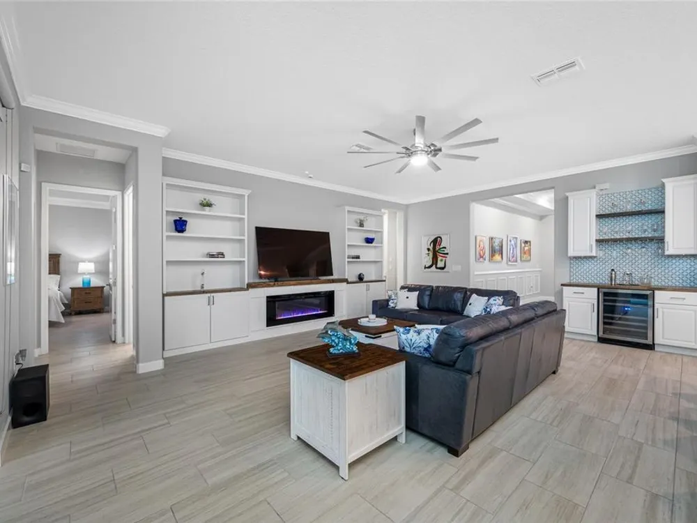 Welcome to this beautifully upgraded residence located in the heart of the vibrant, active adult community of Angeline – Medley in Land O’ Lakes, Florida. This thoughtfully designed home offers 3 spacious bedrooms, a dedicated home office, 2.5 bathrooms, and an array of high-end finishes throughout—all perfectly situated on a picturesque lot with tranquil views of the woods and pond. Step inside and be greeted by soaring ceilings, an open-concept floor plan, and abundant natural light that enhances the home’s bright, airy ambiance. The gourmet chef’s kitchen is the centerpiece of the home, featuring elegant 42” white cabinetry, quartz countertops, a stylish tile backsplash, stainless steel appliances, a butler’s pantry, and a custom walk-in pantry. A built-in bar adds a perfect touch for entertaining guests. The primary suite offers a peaceful retreat, complete with ample room for a king-size bed and a sitting area. The en-suite bath includes a spacious vanity, private water closet, and a large walk-in shower with built-in bench. A custom-designed walk-in closet with built-in drawers and shelving provides exceptional organization. Adjacent to the primary suite is a versatile office with a full wall of custom built-in bookcases and shelving—ideal for working from home or pursuing hobbies. A convenient powder room is located just across the hall. Two additional guest bedrooms are positioned at the front of the home, each with walk-in closets and a shared full bathroom featuring dual vanities. Additional highlights include: Oversized 2-car garage with a separate golf cart bay or extra storage. Built-in attic stairway leading to a bonus storage or flex space. Seamless gutters and fresh interior paint throughout. Located within the premier 55+ enclave of Angeline – Medley, this home provides access to a wide array of resort-style amenities. Enjoy miles of scenic walking and biking trails, a private clubhouse, resort-style pool, state-of-the-art fitness center, pickleball and tennis courts, and more. A community garden offers space for residents to grow their own produce, while future plans include a spectacular recreational lagoon and over 3,600 acres of green space to explore.The Angeline community also boasts convenient access to Moffitt Cancer Center’s new 775-acre Speros FL research campus, as well as a state-of-the-art STEM magnet school, positioning it as a hub for innovation, wellness, and lifelong learning. This home combines elegant living, modern functionality, and a thriving community lifestyle—don’t miss your opportunity to make it yours.