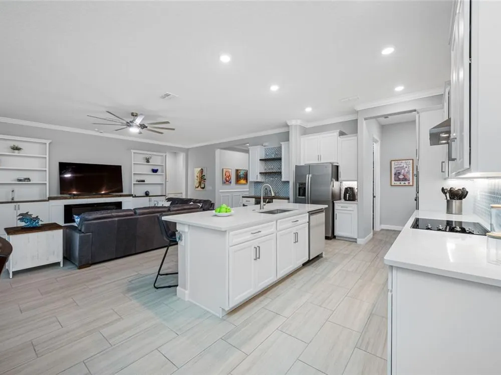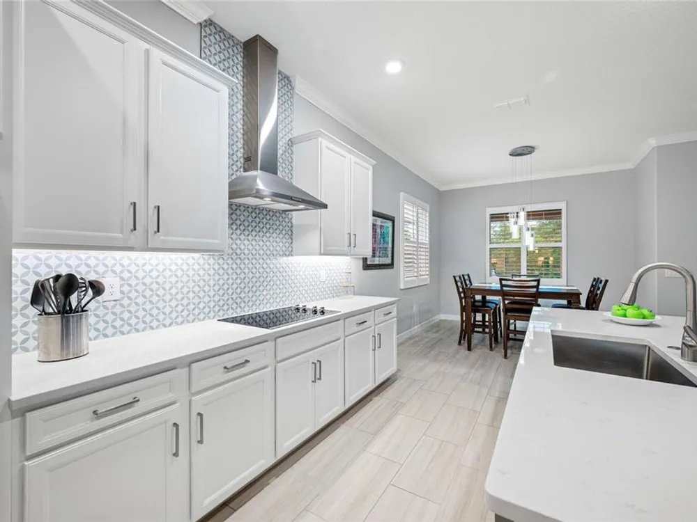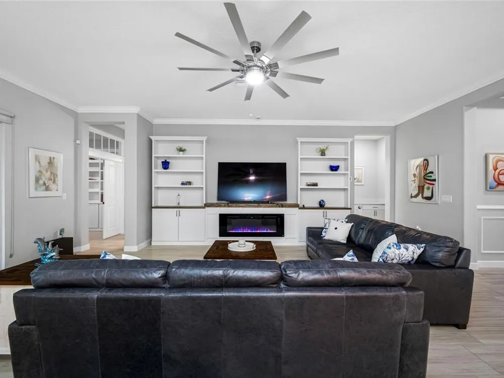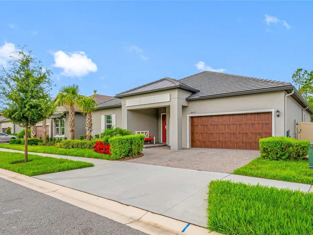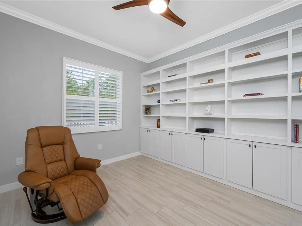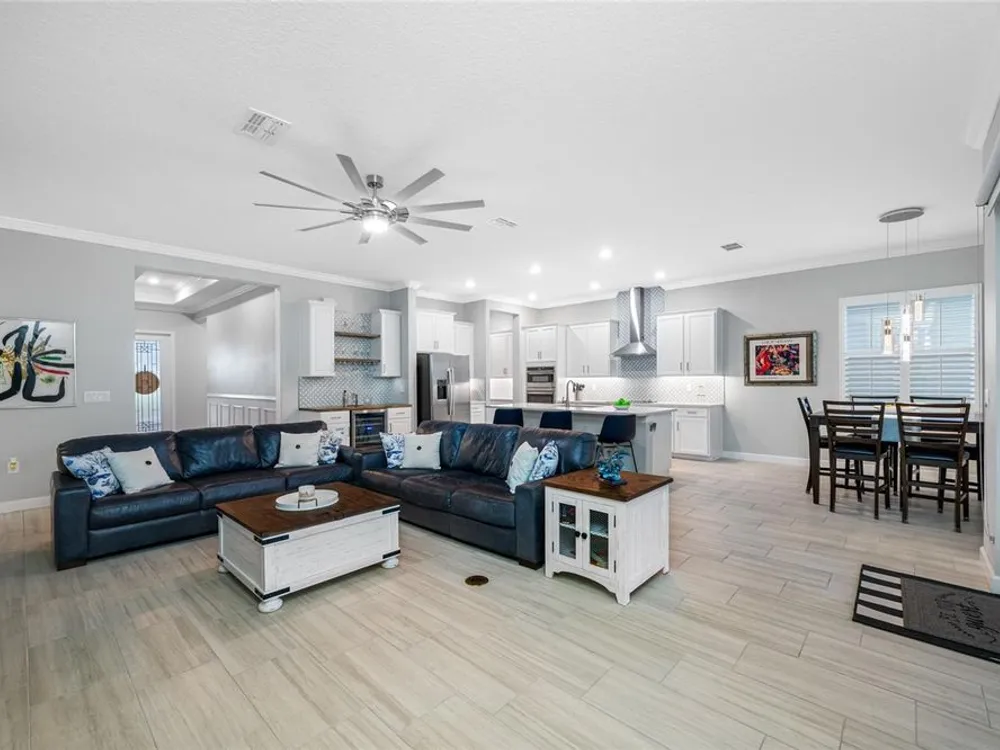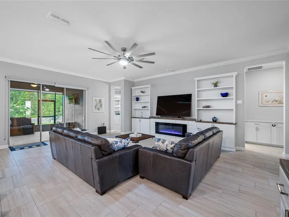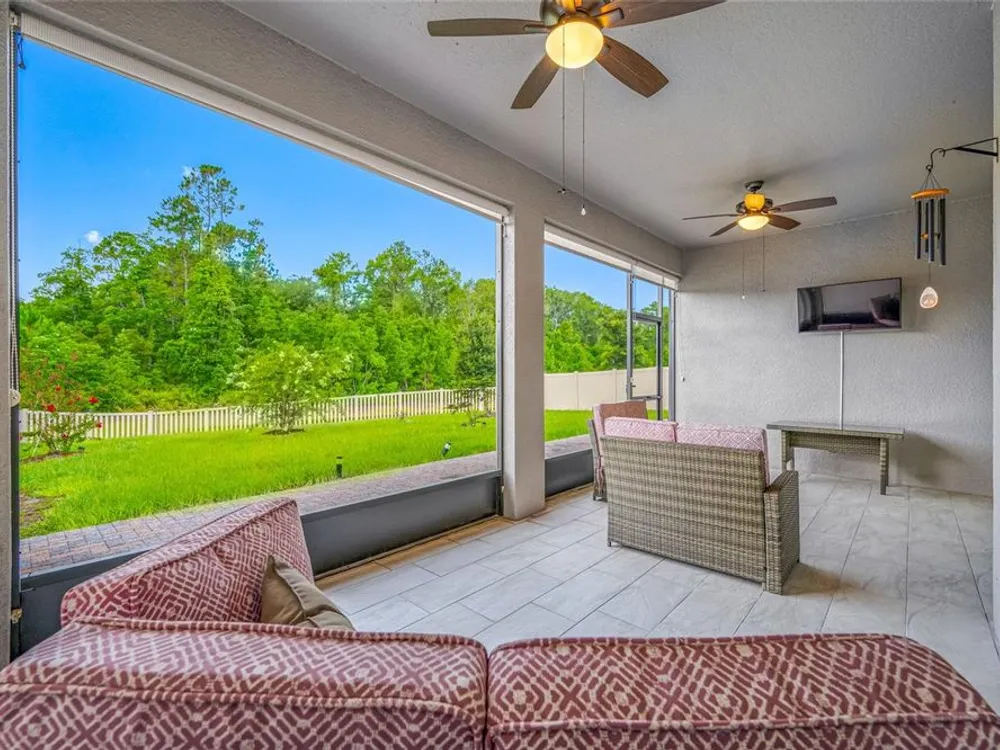 Welcome to this beautifully upgraded residence located in the heart of the vibrant, active adult community of Angeline – Medley in Land O’ Lakes, Florida. This thoughtfully designed home offers 3 spacious bedrooms, a dedicated home office, 2.5 bathrooms, and an array of high-end finishes throughout—all perfectly situated on a picturesque lot with tranquil views of the woods and pond. Step inside and be greeted by soaring ceilings, an open-concept floor plan, and abundant natural light that enhances the home’s bright, airy ambiance. The gourmet chef’s kitchen is the centerpiece of the home, featuring elegant 42” white cabinetry, quartz countertops, a stylish tile backsplash, stainless steel appliances, a butler’s pantry, and a custom walk-in pantry. A built-in bar adds a perfect touch for entertaining guests. The primary suite offers a peaceful retreat, complete with ample room for a king-size bed and a sitting area. The en-suite bath includes a spacious vanity, private water closet, and a large walk-in shower with built-in bench. A custom-designed walk-in closet with built-in drawers and shelving provides exceptional organization. Adjacent to the primary suite is a versatile office with a full wall of custom built-in bookcases and shelving—ideal for working from home or pursuing hobbies. A convenient powder room is located just across the hall. Two additional guest bedrooms are positioned at the front of the home, each with walk-in closets and a shared full bathroom featuring dual vanities. Additional highlights include: Oversized 2-car garage with a separate golf cart bay or extra storage. Built-in attic stairway leading to a bonus storage or flex space. Seamless gutters and fresh interior paint throughout. Located within the premier 55+ enclave of Angeline – Medley, this home provides access to a wide array of resort-style amenities. Enjoy miles of scenic walking and biking trails, a private clubhouse, resort-style pool, state-of-the-art fitness center, pickleball and tennis courts, and more. A community garden offers space for residents to grow their own produce, while future plans include a spectacular recreational lagoon and over 3,600 acres of green space to explore.The Angeline community also boasts convenient access to Moffitt Cancer Center’s new 775-acre Speros FL research campus, as well as a state-of-the-art STEM magnet school, positioning it as a hub for innovation, wellness, and lifelong learning. This home combines elegant living, modern functionality, and a thriving community lifestyle—don’t miss your opportunity to make it yours.