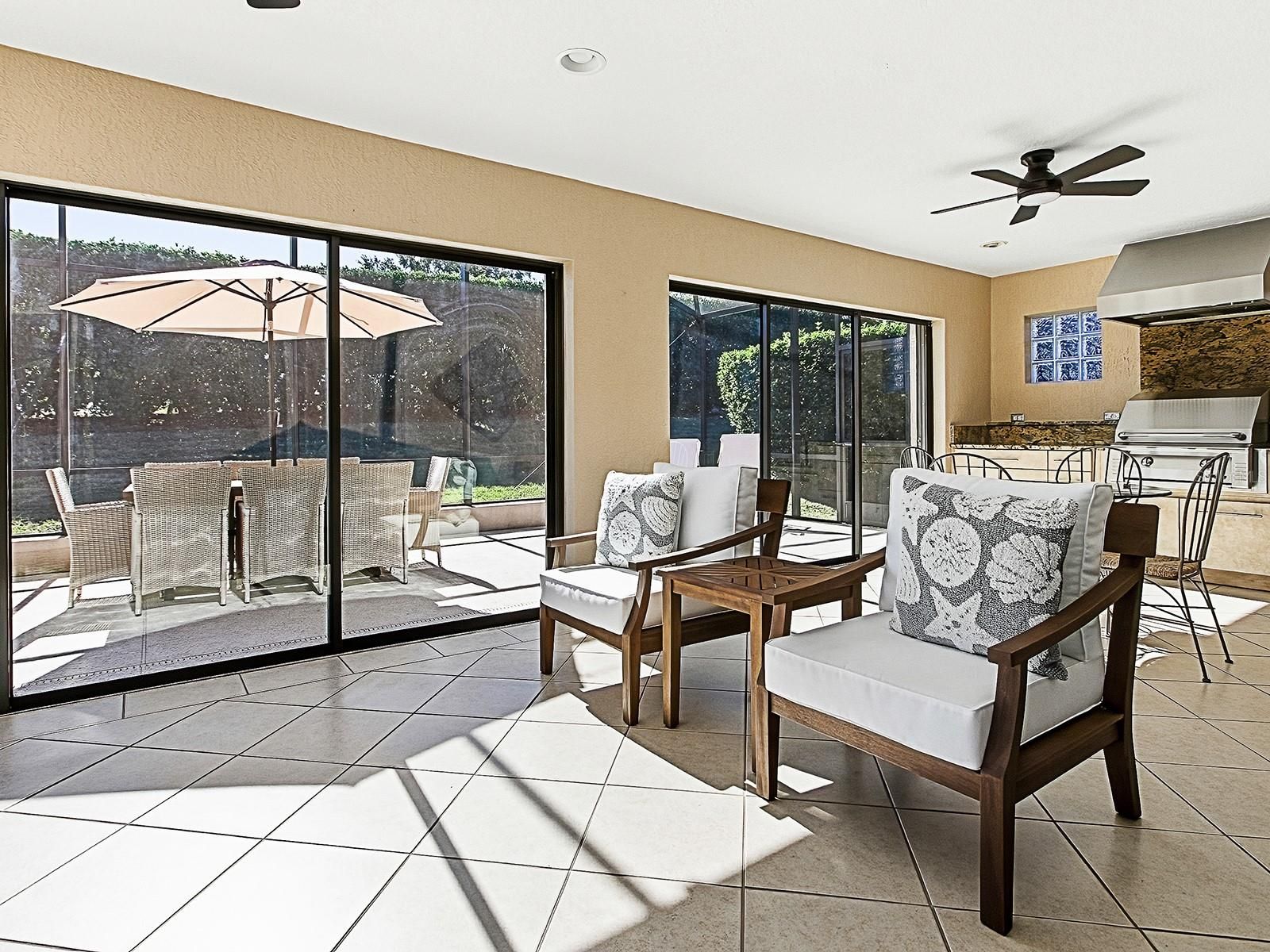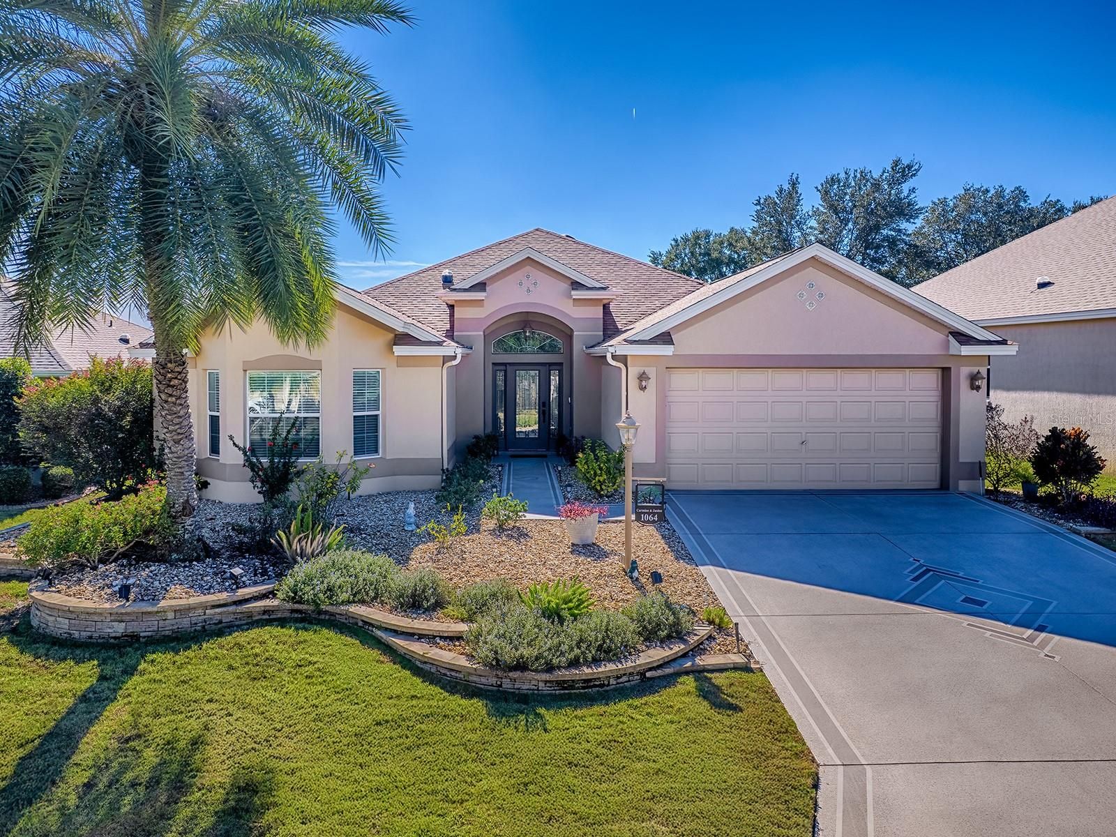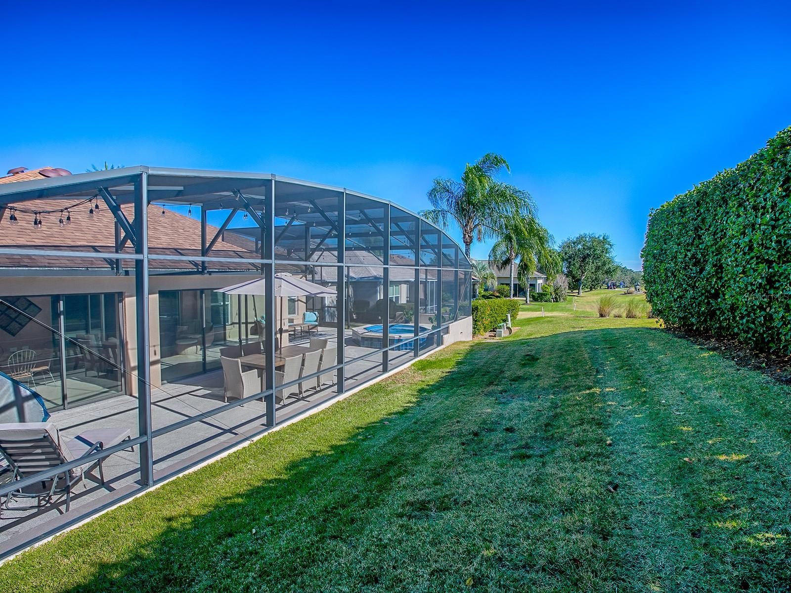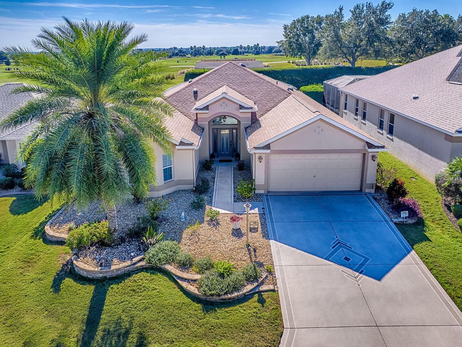 BOND PAID! This beautifully updated GOLF-VIEW, SPA home is located in the desirable Village of Hemingway and offers a thoughtful blend of comfort, style, and outdoor living. From the moment you arrive, you’ll appreciate the manicured landscaping and inviting front entry with new full view decorative glass accents. The Interior is beautiful, but for many, the true highlight of the home is the expansive screened lanai, designed for year-round enjoyment. Through sliding glass doors, you’ll find a COVERED OUTDOOR LIVING area complete with a full OUTDOOR KITCHEN, dining space, and seating area — perfect for entertaining. The open cage design showcases EXPANSIVE GOLF COURSE VIEWS while the in-ground heated spa offers a relaxing place to unwind. Easy rear access to walk to and use Truman Recreation Center. MUST SEE THIS SPACE. Inside, an open floor plan is enhanced by tile flooring throughout the main living areas and vaulted ceilings that create a bright, airy feel. The kitchen features wood cabinetry, granite countertops, stainless steel appliances, and a functional layout ideal for everyday living and entertaining. The dining area flows seamlessly into the living space, making it easy to host family and friends. The spacious primary suite features vaulted ceilings, a walk-in closet, and an ensuite bathroom with dual sinks and a tiled shower. NEW Luxury Vinyl Flooring in master bedroom and walk in closet. NEW custom closet system in master bedroom. Guest bedrooms also feature vaulted ceilings, providing an open and comfortable retreat for visitors or flexible use as a home office or hobby space. Recent UPGRADES include new light fixtures throughout, a new roof (January 2024), and a new water heater (December 2023), providing added value and peace of mind. Conveniently located near Havana Country Club, executive golf courses, shopping, dining, and recreation, this home offers the lifestyle The Villages is known for. Optional turnkey furniture package and golf cart available separately.