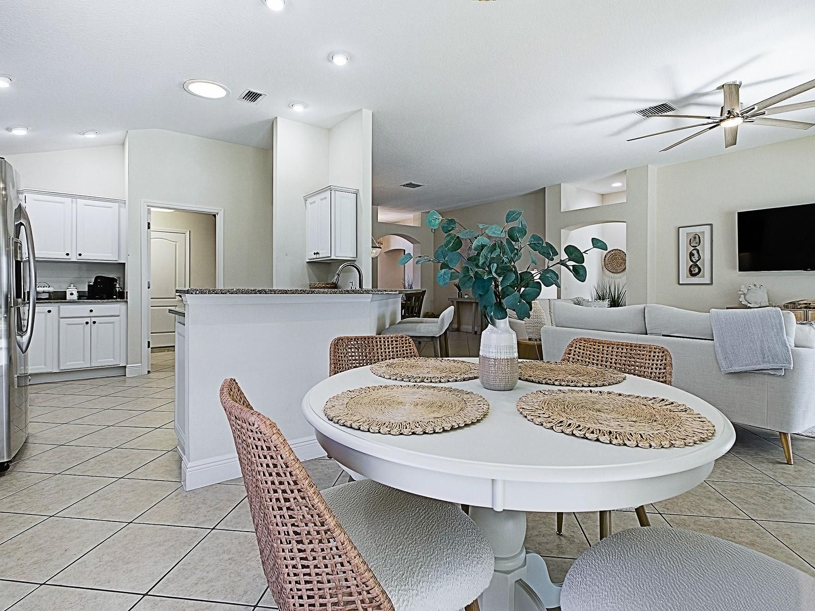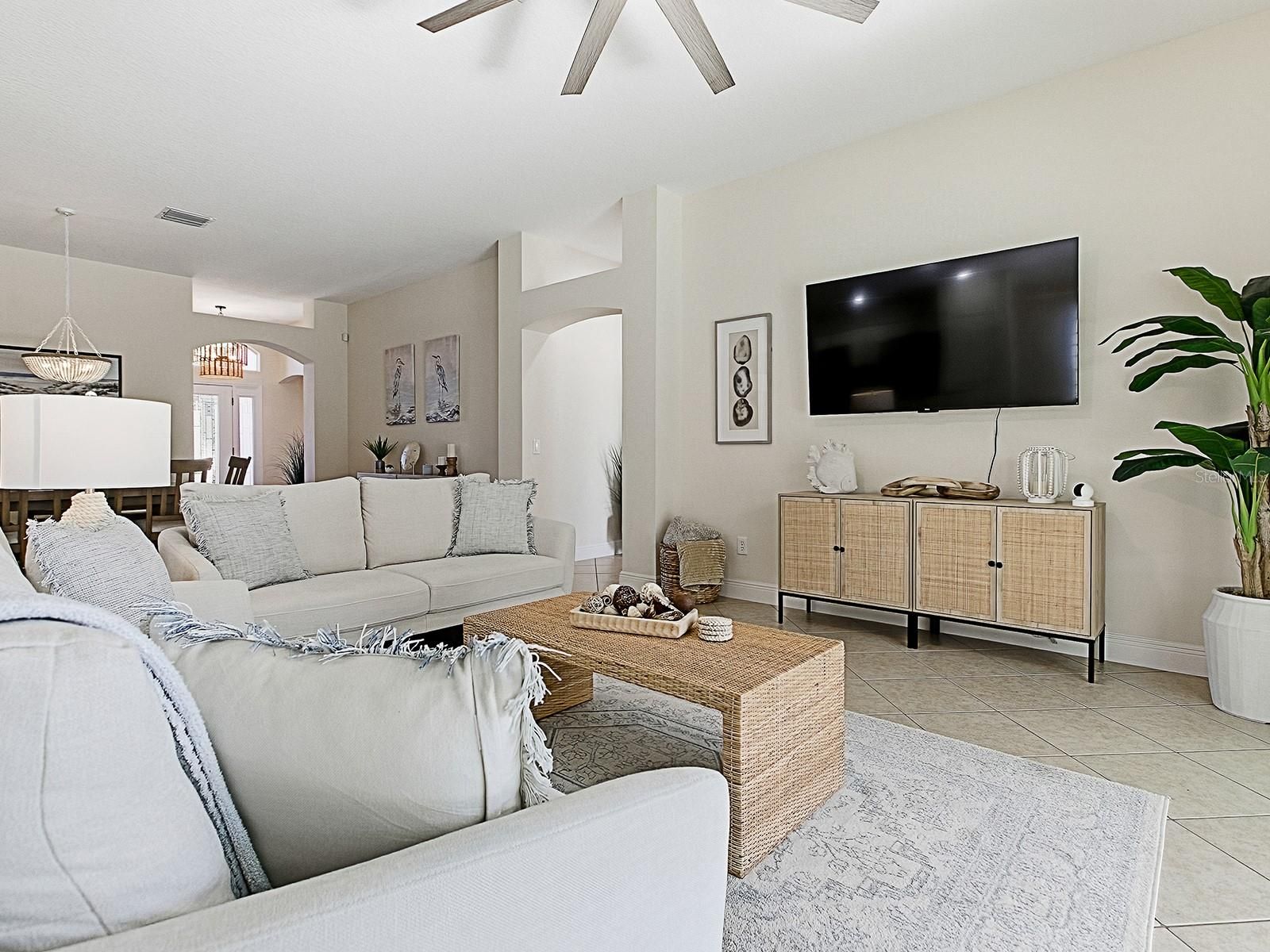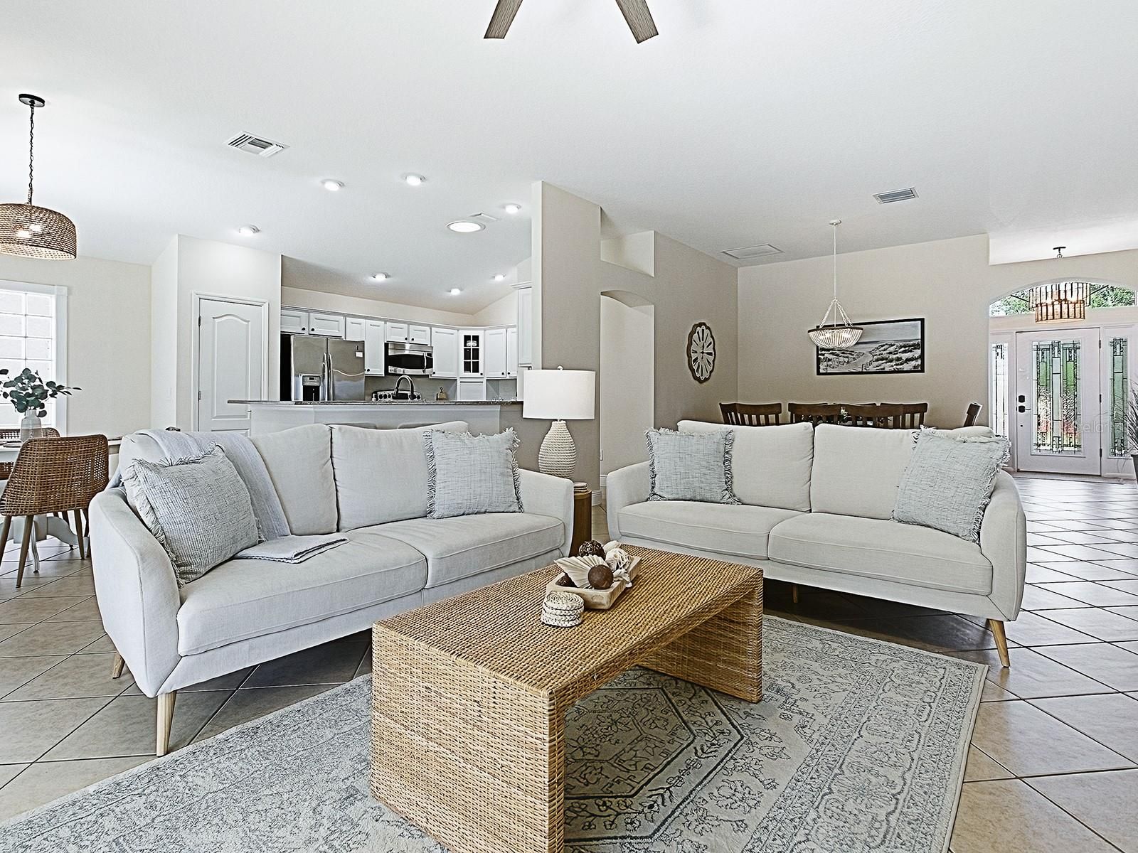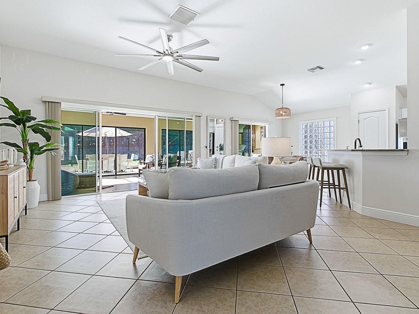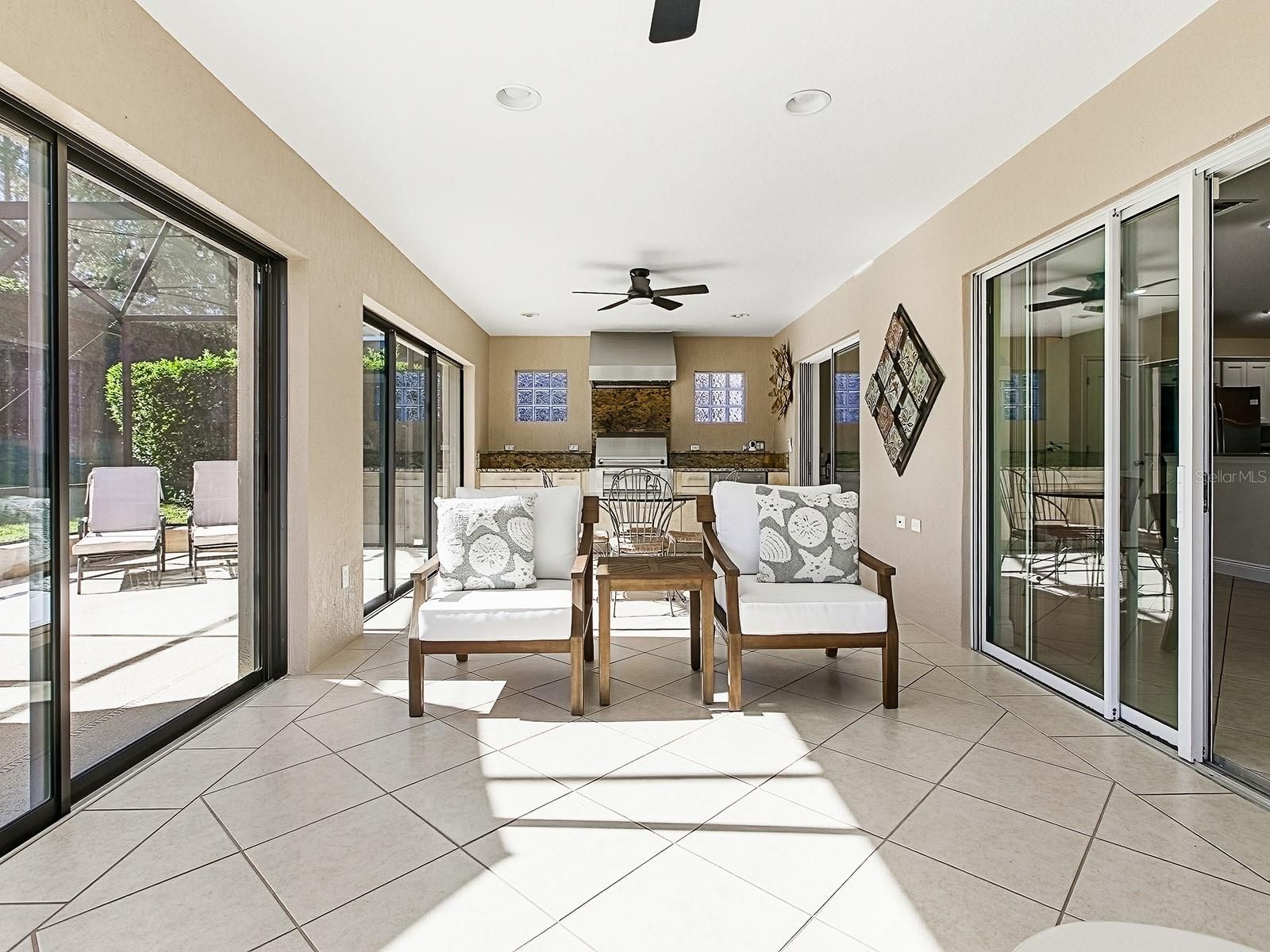BOND PAID! This beautifully updated GOLF-VIEW, SPA home is located in the desirable Village of Hemingway and offers a thoughtful blend of comfort, style, and outdoor living. From the moment you arrive, you’ll appreciate the manicured landscaping and inviting front entry with new full view decorative glass accents. The Interior is beautiful, but for many, the true highlight of the home is the expansive screened lanai, designed for year-round enjoyment. Through sliding glass doors, you’ll find a COVERED OUTDOOR LIVING area complete with a full OUTDOOR KITCHEN, dining space, and seating area — perfect for entertaining. The open cage design showcases EXPANSIVE GOLF COURSE VIEWS while the in-ground heated spa offers a relaxing place to unwind. Easy rear access to walk to and use Truman Recreation Center. MUST SEE THIS SPACE. Inside, an open floor plan is enhanced by tile flooring throughout the main living areas and vaulted ceilings that create a bright, airy feel. The kitchen features wood cabinetry, granite countertops, stainless steel appliances, and a functional layout ideal for everyday living and entertaining. The dining area flows seamlessly into the living space, making it easy to host family and friends. The spacious primary suite features vaulted ceilings, a walk-in closet, and an ensuite bathroom with dual sinks and a tiled shower. NEW Luxury Vinyl Flooring in master bedroom and walk in closet. NEW custom closet system in master bedroom. Guest bedrooms also feature vaulted ceilings, providing an open and comfortable retreat for visitors or flexible use as a home office or hobby space. Recent UPGRADES include new light fixtures throughout, a new roof (January 2024), and a new water heater (December 2023), providing added value and peace of mind. Conveniently located near Havana Country Club, executive golf courses, shopping, dining, and recreation, this home offers the lifestyle The Villages is known for. Optional turnkey furniture package and golf cart available separately.