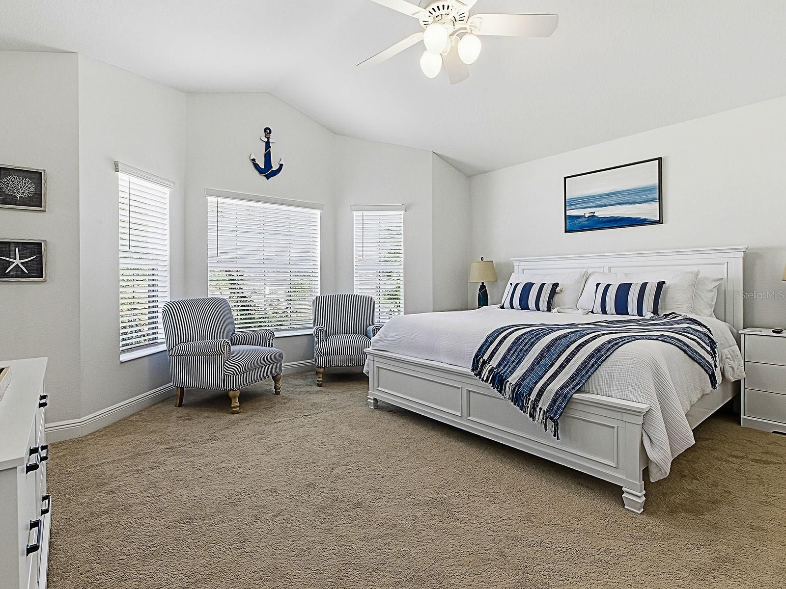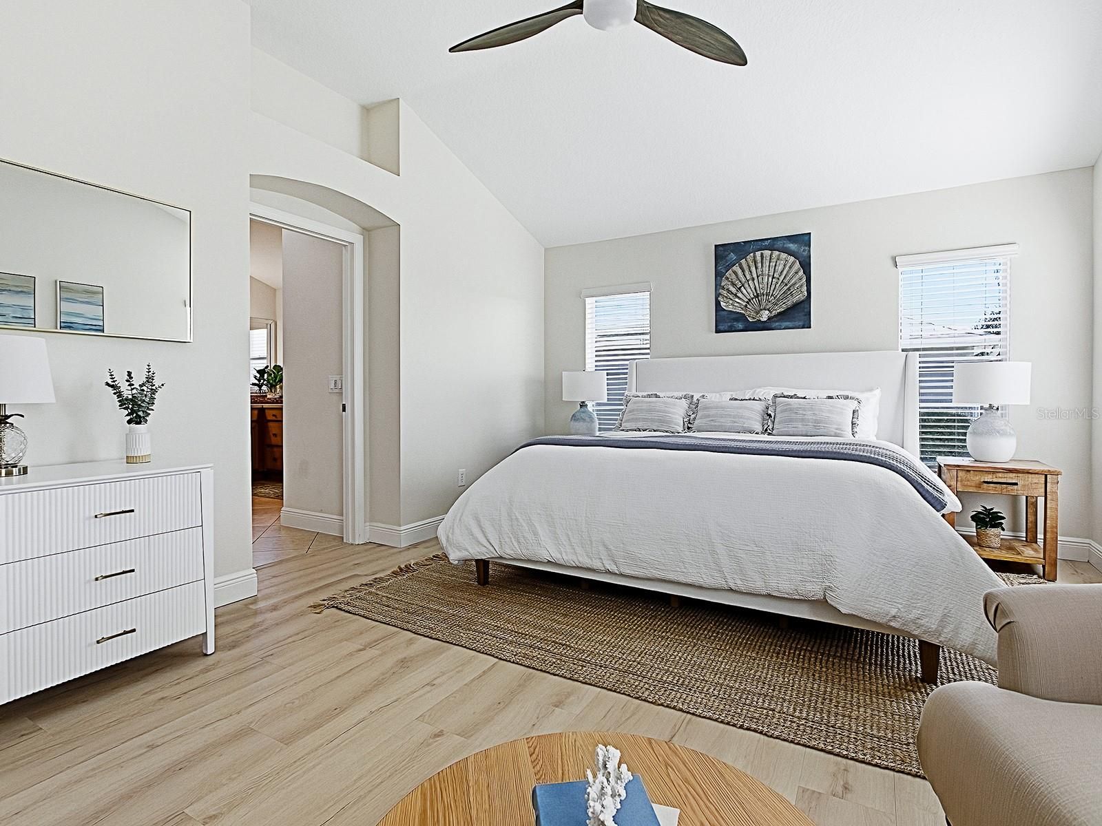 - Ceiling Fan(s), High Ceilings, Open Floorplan, Main Level Primary, Stone Counters, Thermostat, Walk-In Closet(s), Window Treatments