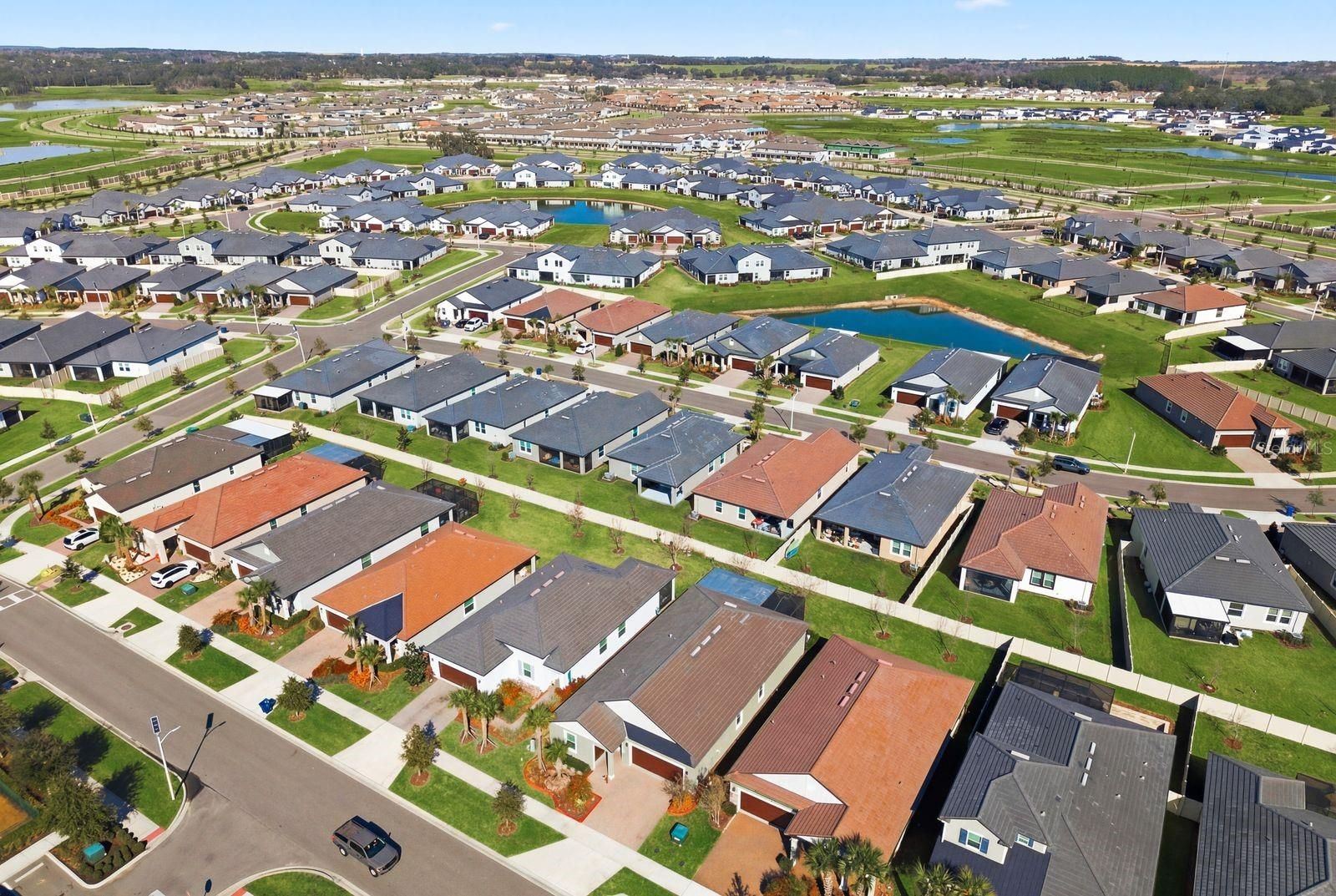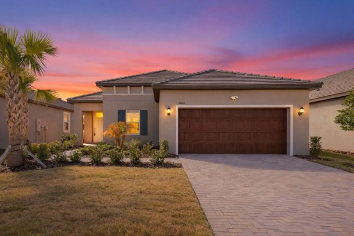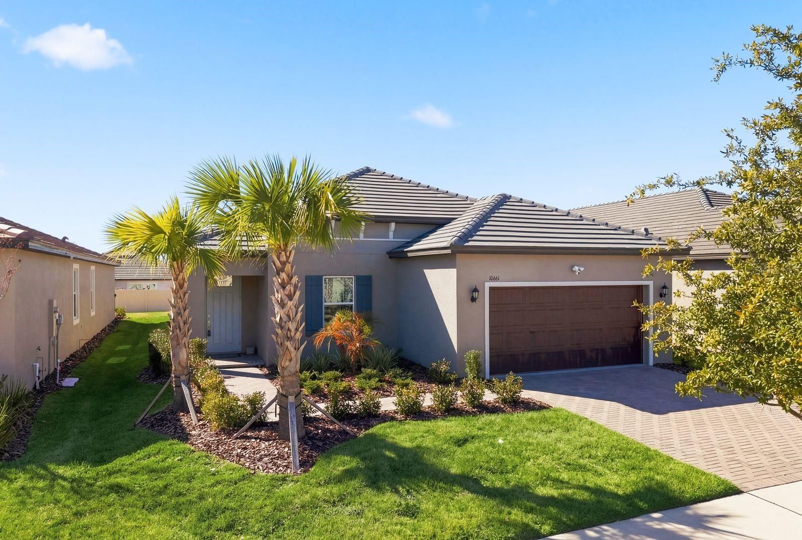 Discover effortless Florida living in the sought-after Medley at Mirada 55+ active community. This two year old Mediterranean-style home is immaculate, move-in ready, and an ideal alternative to waiting for new construction. The home offers 2 bedrooms, 2 bathrooms, and a flexible den or office, all within a bright open-concept Splendor layout designed for both comfortable daily living and entertaining. An oversized 2-car garage provides ample space for a golf cart, storage, or hobbies.The contemporary kitchen features upgraded GE stainless steel appliances, including a french door refrigerator, microwave, glass-top range with convection oven and air fryer. The Kinetico REVERSE OSMOSIS system provides high quality purified drinking water for added convenience. Additional upgrades include crown molding, a dedicated laundry room with cabinetry, Ring doorbell, and exterior flood lights, showcasing thoughtful attention to detail throughout. Enjoy 1,783 square feet of living space on a 6,075-square-foot maintenance-free homesite. Exterior maintenance, lawn care, irrigation, basic cable, and internet are included for truly low-maintenance living. Residents of Medley enjoy a private resort-style clubhouse with a sparkling pool, poolside bar and café, ballroom, billiards room, fitness center, and a full social calendar! Recreational amenities include pickleball, tennis, bocce ball, and shuffleboard with this home being just steps away from all of the fun! Ownership also includes membership to the Mirada freshwater lagoon, featuring sandy beaches, kayaking, swim areas, lounge seating, and food and beverage options, offering a vacation-like setting right inside the community. Conveniently located near I-75, the home is a short drive from The Shops at Wiregrass, Tampa Premium Outlets, KRATE Container Park, and Main Event Wesley Chapel, along with everyday shopping and dining. Nearby medical facilities include AdventHealth Zephyrhills and AdventHealth Dade City. Experience the ideal blend of comfort, convenience, and active 55+ living at Medley at Mirada!