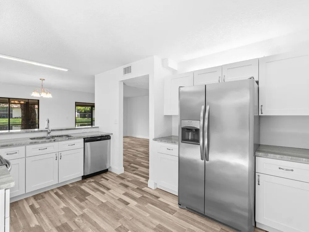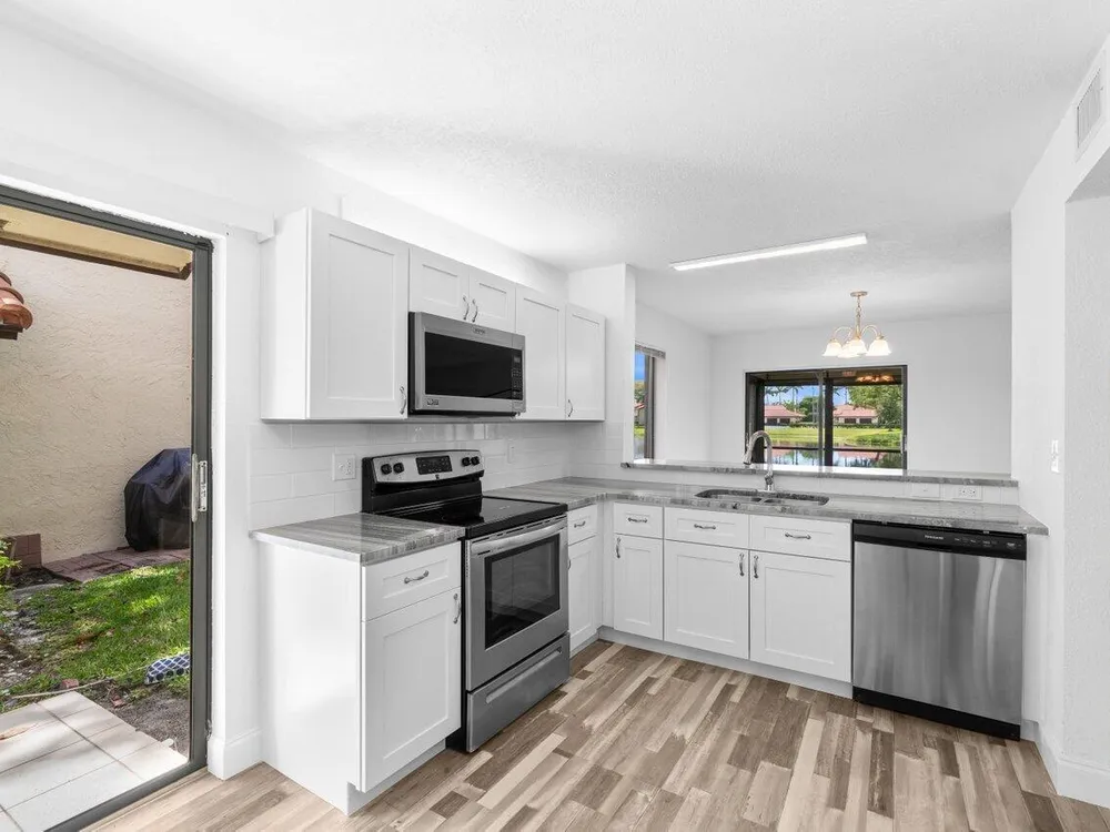 Stunning 3 bedroom 2 bath first floor condo with gorgeous lake views. Kitchen has been updated with white cabinets, granite counter tops and stainless steel appliances. New luxury flooring flows throughout the home complementing the updated bathrooms with modern tile, vanities and fixtures. AC 2015, new water heater. HOA responsible for the roof. Relax on the screened patio overlooking tranquil lake views.
