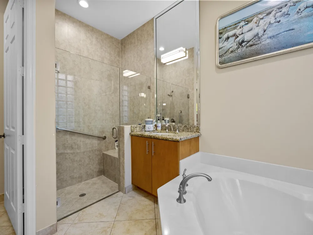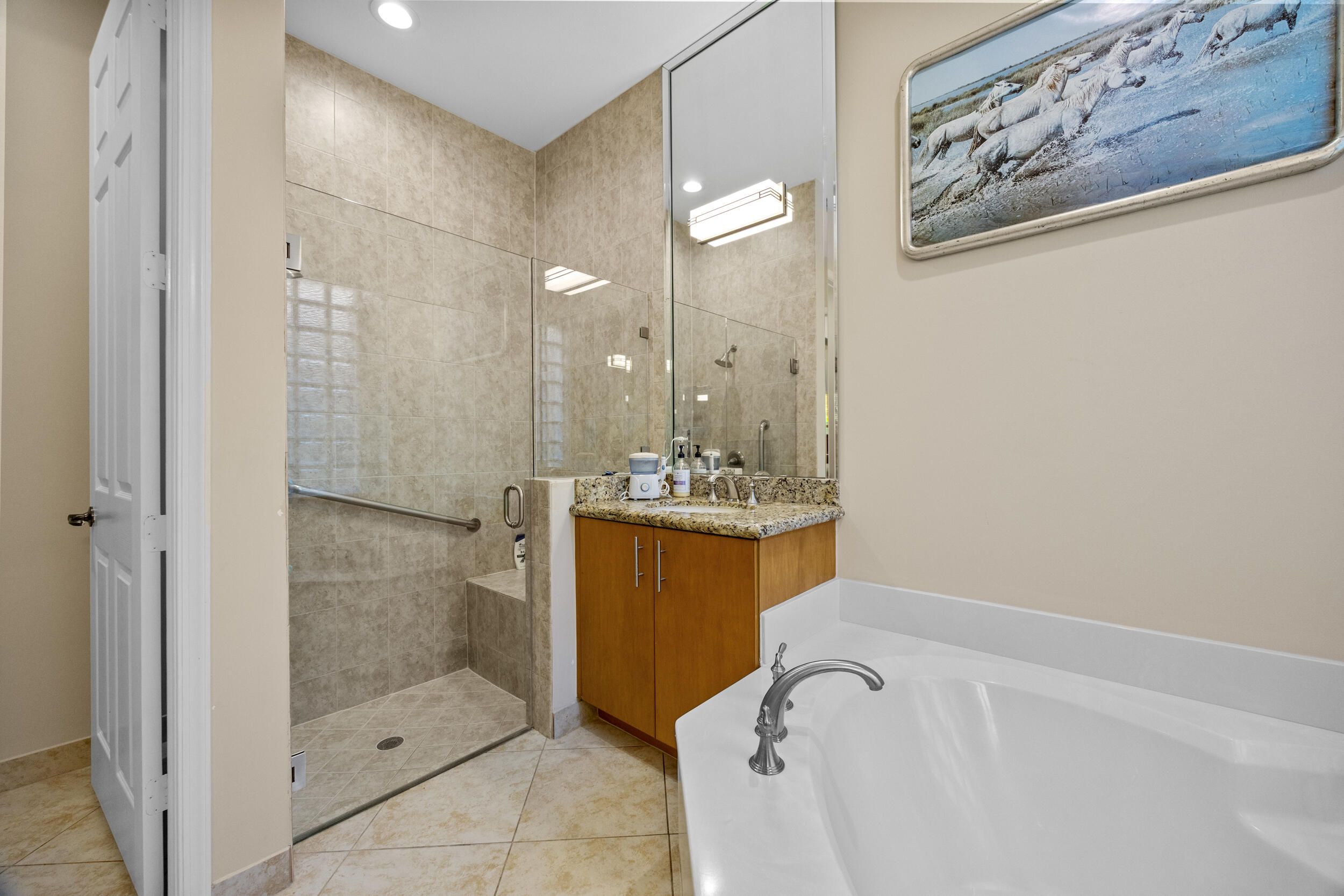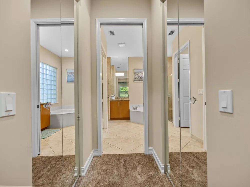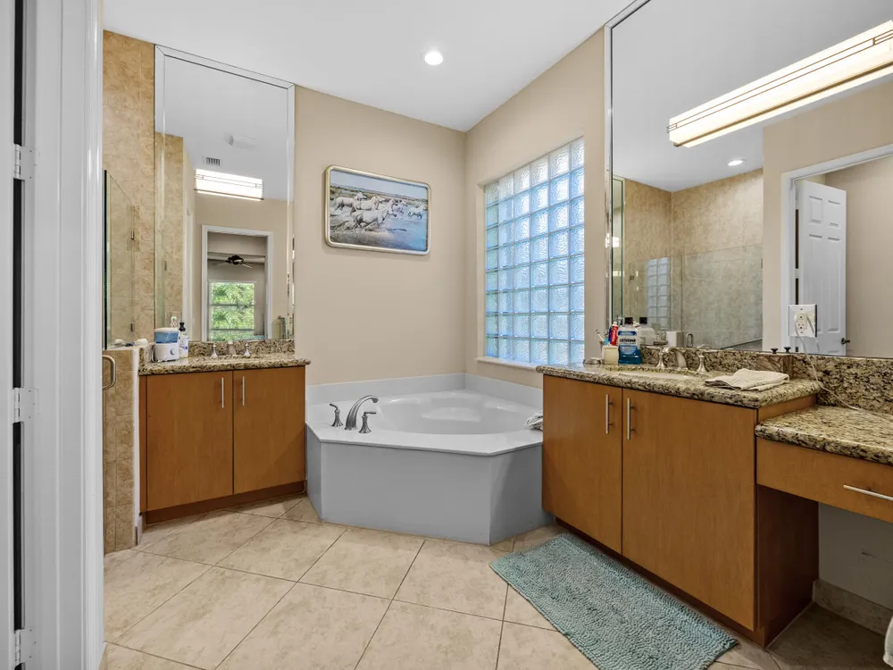 - Entry Level Living Area, French Door(s)/Atrium Door(s), Split Bedrooms, Walk-In Closet(s), Home Office, Great Room, Eat-in Kitchen, Separate/Formal Dining Room, Snack Bar, Blinds, Dual Sinks, Primary Downstairs, Separate Shower, Bathtub, Storm Shutters