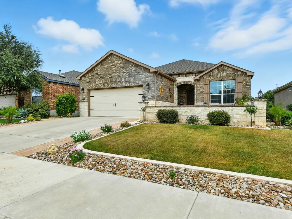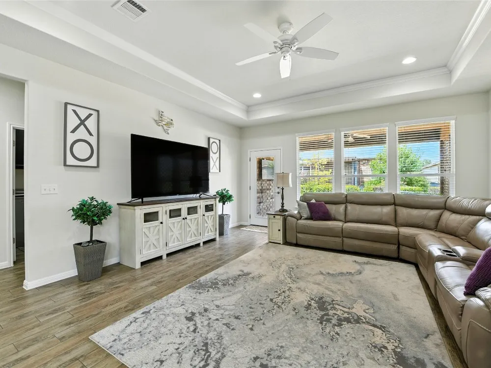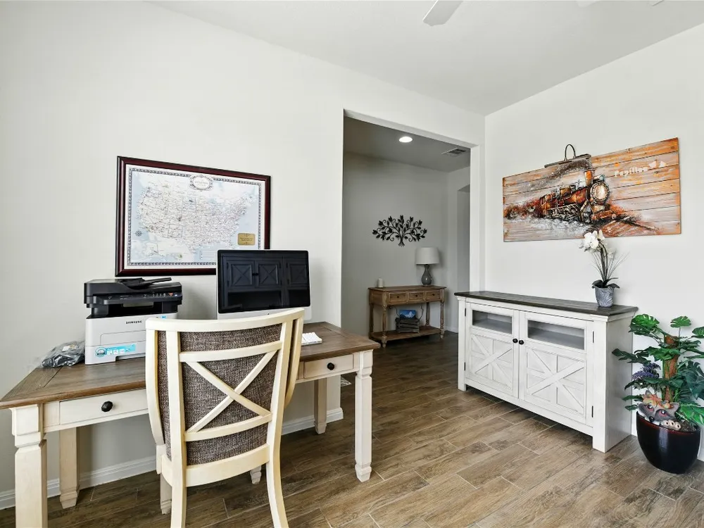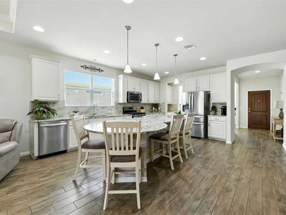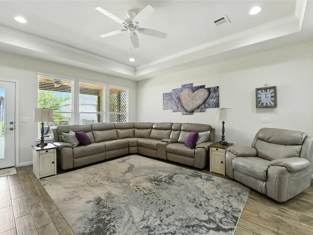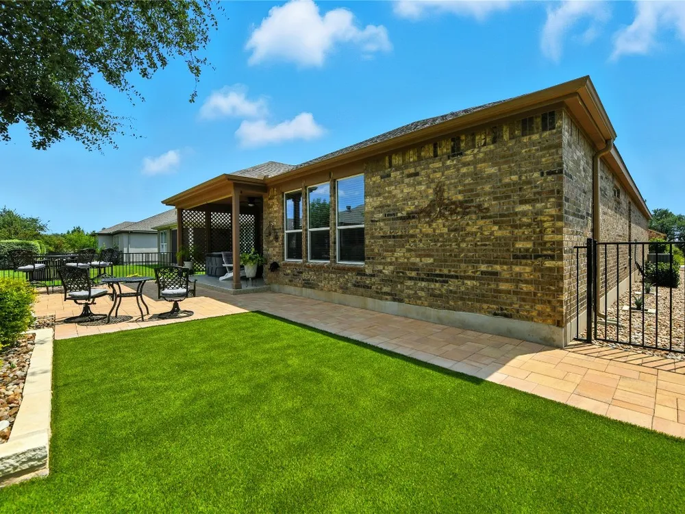 Discover the allure of this exceptional home nestled in Sun City—a stunning Martin Ray Model that exemplifies luxury living and is within walking distance to The Retreat Amenity center. *Take advantage of the opportunity to buy this home fully furnished (minus the sellers personal items), ask the listing agent for details.* Why wait to build when this gorgeous home is ready to embrace you. Positioned facing south, it bathes in natural sunlight, is surrounded by exquisite stonework adding to its curb appeal while offering peaceful living. You will be welcomed by the charming courtyard to enjoy with friends and neighbors. Step inside to discover an array of elegant features that enhance its beauty and functionality. The front room is a perfect space for an office/den/craft room. The kitchen is a chef's dream, boasting a lengthy tear drop island perfect for gathering, a convenient gas cooktop for culinary adventures, and gleaming wood look tile floors that add warmth to the space. The butler pantry provides ample storage, keeping your kitchen organized and clutter-free. Entertain in style with the dining area adjacent to the kitchen and living space. The primary bedroom is spacious and offers high ceilings and windows that overlook the beautifully landscaped backyard. The primary bath adorns a large walk-in shower, dual vanities, a ceiling fan and a large walk-in closet. The secondary bedroom offers a murphy bed perfect for guests. Outside you will fall in love with perfectly manicured, minimal maintenance yard with artifical turf, a covered patio with hot tub, TV and gas stub out for your BBQ. Enjoy the stone work and walkways on either side of the home. The 2 car garage offers built-in cabinets, work bench, ceiling storage racks and a water softener along with the additional 4’ extension providing extra storage. Come and see this special home and enjoy all that Sun City has to offer!