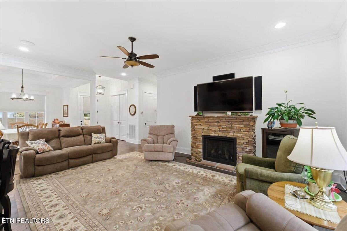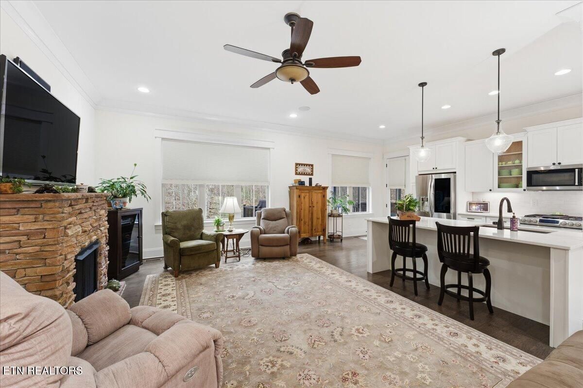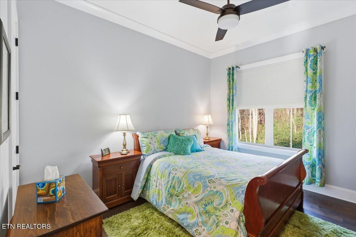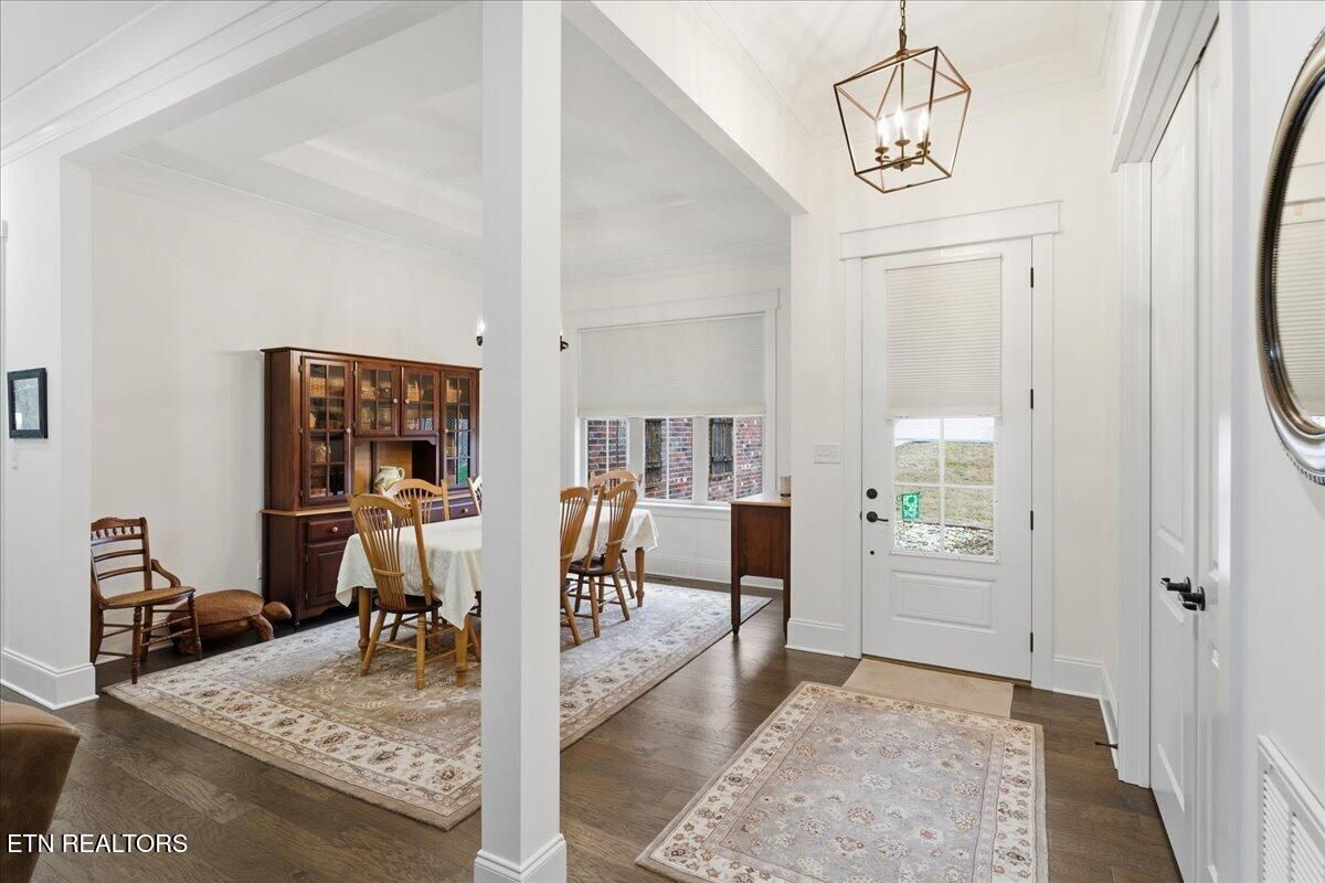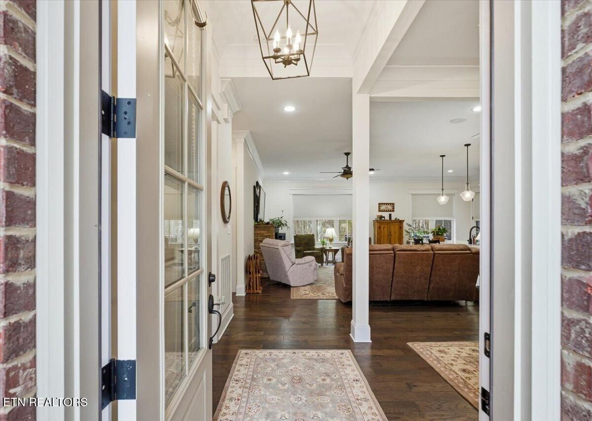This stunning all-brick home is located in the beautiful neighborhood of Toqua Hills. It backs up to more than 5 acres of wooded common property, providing exceptional privacy and a peaceful natural setting. The main level features spacious living areas with soaring 10-foot ceilings and 8-foot doors, creating an open and airy feel throughout the home. Elegant crown molding adds a refined touch to the living spaces. The family room gas fireplace is ventless and perfect for those cool days. The screened in porch allows for a quiet space to sit and enjoy the outdoors with that morning coffee or evening cocktail. Split-bedroom floor plan offers privacy for the primary suite while keeping the main living areas perfect for entertaining and everyday living. The walkout lower level provides abundant additional living space, ideal for a recreation room, guest area, working shop or home office. The kitchen showcase white marble-look quartz countertops paired with custom white maple shaker-style cabinetry, delivering a clean, timeless design. In the luxurious primary bathroom, you'll find: - A large walk-in shower with body sprayers - Dual vanities - Custom closet shelving for optimal organization With beautiful finishes, generous living space, and unmatched privacy from the surrounding wooded acreage, this home offers comfort, elegance, and tranquility in one of the area's most sought-after neighborhoods. Notice the textured driveway which transitions to ornamental pavers as you approach the house. The large flat screen TV in the family room will remain with the house as well as all the surround sound equipment. Levolor Blinds throughout house and sun screening roll down shades on screen porch. Propane Tank is a 250 gal tank and is leased from Suburban Propane.