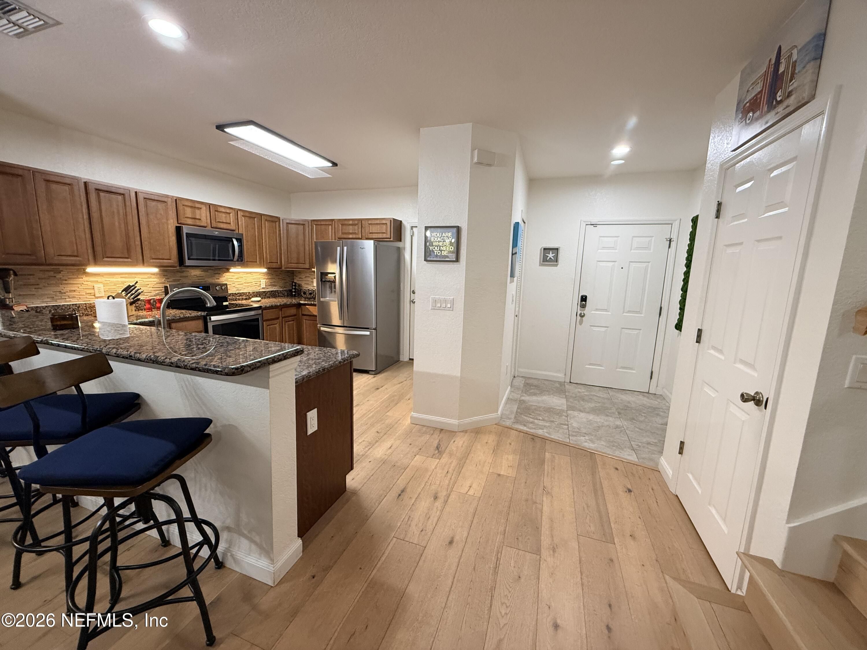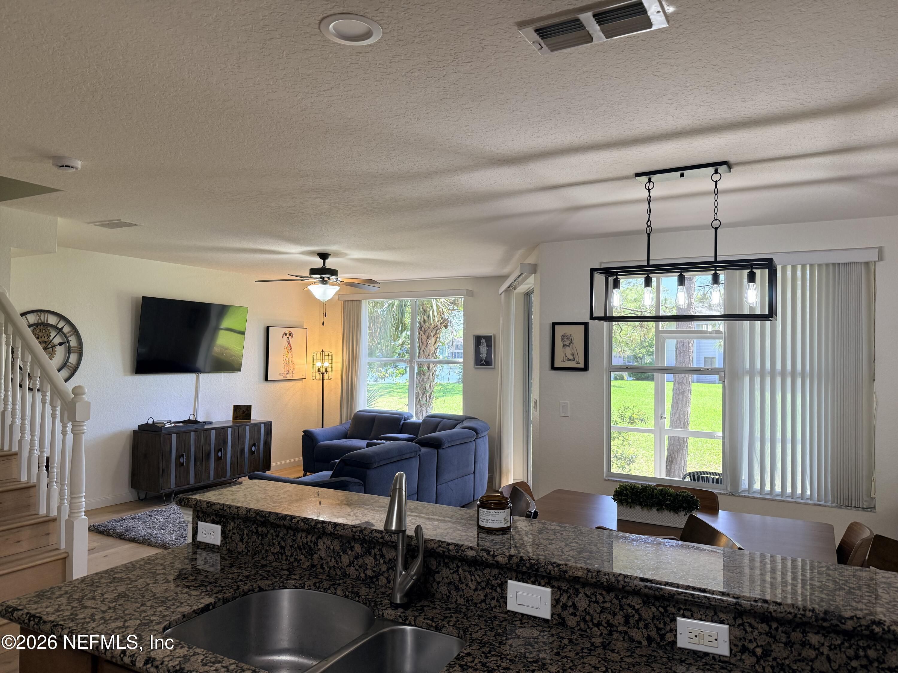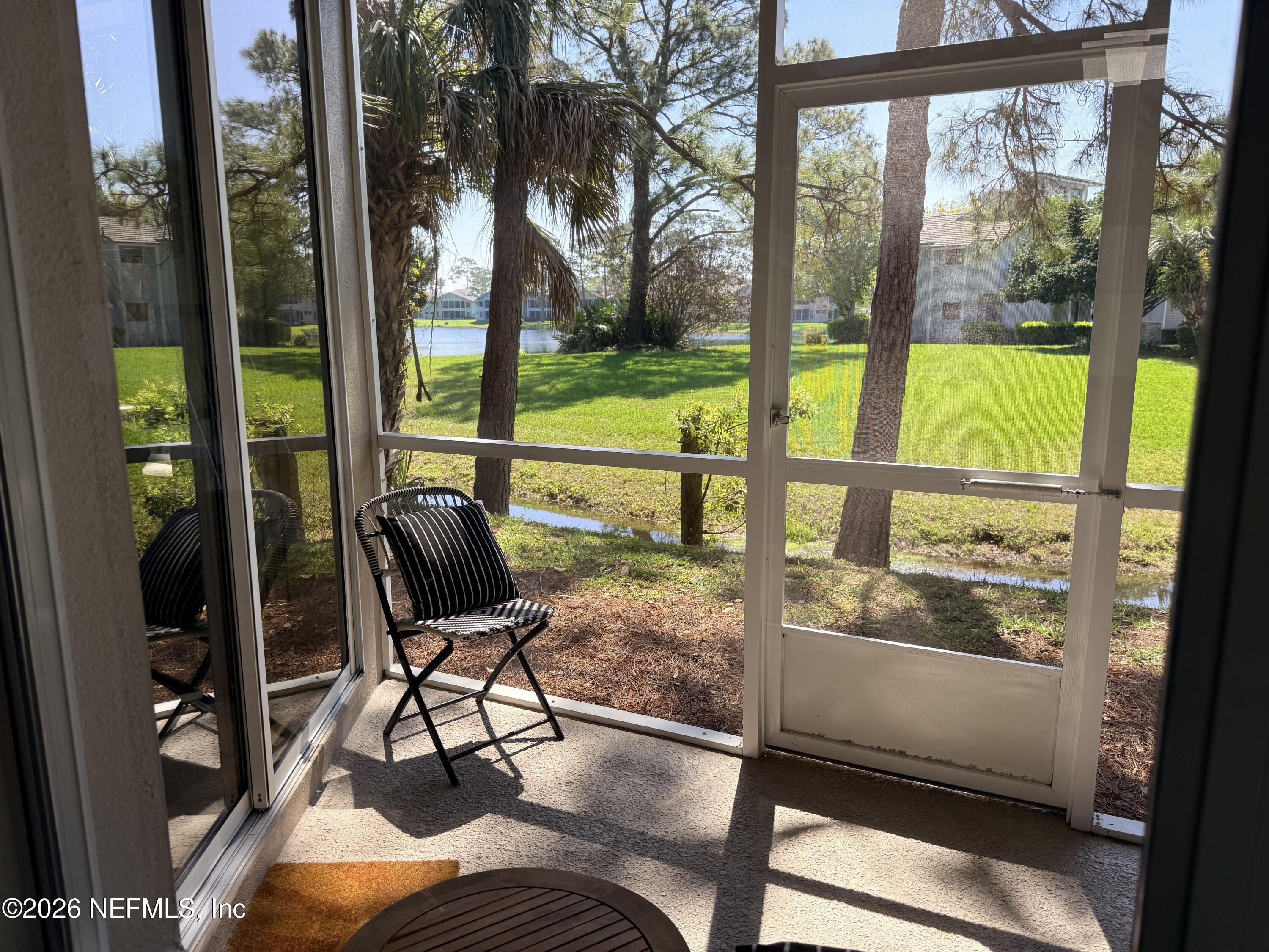 Located in Daytona Beach's highly desirable gated golf community of Pelican Bay, this beautifully maintained townhouse offers the ideal blend of privacy, and scenic lakefront living. Featuring two spacious bedrooms, two full bathrooms, and a 1st floor half bath, the home is thoughtfully designed. Upon entry, you are welcomed into a bright, open-concept living space with abundant natural light. Wood flooring & tile throughout the main level lead to a screened in waterfront patio. The flow between the living, dining, and kitchen areas creates an inviting environment. The kitchen is appointed with granite countertops and ample workspace, allowing for both functionality and style while remaining connected to the main living areas. Upstairs, the primary suite offers a private retreat with vaulted ceilings that enhance the sense of space and light. The en-suite bathroom features double vanities, a whirlpool tub and separate shower.