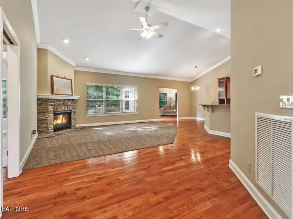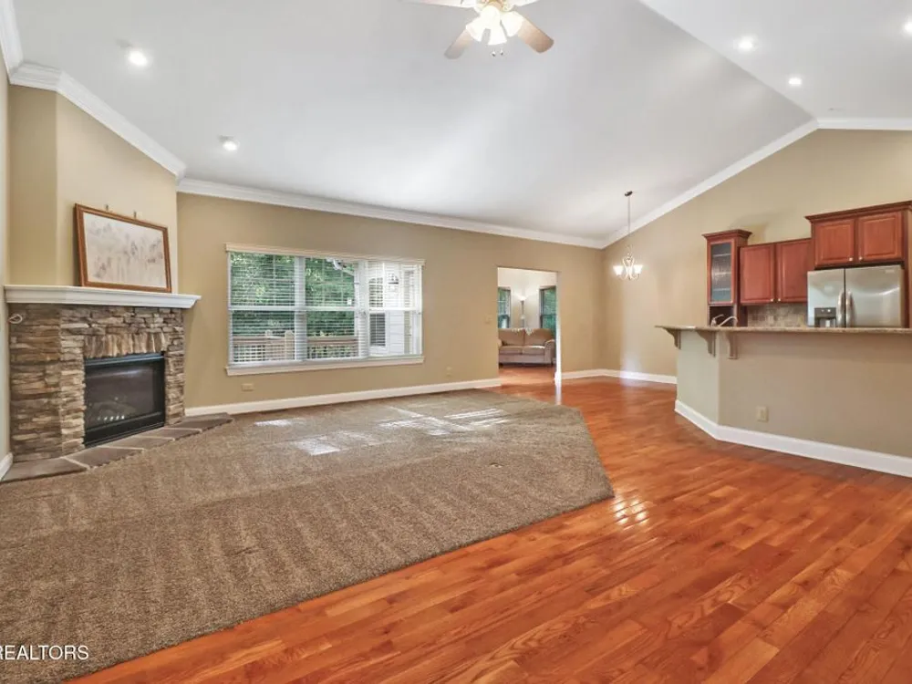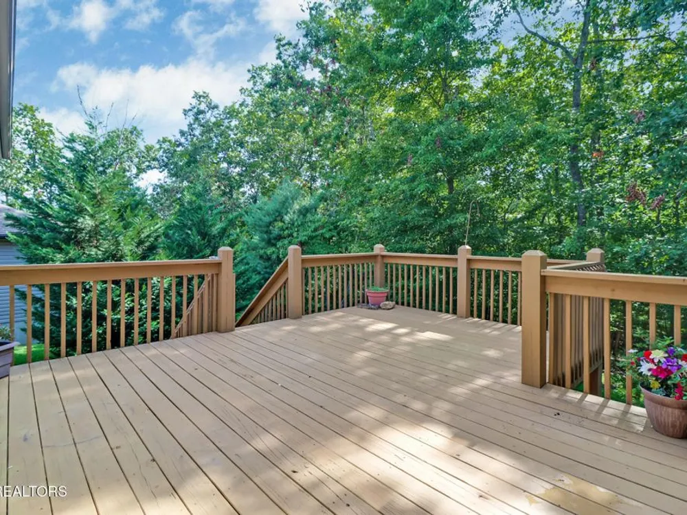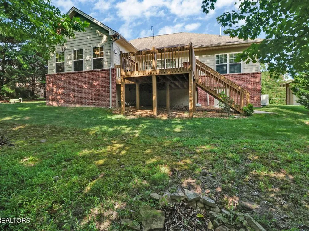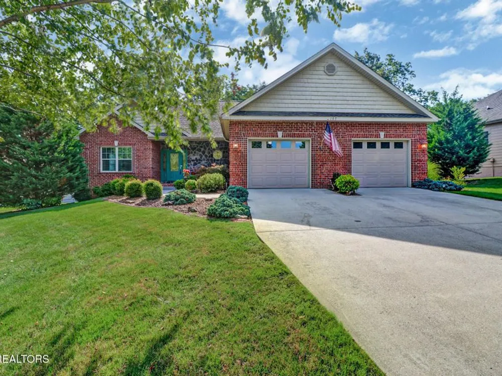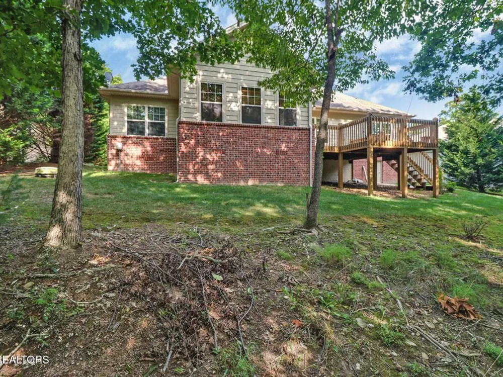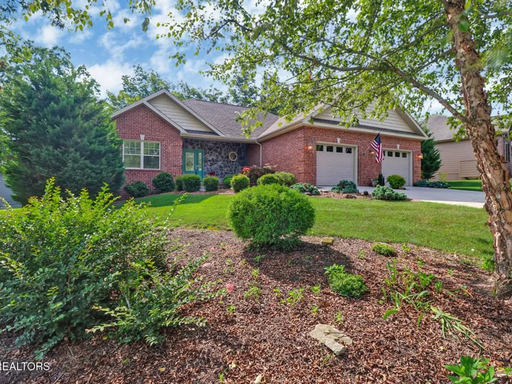 This very pretty brick and stone home is located in close proximity to Lake Dartmoor and Dartmoor Marina. Across the street is the Brae Golf Course making this a very sought-after neighborhood. The stone accented, covered front porch is welcoming and inviting space. Step inside to an open floorplan and notice the warm tones and lustrous finish of the hardwood flooring, cathedral ceilings and crown molding. A very unique stacked stone fireplace is a focal point to create a cozy, gathering space. The kitchen features an island bar with gorgeous granite countertops, tile backsplash, stainless steel appliances, buffet area and pantry. There is a casual dining area between the kitchen and sunroom. Enjoy relaxing times in the sunroom or deck looking out over Mother Nature's forested landscape watching the deer pass through. The home features 3 bedrooms (split) and 2-1/2 baths. One of the secondary bedrooms features double French door which is perfect for a den/office or bedroom. The spacious master suite has access to the sunroom and a master bath that has double vanities, step-in, tile shower and a large master closet. The laundry room features storage cabinets, washer, dryer and a utility sink. The very large, 2-car garage has shelves and a staircase up to attic storage. The crawl space is encapsulated with a dehumidifier. The fireplace was never used, and can be set up for wood-burning or gas logs. Come take a look!