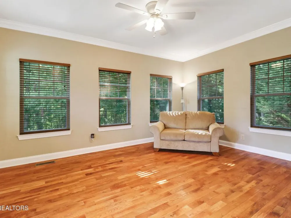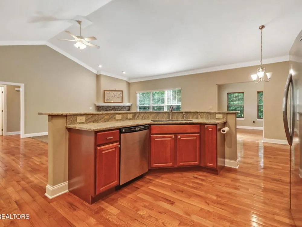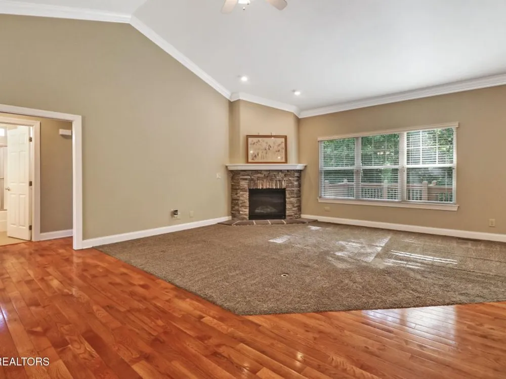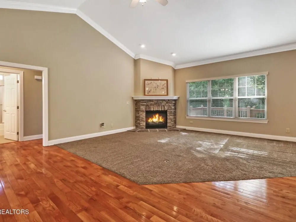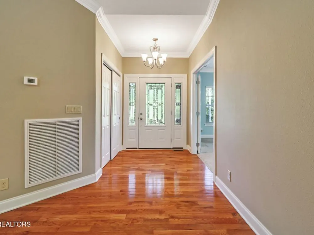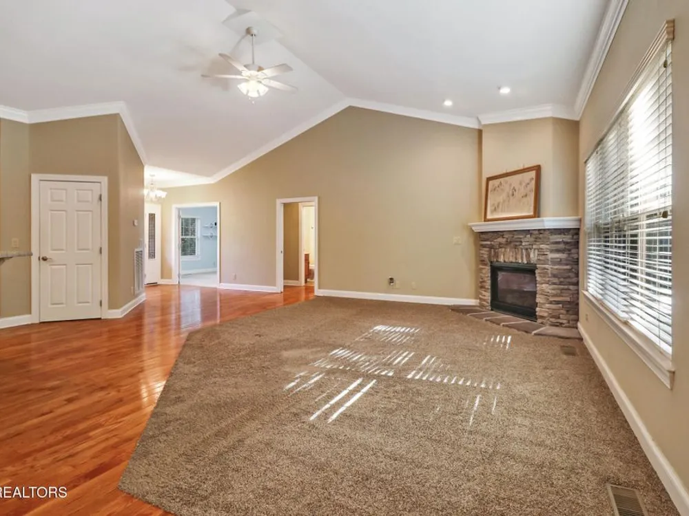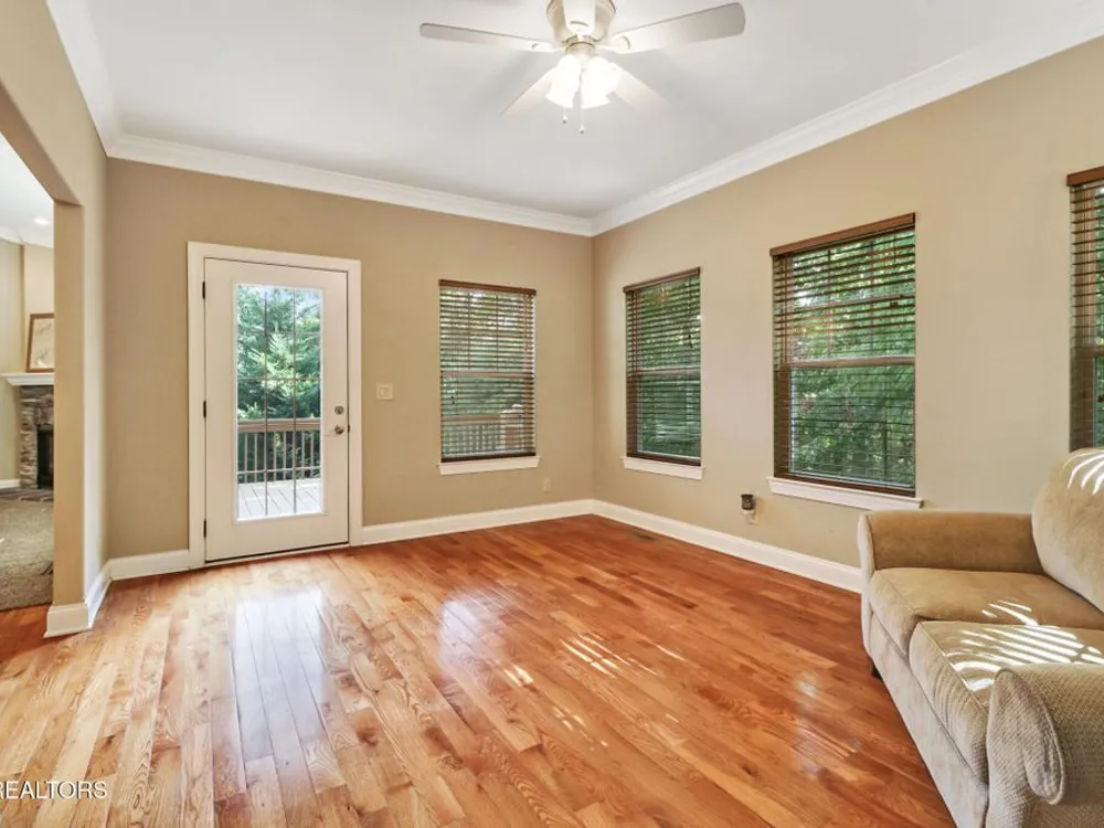 This very pretty brick and stone home is located in close proximity to Lake Dartmoor and Dartmoor Marina. Across the street is the Brae Golf Course making this a very sought-after neighborhood. The stone accented, covered front porch is welcoming and inviting space. Step inside to an open floorplan and notice the warm tones and lustrous finish of the hardwood flooring, cathedral ceilings and crown molding. A very unique stacked stone fireplace is a focal point to create a cozy, gathering space. The kitchen features an island bar with gorgeous granite countertops, tile backsplash, stainless steel appliances, buffet area and pantry. There is a casual dining area between the kitchen and sunroom. Enjoy relaxing times in the sunroom or deck looking out over Mother Nature's forested landscape watching the deer pass through. The home features 3 bedrooms (split) and 2-1/2 baths. One of the secondary bedrooms features double French door which is perfect for a den/office or bedroom. The spacious master suite has access to the sunroom and a master bath that has double vanities, step-in, tile shower and a large master closet. The laundry room features storage cabinets, washer, dryer and a utility sink. The very large, 2-car garage has shelves and a staircase up to attic storage. The crawl space is encapsulated with a dehumidifier. The fireplace was never used, and can be set up for wood-burning or gas logs. Come take a look!