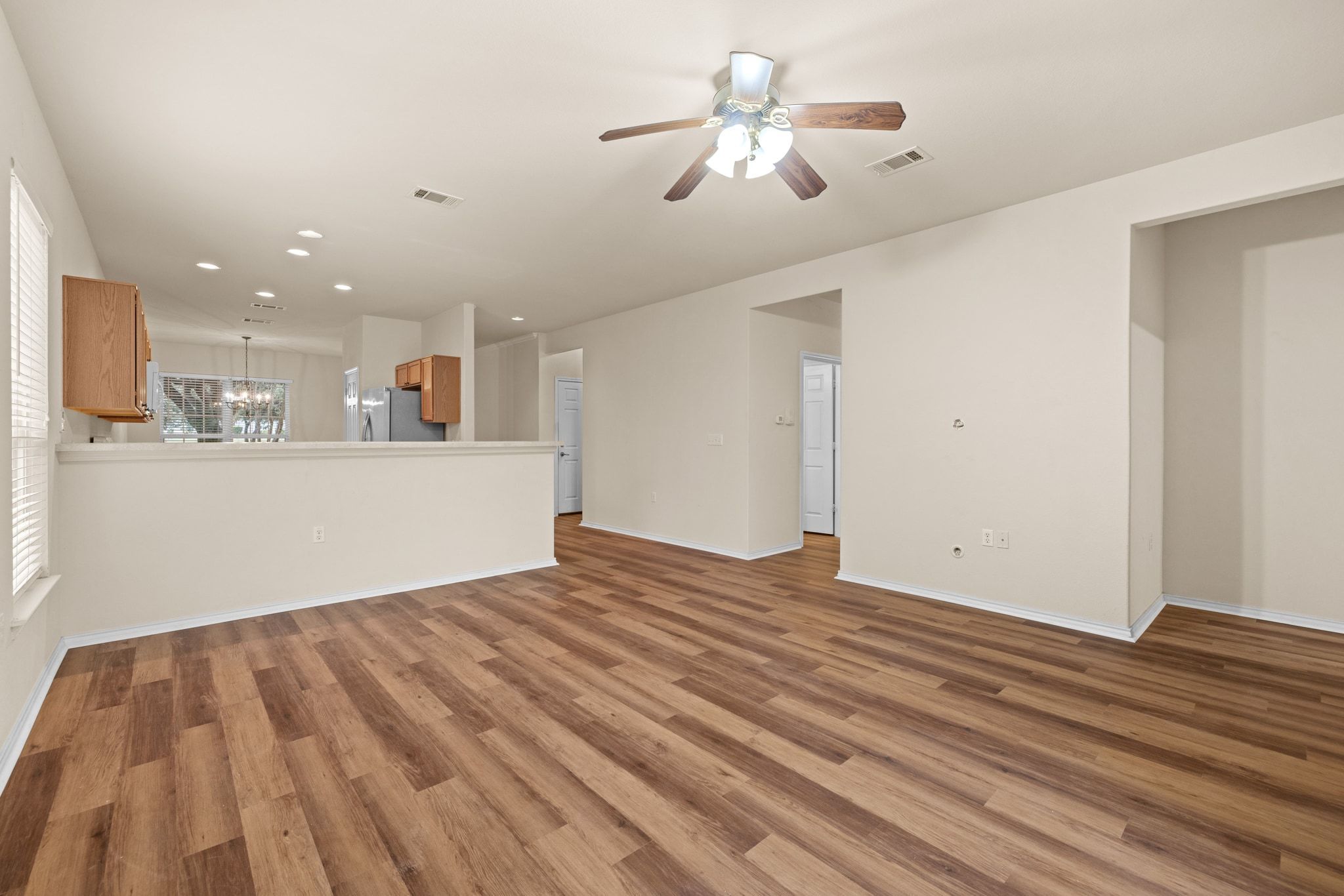 Beautiful 3 bedroom, 2 bath in Sun City’s 55+ Community, this charming home combines comfort, convenience, and an active lifestyle. LANDSCAPING INCLUDING IN MONTHLY HOA! With 1,597 sqft home is thoughtfully designed for easy living and features new flooring throughout. The open floor plan includes a welcoming living room, a spacious kitchen with ample cabinetry, pantry, and counter space, and a dining area ideal for both everyday meals and entertaining. The private primary suite offers with dual vanities, walk-in shower, and huge walk-in closet. Two secondary bedrooms provide flexible options for guests, hobbies, home office, craft room, etc.... Enjoy outdoor living on the extended back patio with a low-maintenance, HOA-maintained yard—perfect for relaxing or hosting friends. An attached two-car extra deep garage adds extra convenience and storage. Life in Sun City means access to resort-style amenities, including golf courses, pools, fitness centers, walking trails, pickleball, tennis, woodworking shop and countless clubs and social activities. With its unbeatable location and community perks, this home is an ideal place to enjoy the Sun City lifestyle.