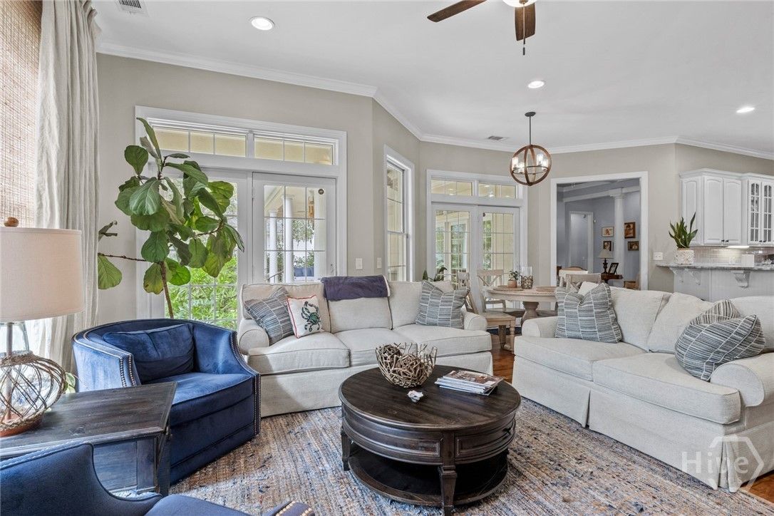 Discover luxury living in the prestigious Landings community on Skidaway Island. This elegant Moon River home is built in 2015 and boasts a thoughtfully designed floor plan, blending sophistication and comfort. The main floor features soaring ceilings, four spacious bedrooms, a grand living room, a formal dining room, cozy family room, all centered around a stunning open kitchen. Upstairs, features a large media room, alongside an additional room ideal as a fifth bedroom, office, or flex space. Situated on a large and gracious lagoon front lot. Oversized three-car side entry garage accommodates ample storage. The Landings community offers an array of world-class amenities, including six private championship golf courses, two deep-water marinas, five pools, and extensive outdoor spaces. Residents can enjoy clubhouses, restaurants, tennis courts, a fitness center, and a vibrant social scene—membership is required.