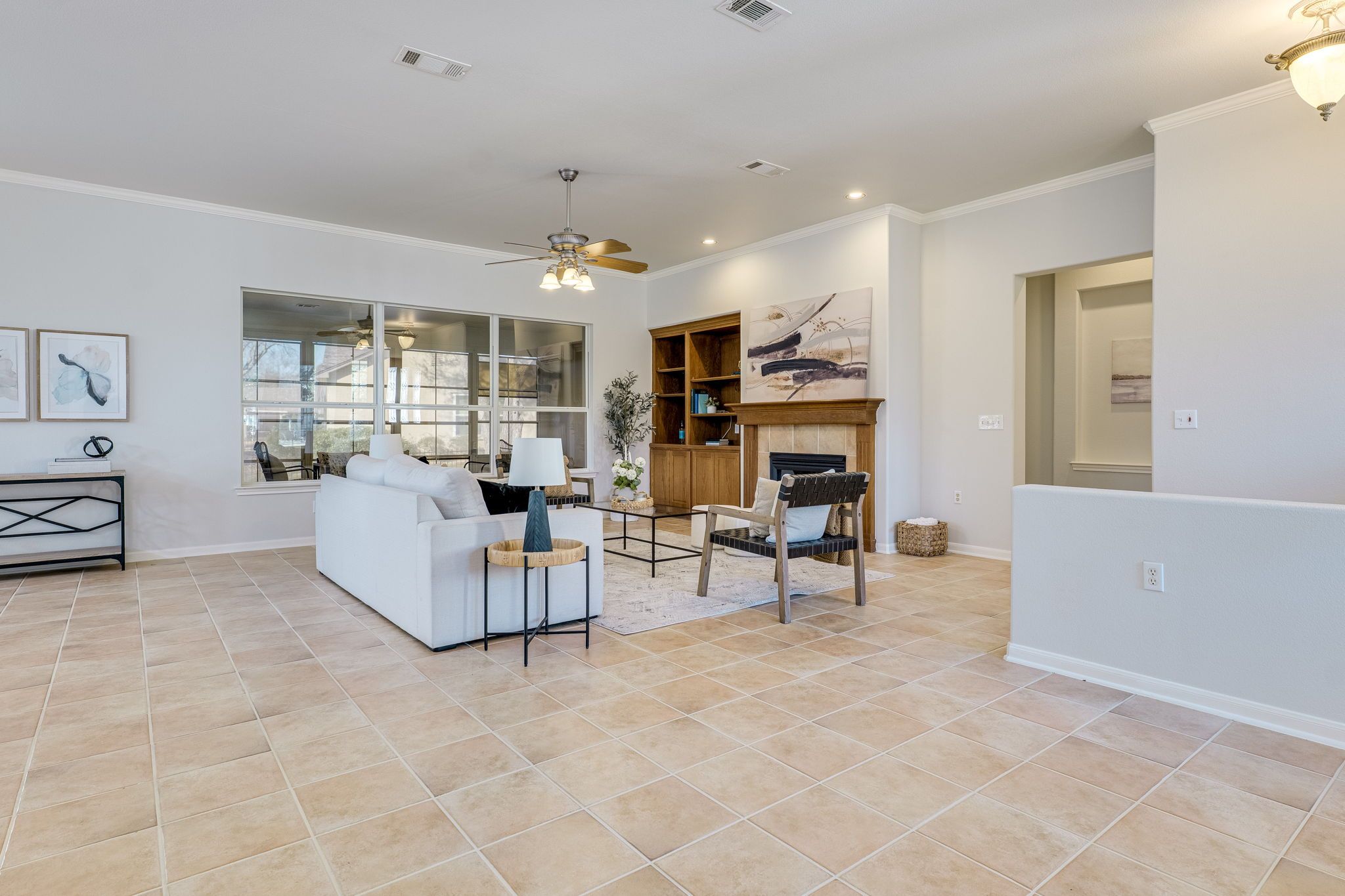 Welcome to 107 Wild Rose Dr., a beautifully maintained home in the heart of Sun City Texas. This highly sought-after Del Webb–built Sabine floorplan offers timeless quality and thoughtful updates at one of the lowest tax rates in Sun City. Recent improvements include fresh interior paint, several replaced windows, and new flooring in the versatile flex room, enhancing both style and function. From the moment you arrive, you’re greeted by mature trees and a xeriscaped front yard, providing curb appeal with low-maintenance living. The classic stone exterior and inviting front porch set a warm tone. Inside, the open kitchen, dining, and living areas are ideal for everyday living and entertaining, featuring 9-foot ceilings, rounded corners, elegant molding, and a cozy gas fireplace flanked by custom built-ins. Transom windows fill the space with natural light. The enclosed extended patio—whose 255+square footage is not included in the county tax assessment—adds flexible living space and is equipped with a mini-split system for year-round comfort and fresh new flooring. The primary suite is a private retreat with an upgraded bath featuring a large walk-in shower and generous closet. Bedrooms feature remote-controlled fan lights. The flex space—between the primary bedroom and back patio—increases the home’s square footage to approximately 2,025 and offers endless possibilities including office, craft, or indoor-outdoor living. The oversized laundry room just off the garage includes a built-in desk and shelving for office or craft space. The oversized garage features an epoxy floor, water softener and storage shelving. Enjoy a large, beautifully fenced backyard—perfect for peaceful evenings or entertaining—with a covered patio and easy flow for indoor-outdoor gatherings. This home reflects exceptional pride of ownership and offers a wonderful opportunity to own a thoughtfully updated classic in one of Sun City’s most desirable neighborhoods.