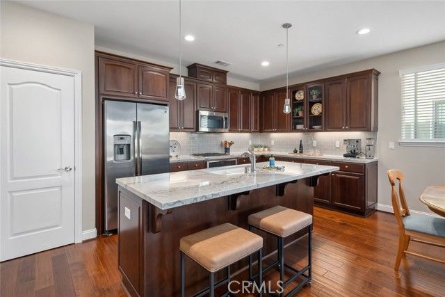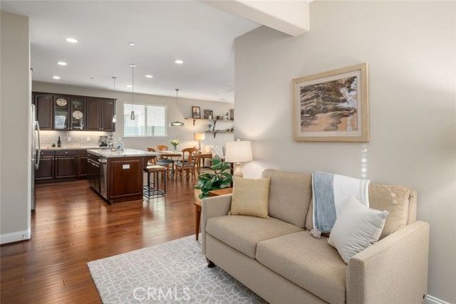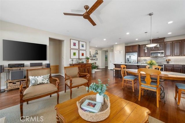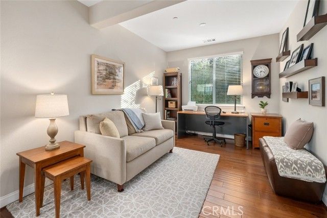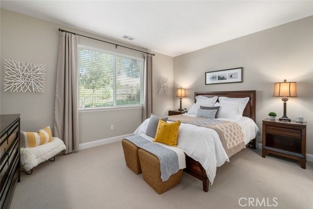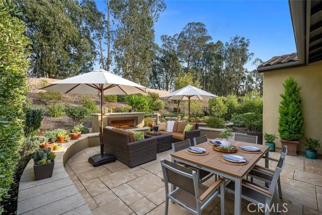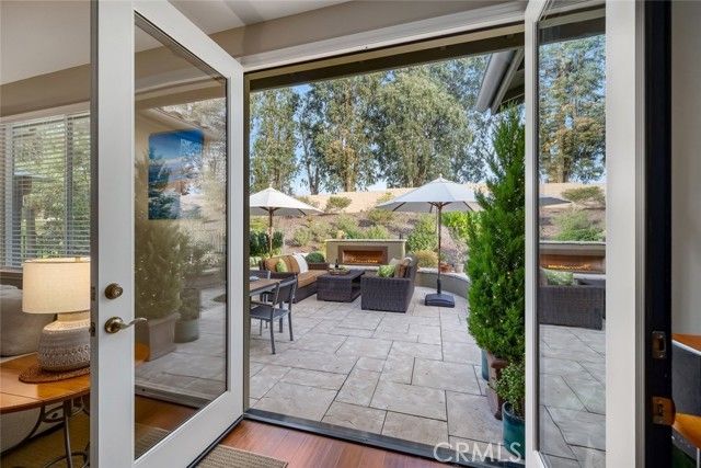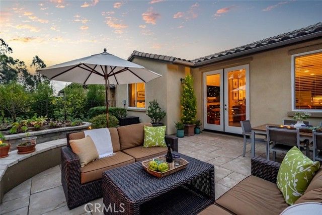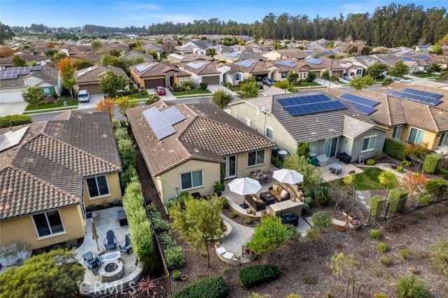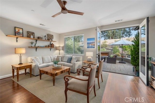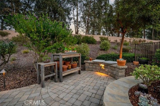 Nestled against a peaceful greenbelt, this residence immediately captivates with its warmth, beauty, and sophistication. Step inside and rich hardwood floors lead you toward the heart of the home — an impressive chef’s kitchen. Warm cabinetry with soft-close and roll-out drawers pairs with a striking quartzite island, its graceful gray veining creating a refined centerpiece for gathering and entertaining. Stainless steel appliances, custom backsplash and under cabinet lighting complete the space with a polished, modern touch. The kitchen flows seamlessly into the great room, where expansive windows frame serene views and fill the space with natural light. Beyond the French doors, the home reveals its most enchanting feature: a truly luxurious indoor-outdoor living experience. A wide paver patio unfolds like an outdoor great room, anchored by an oversized fireplace that sets the stage for morning coffee, sunset wine, and memorable evenings under the stars. With an inviting sitting and a dining area, the space feels effortlessly expansive, doubling its sense of space. A natural extension of the home that enhances both its livability and its sense of retreat. Follow the paver pathways and the garden begins to unfold like a curated landscape. Raised beds, fruit trees, and vibrant plantings create a setting that feels lush yet remarkably low-maintenance. Quail scuttle, hummingbirds hover over blossoms; birds chatter, and monarch butterflies drift about. It’s a living sanctuary, rich with movement and color. As the sun sets, the surrounding trees take on a bronzed glow, casting a warm, golden light across the yard. A home where every detail has been thoughtfully designed: fresh paint, upgraded bathrooms with double vanity and Silestone slab counters, Air Conditioning, upgraded lighting, window treatments, ceiling fan and added storage. A pre-paid solar lease adds exceptional value — the homeowner has enjoyed zero electric bills and annual credits. More than a home, this is a refined private retreat that invites you to savor the beauty of the Central Coast both inside and out.