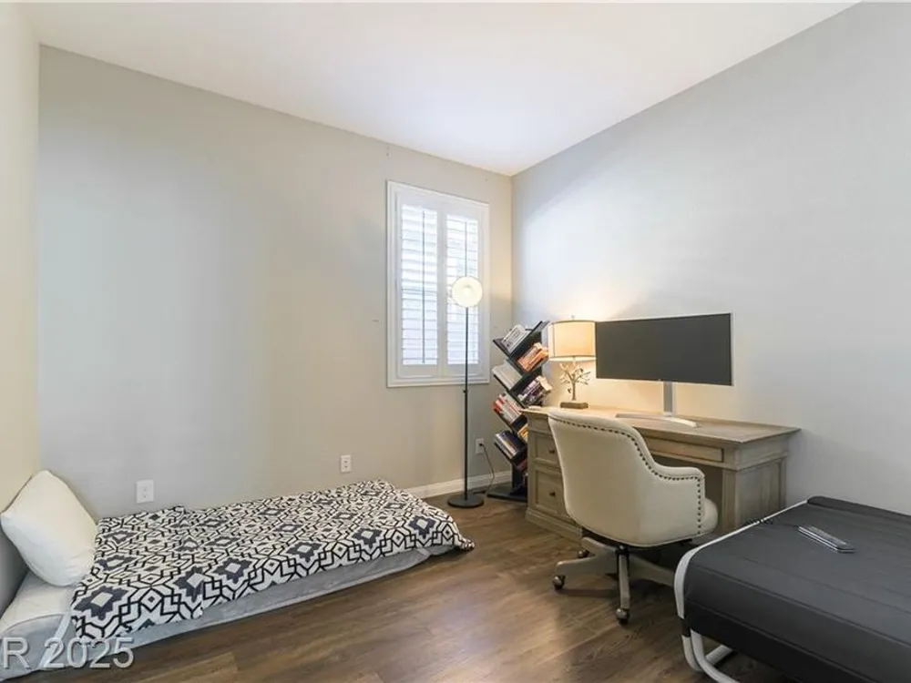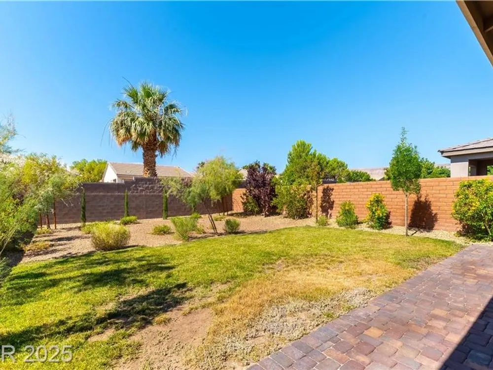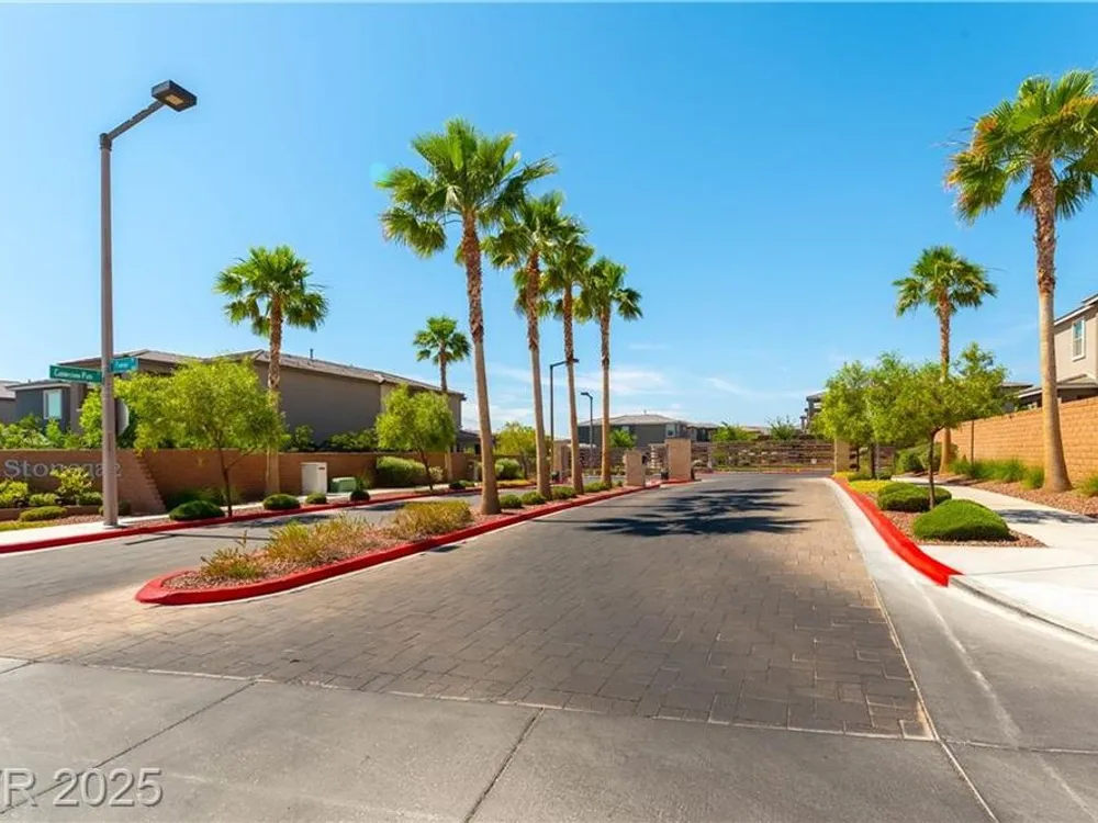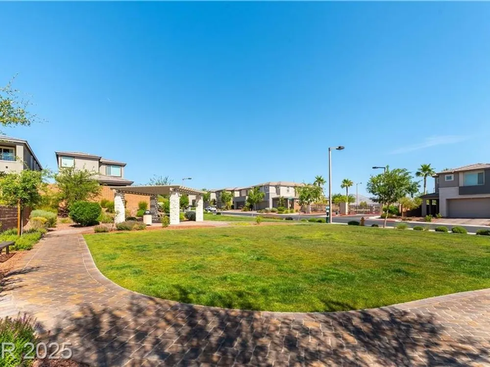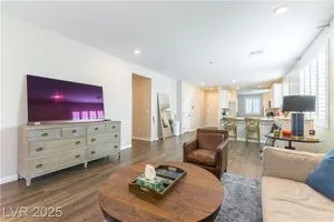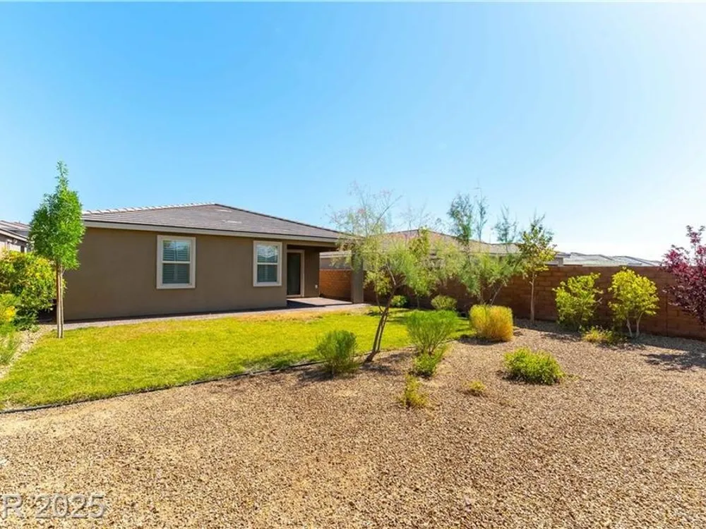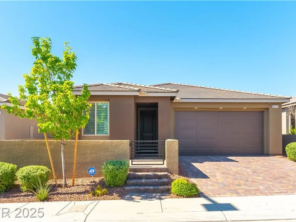 Discover this rare single-story gem in the peaceful, highly sought-after Stonegate community in the heart of Summerlin.Built in 2021, this modern home seamlessly blends style, comfort, and efficiency. Enjoy open-concept living with a gourmet kitchen featuring quartz countertops, stainless steel appliances, and elegant shutters throughout. Additional highlights include water-resistant flooring, a dedicated office with fiber internet, and energy-efficient upgrades such as a tankless water heater and thermal windows. Step outside to a private backyard with covered patios—perfect for outdoor relaxation. A finished two-car garage with epoxy flooring completes the package. Just minutes from premier shopping and dining, this move-in-ready home is a must-see!
