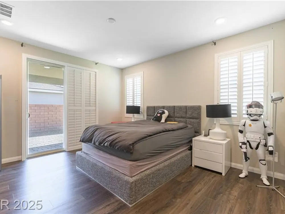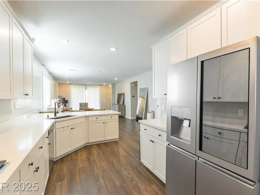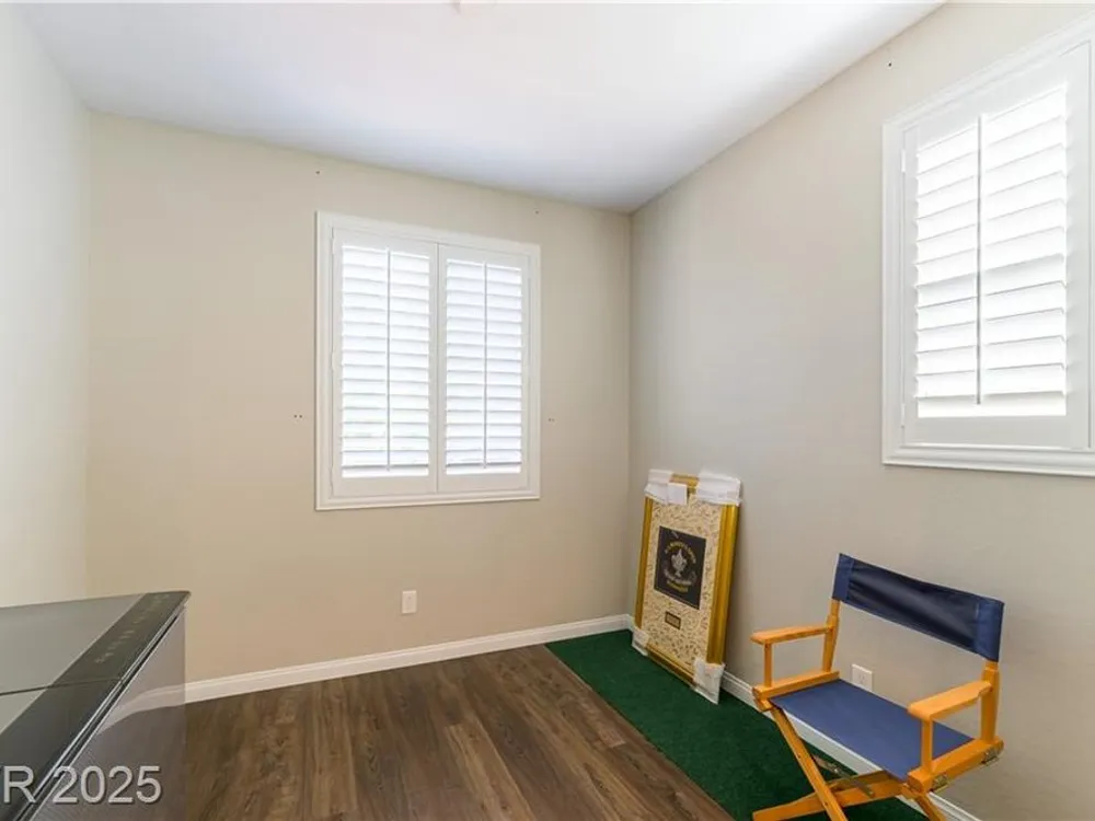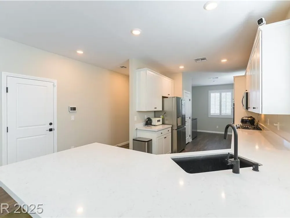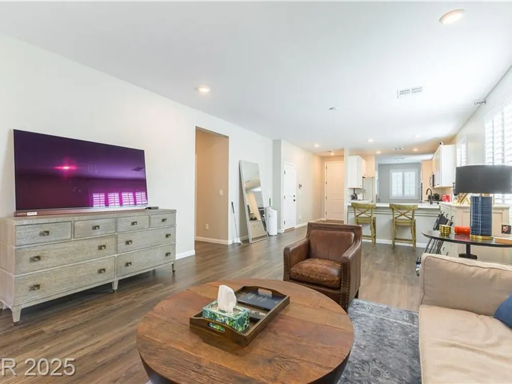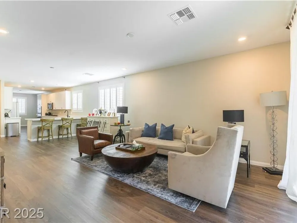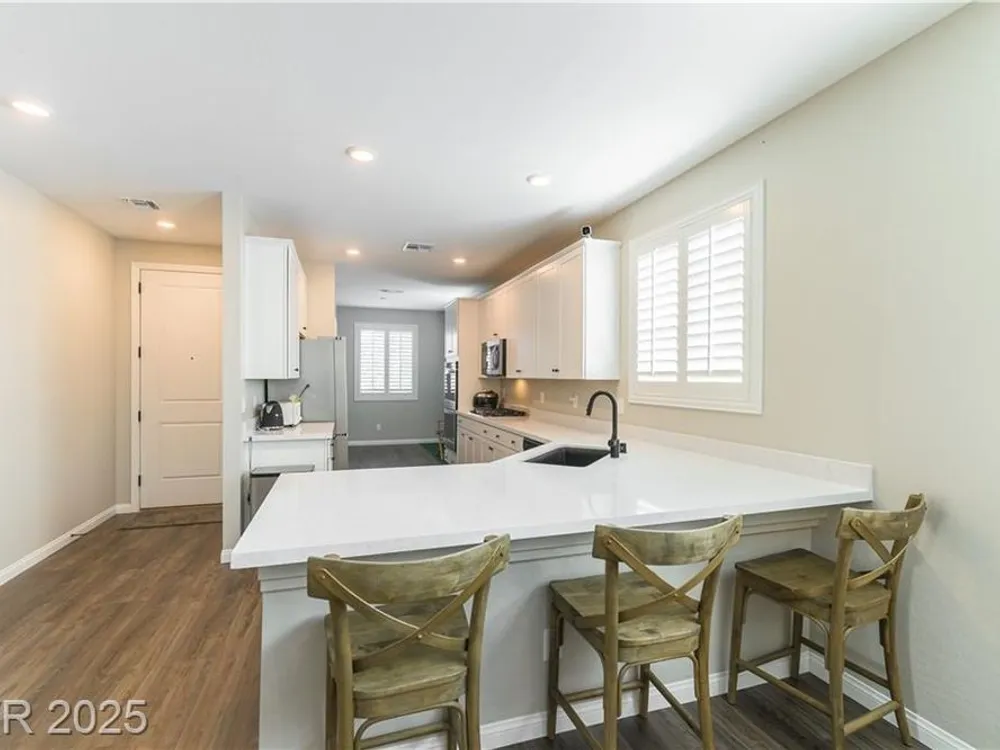 Discover this rare single-story gem in the peaceful, highly sought-after Stonegate community in the heart of Summerlin.Built in 2021, this modern home seamlessly blends style, comfort, and efficiency. Enjoy open-concept living with a gourmet kitchen featuring quartz countertops, stainless steel appliances, and elegant shutters throughout. Additional highlights include water-resistant flooring, a dedicated office with fiber internet, and energy-efficient upgrades such as a tankless water heater and thermal windows. Step outside to a private backyard with covered patios—perfect for outdoor relaxation. A finished two-car garage with epoxy flooring completes the package. Just minutes from premier shopping and dining, this move-in-ready home is a must-see!